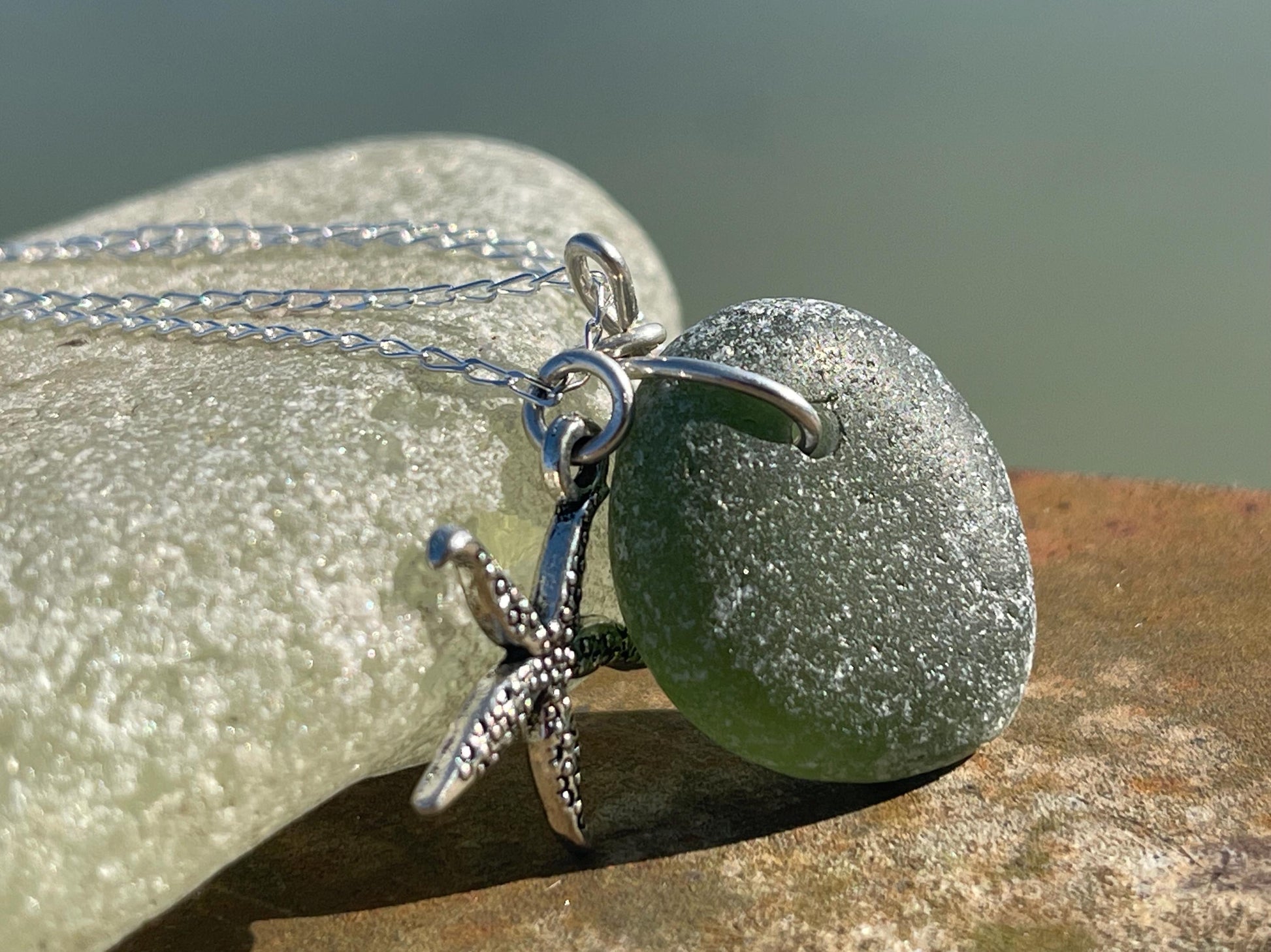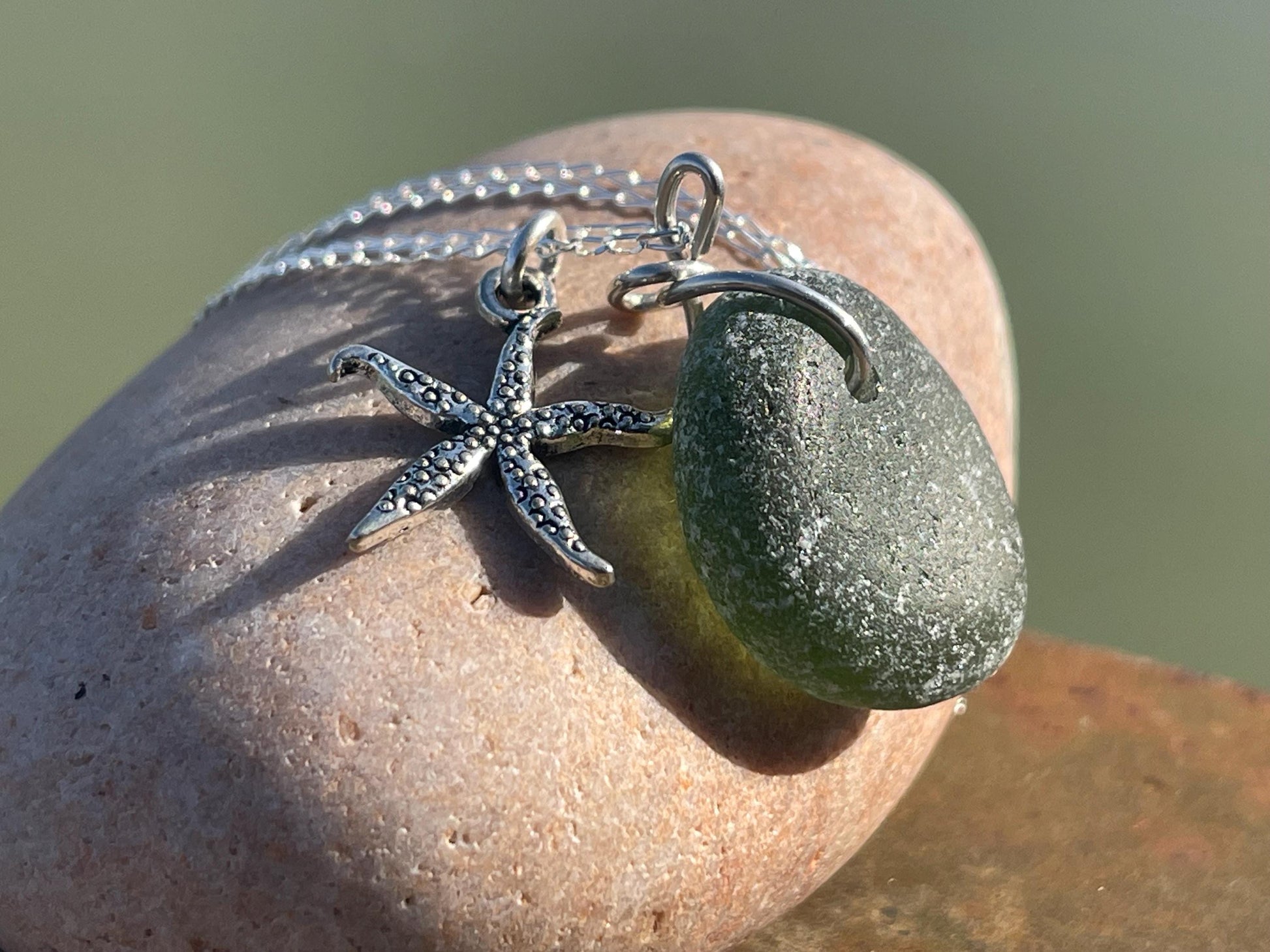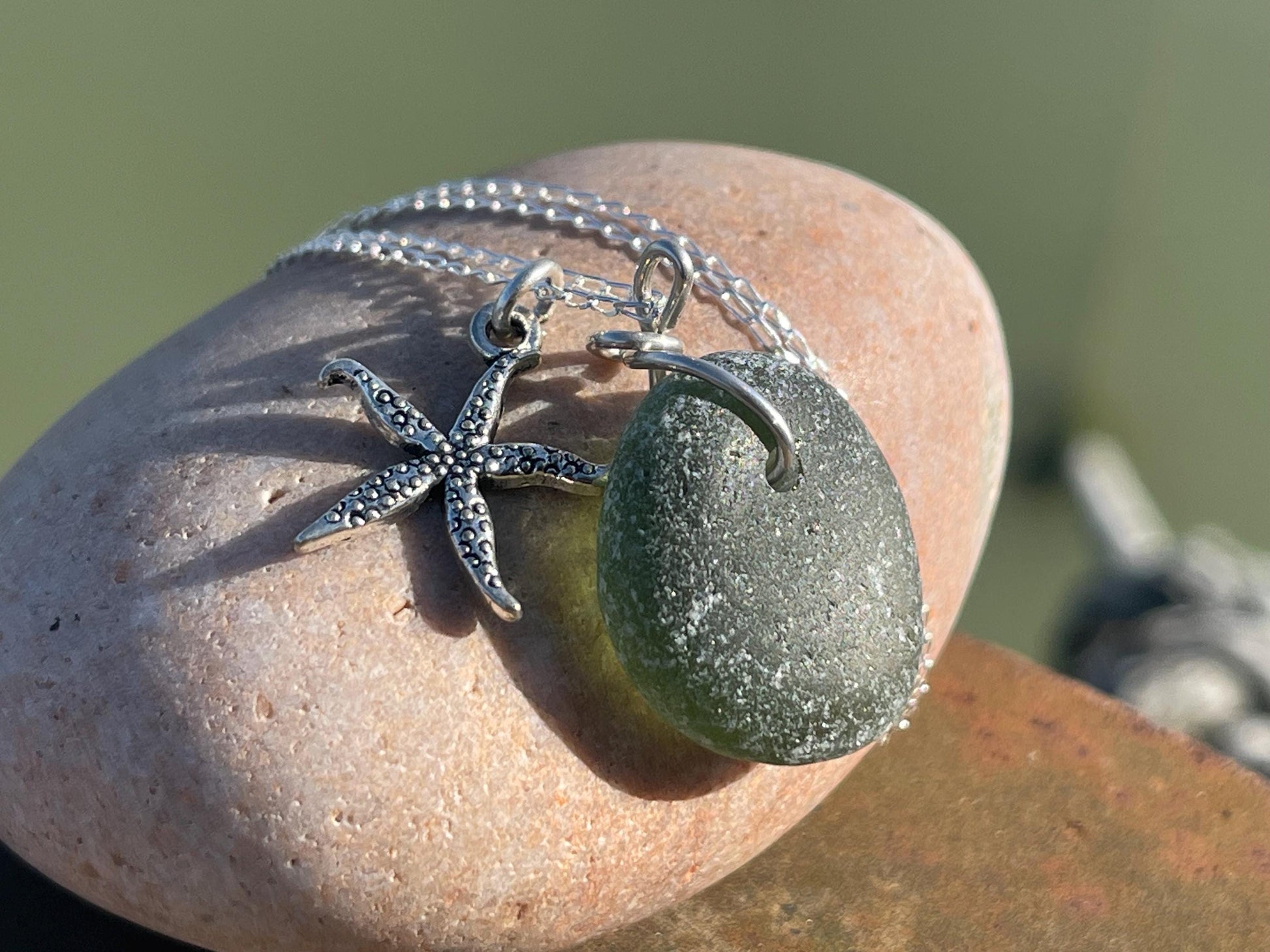 Eco friendly sea glass necklace on a sterling silver chain showcasing a little starfish. Starfish pendant, eco friendly jewellery. Boho