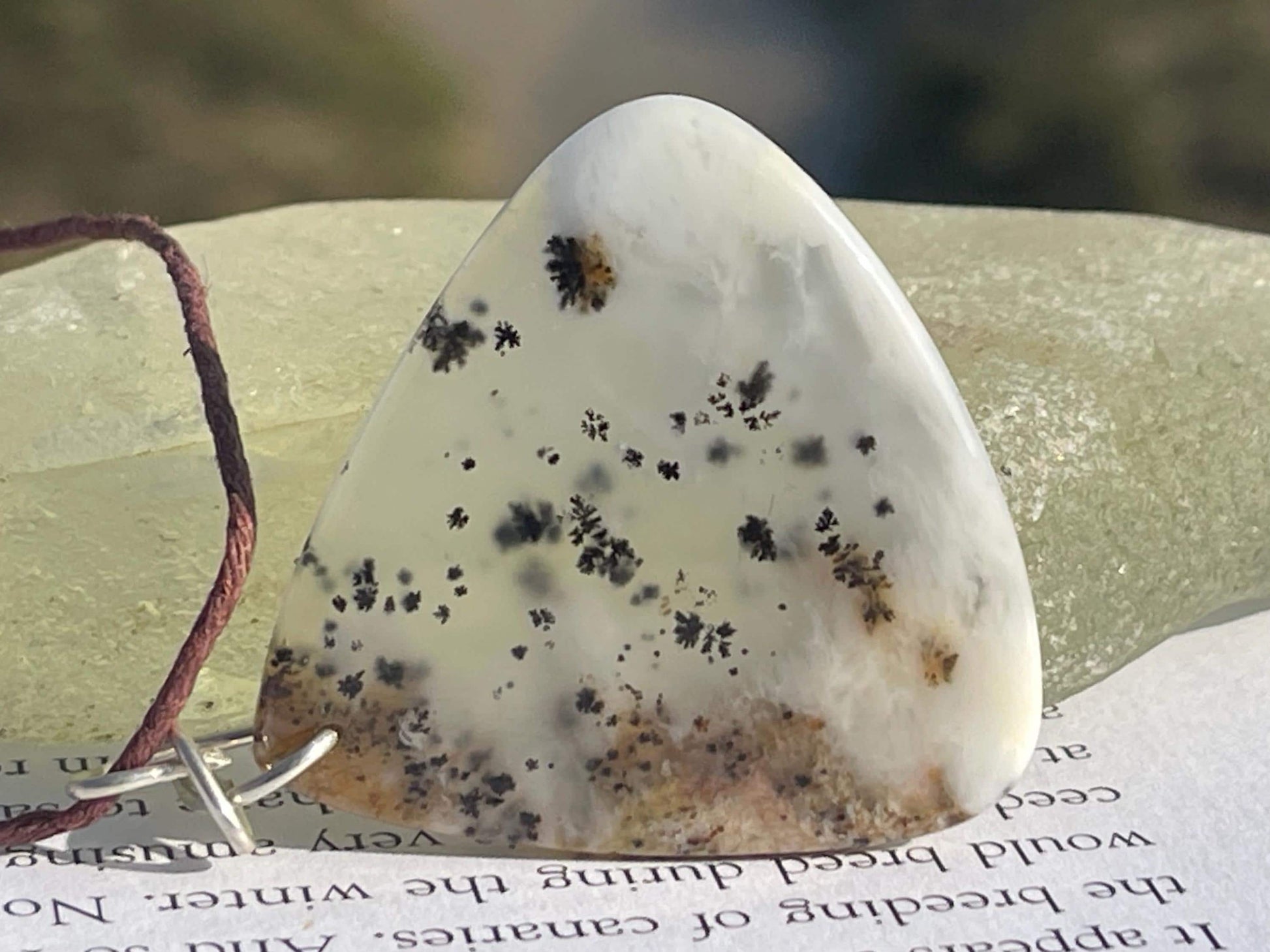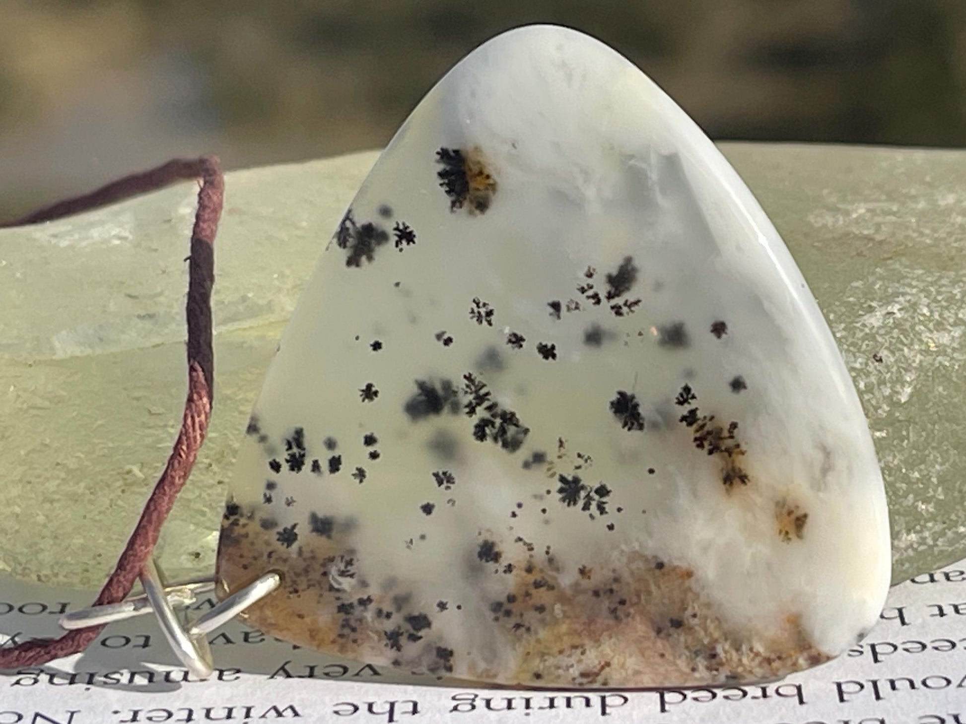 This is a beautiful ethically sourced moss agate gemstone necklace. It is hosted on a little silver plated seahorse and hemp. The hemp has been left loose so you can tie at your preferred length.
