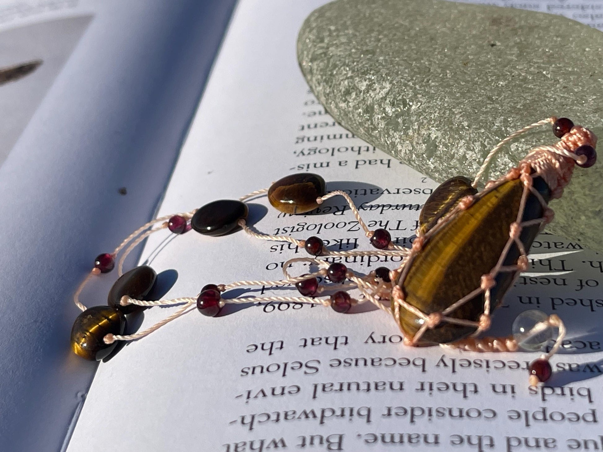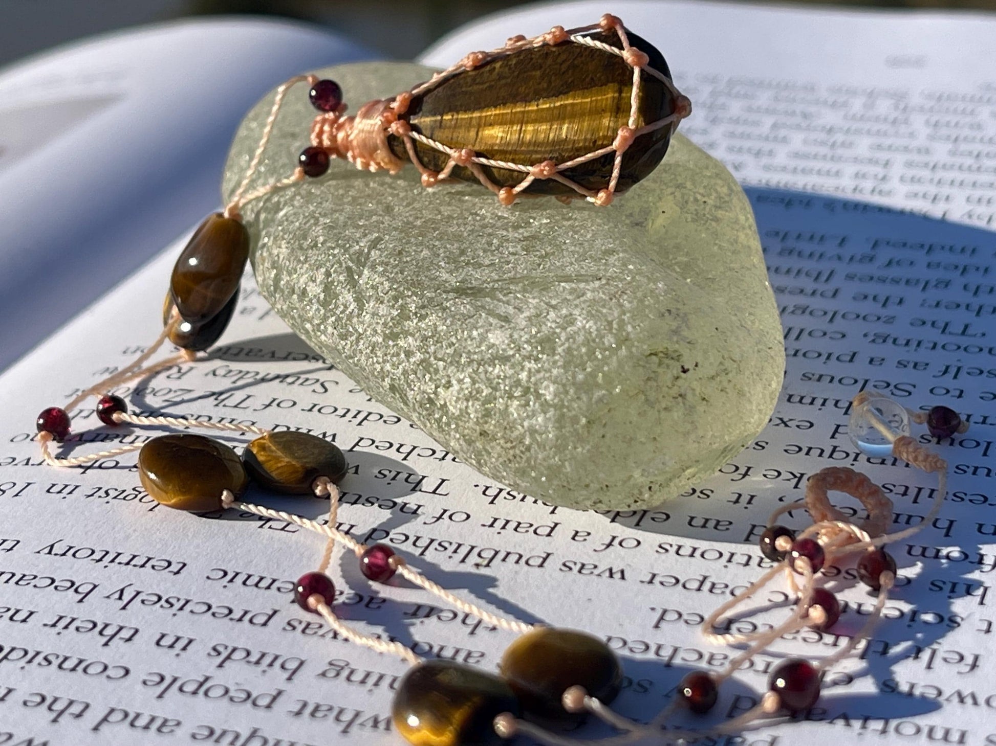 This is a beautiful and unique tigers eye gemstone necklace, macrame wrapped and held on a light cord interspersed with dainty beading.