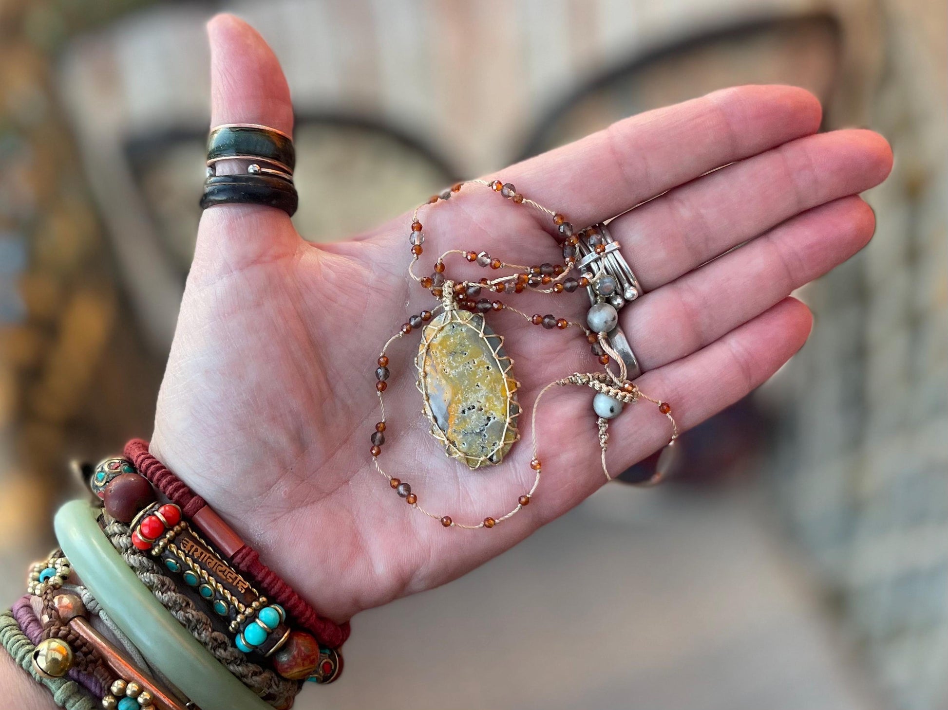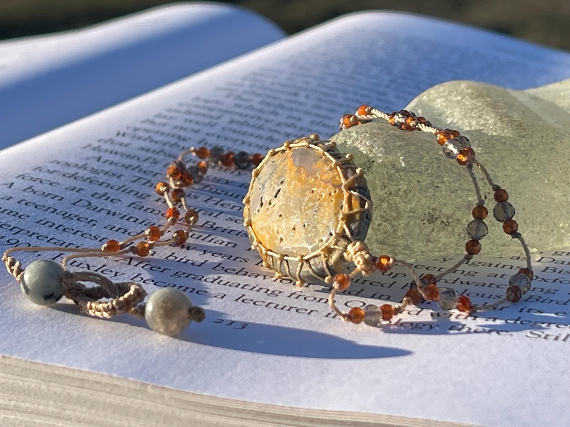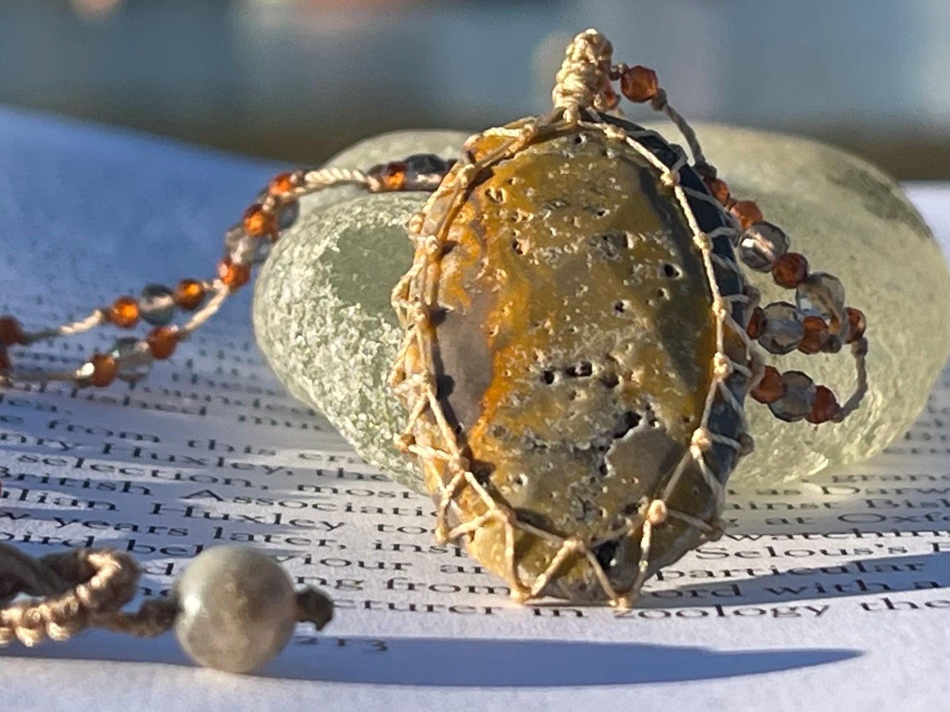 This is a beautiful ethically sourced jasper gemstone, macrame wrapped and held on a light cord interspersed with dainty beading.