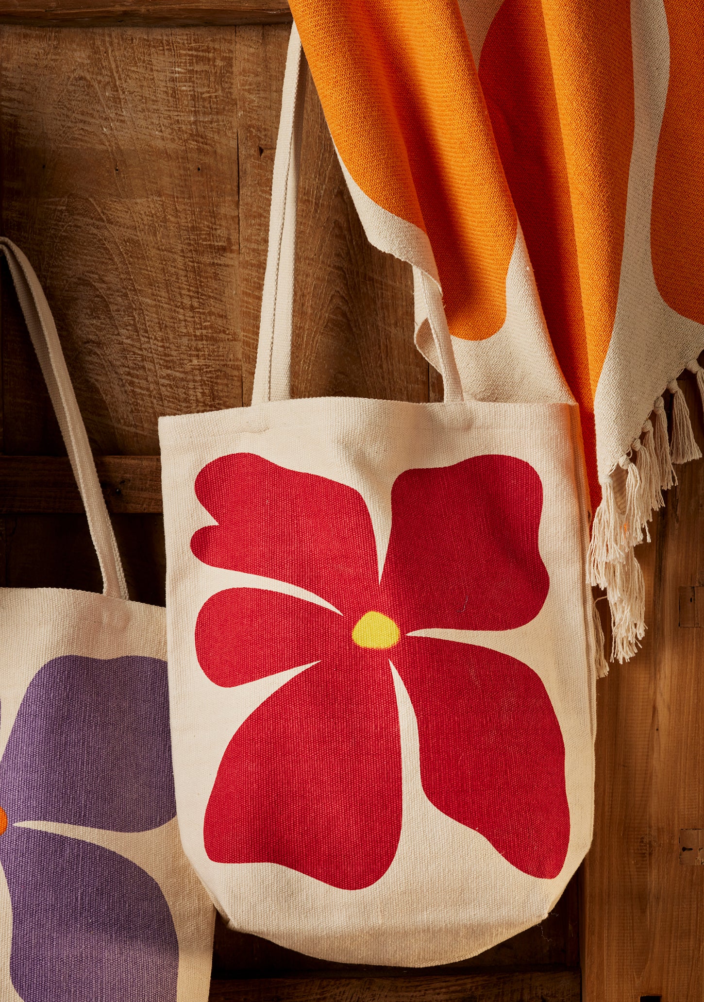 Refresh personal style with this screen-printed, bold flower bag in green, pink, purple, red and orange colourways, made from substantial recycled cotton.