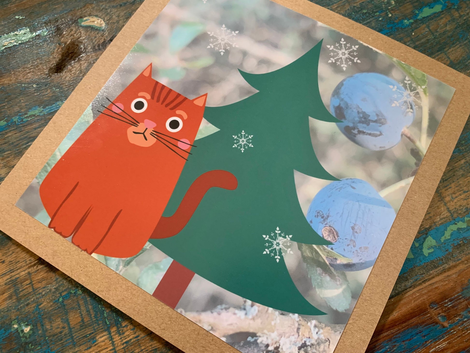 A fun card inspired by my love of animals and our natural environment. The cat is superimposed in front of a picture I took of sloe berries.