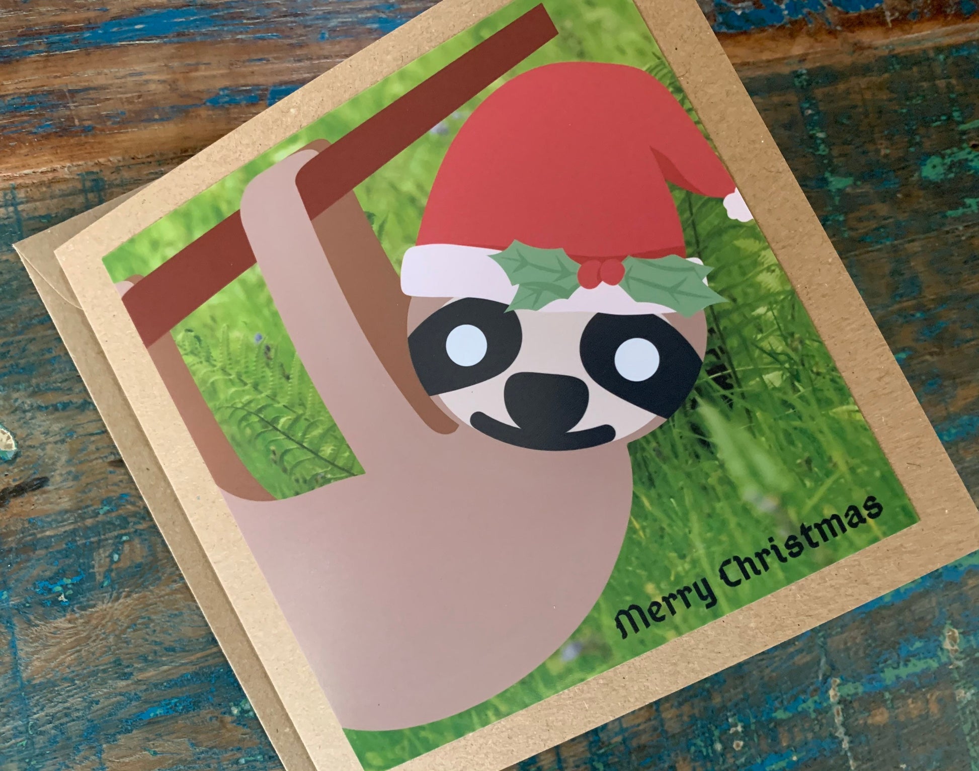 Christmas sloth card, recycled Christmas card, sloth xmas card, homemade Christmas. Eco friendly card. Handmade card, ethical Christmas card