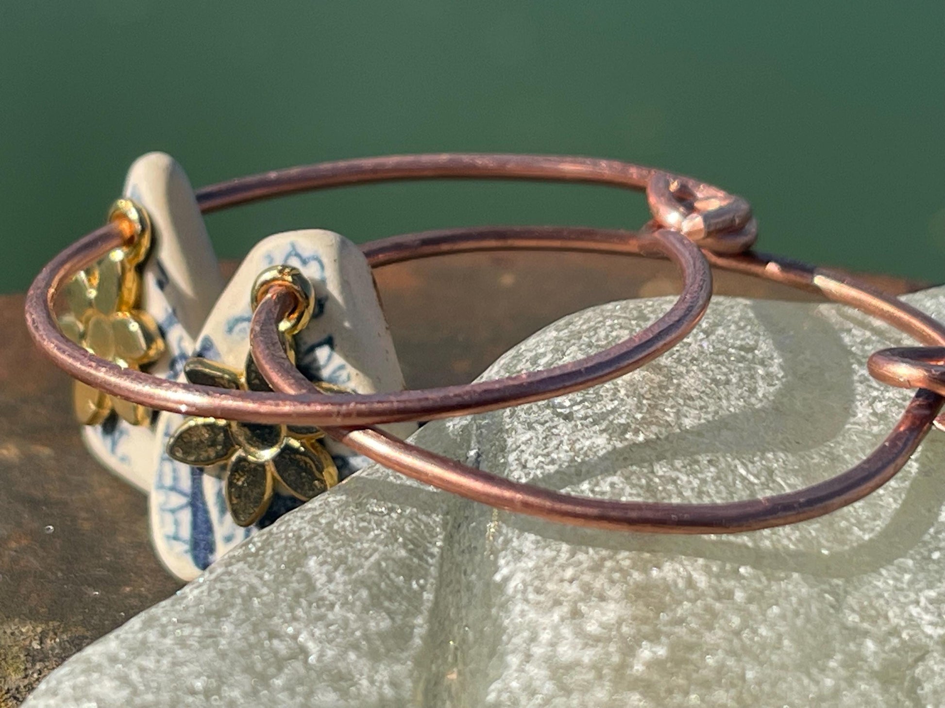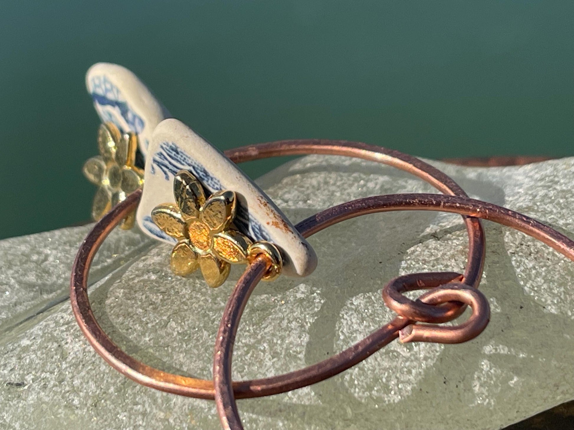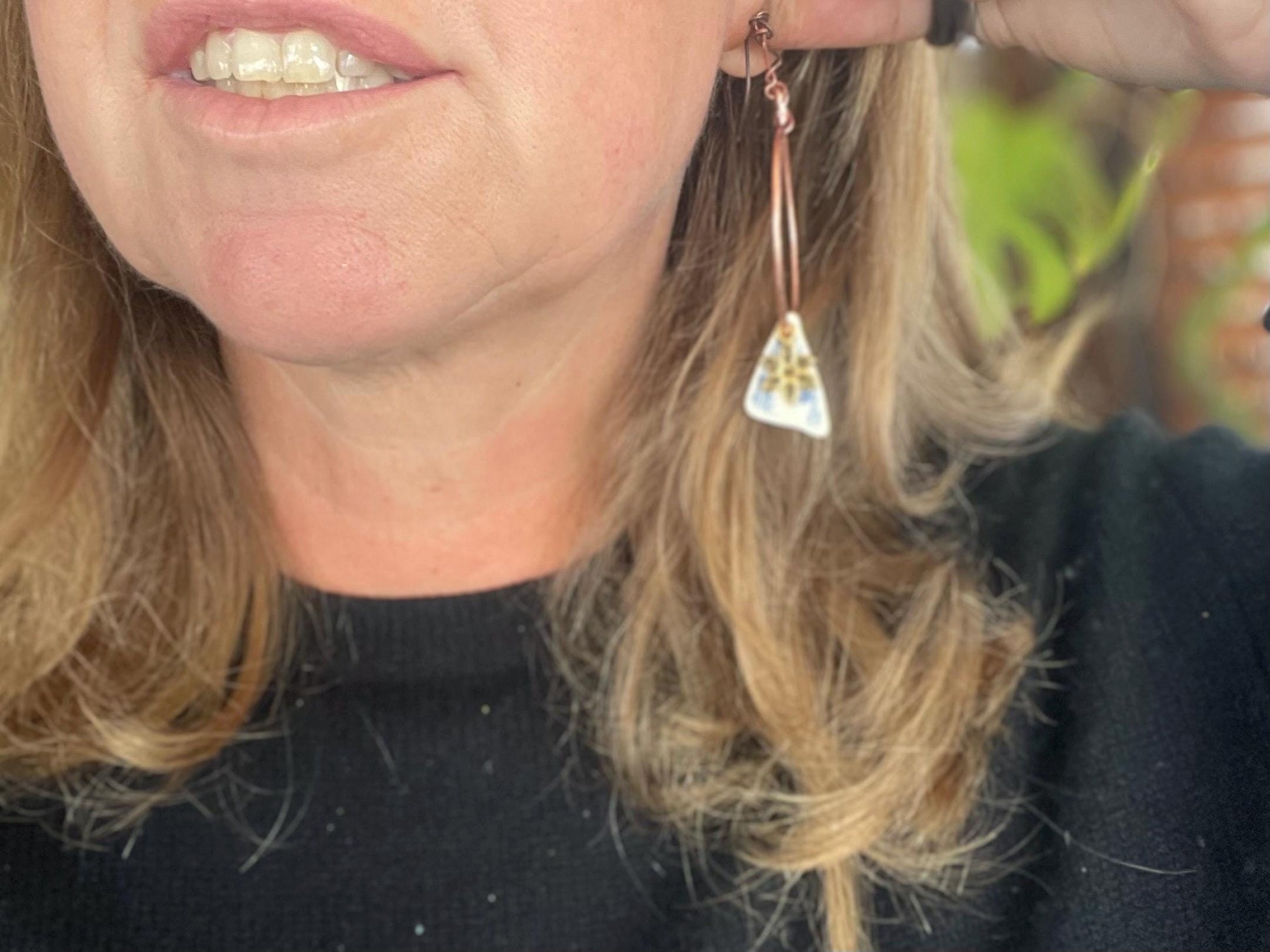 Unique sea ceramic earrings hung on copper stripped from waste electrical cables. The ear hooks are made from hammered brass.