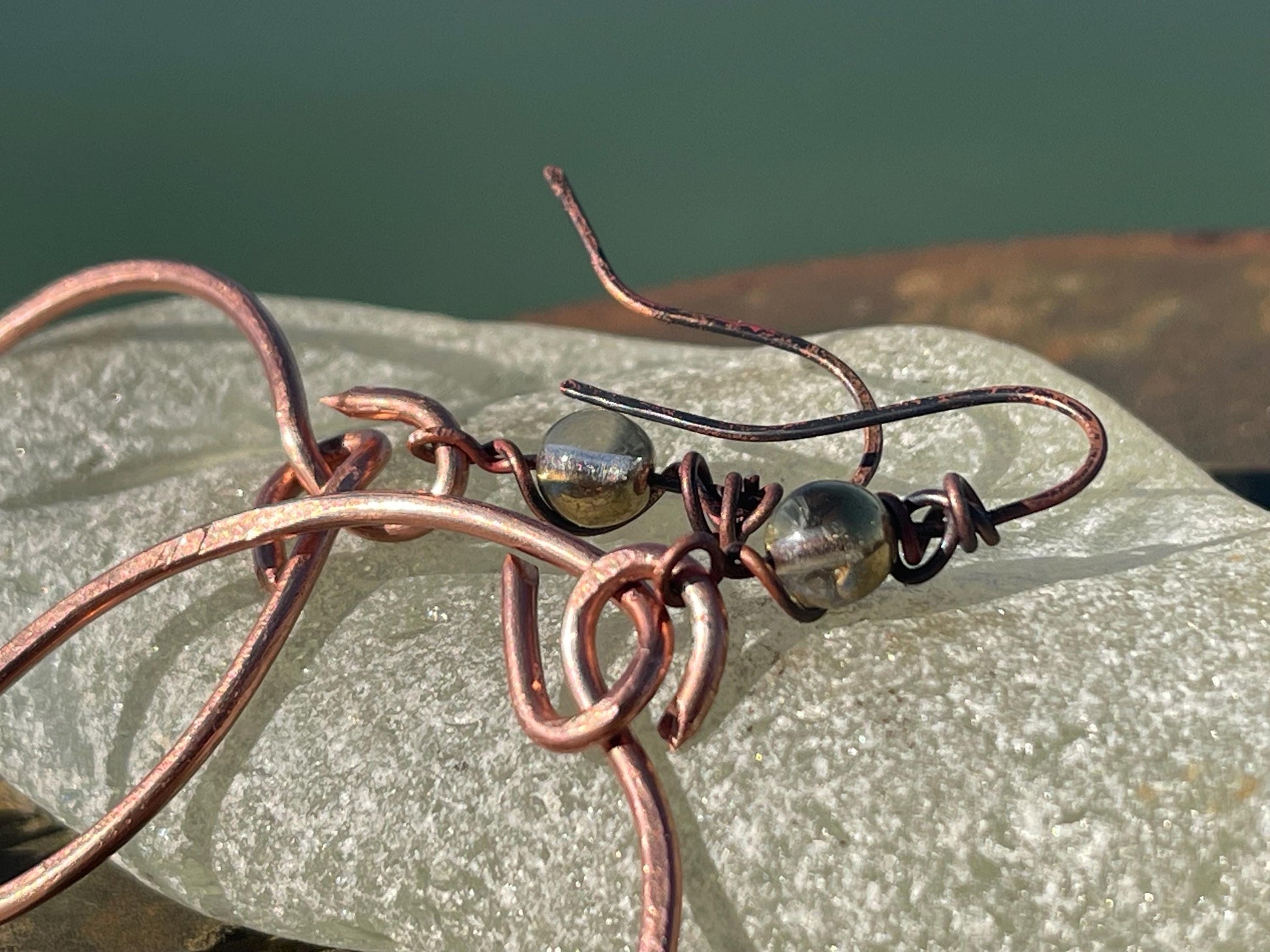 Unique sea glass earrings hung on copper stripped from waste electrical cables. I have also added some up-cycled beading. The ear hooks are made from hammered copper.