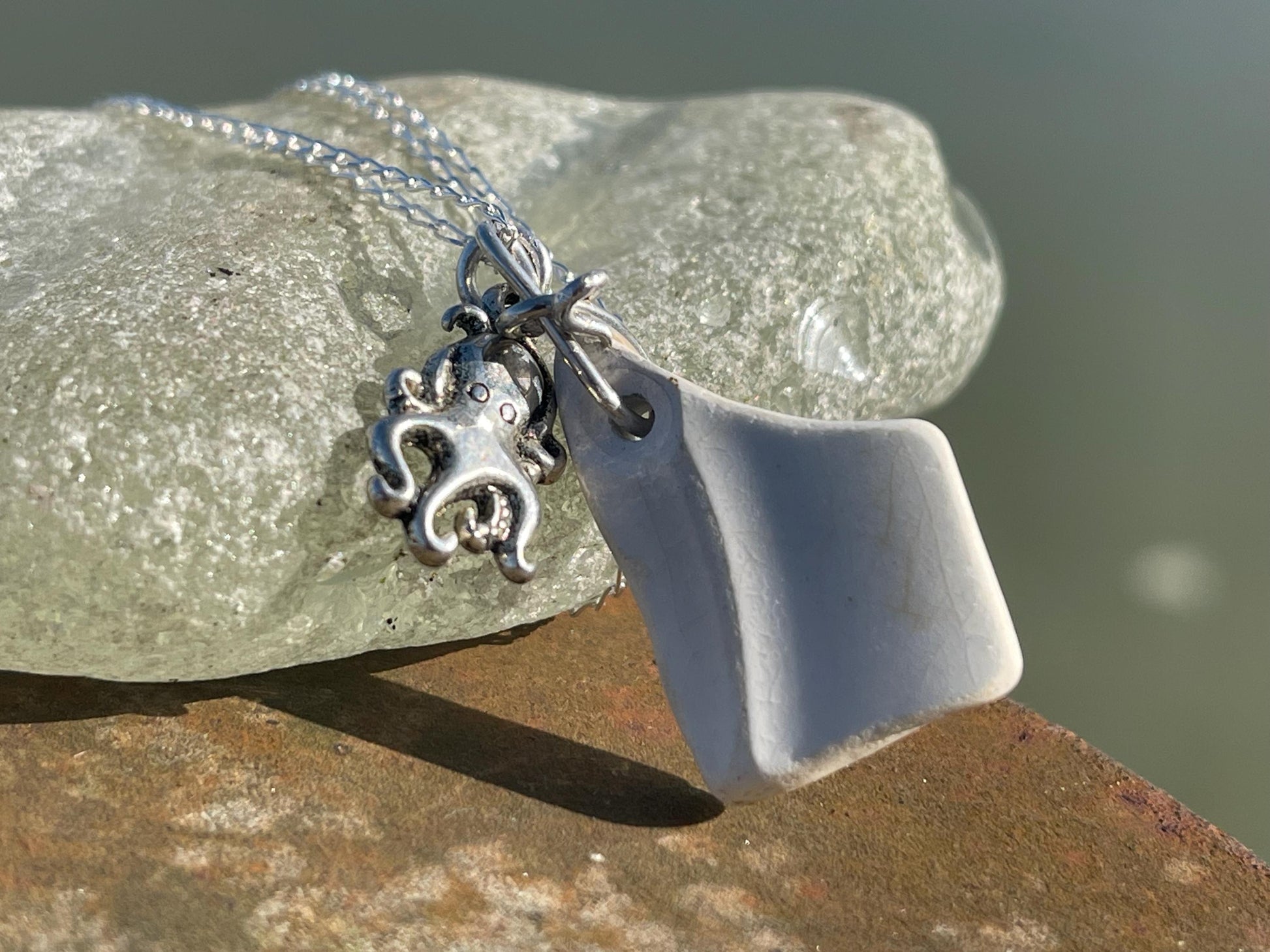 Beautiful recycled sea ceramic necklace. Washed up on the beach in Cornwall, drilled by me and made into something new :) I have also added a cute little octopus.