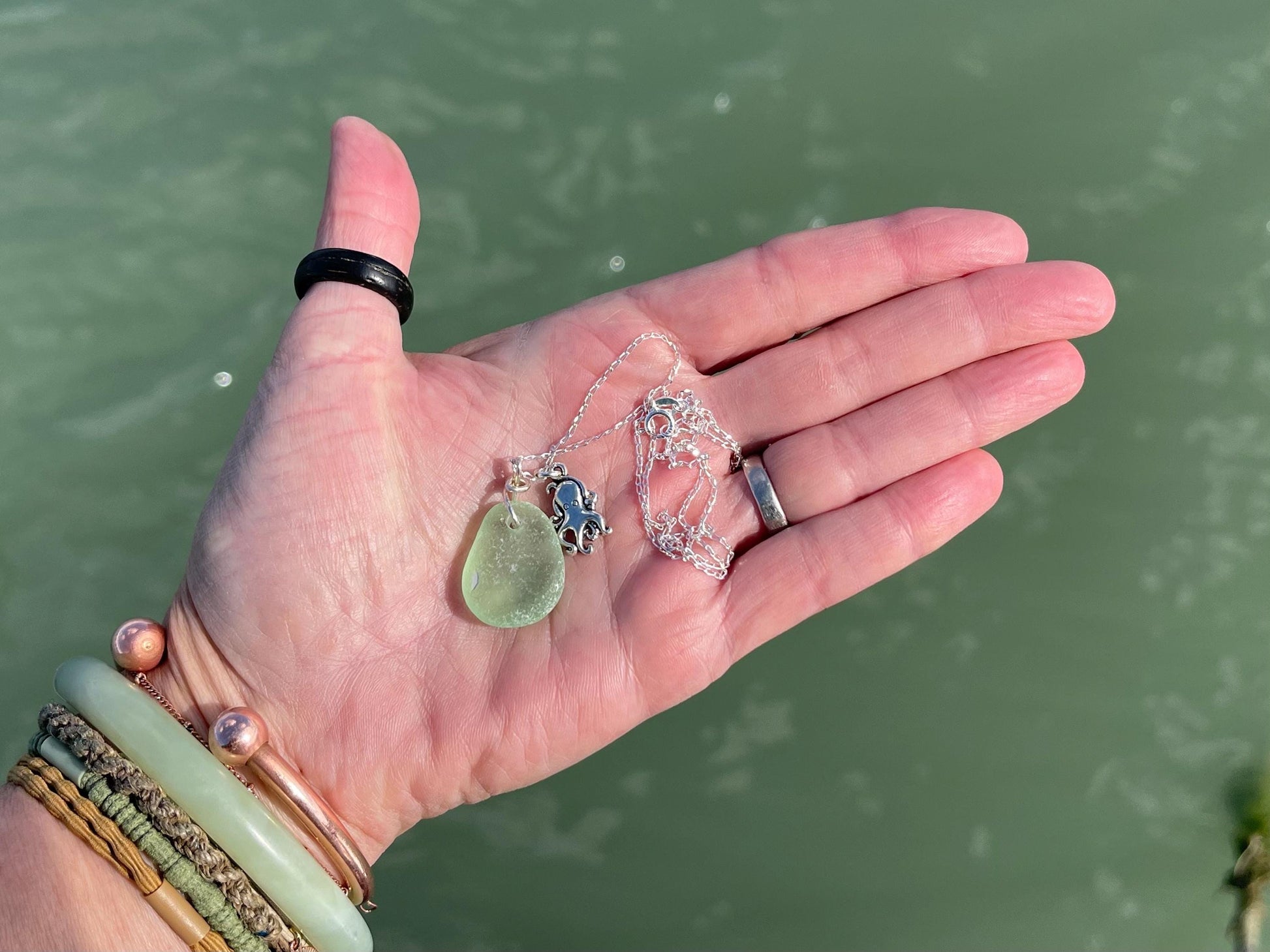 Eco friendly sea glass necklace on a sterling silver chain showcasing a little octopus. Octopus pendant, octopus necklace, eco jewellery