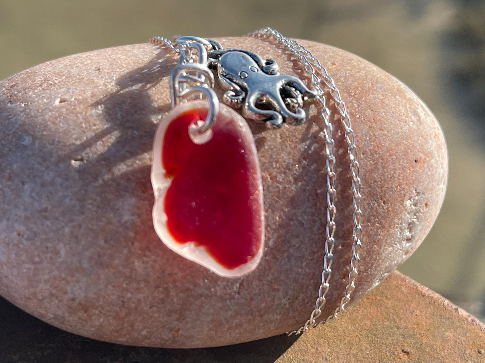 Eco friendly sea glass necklace on a sterling silver chain showcasing a little octopus. Octopus pendant, octopus necklace, ethical jewellery