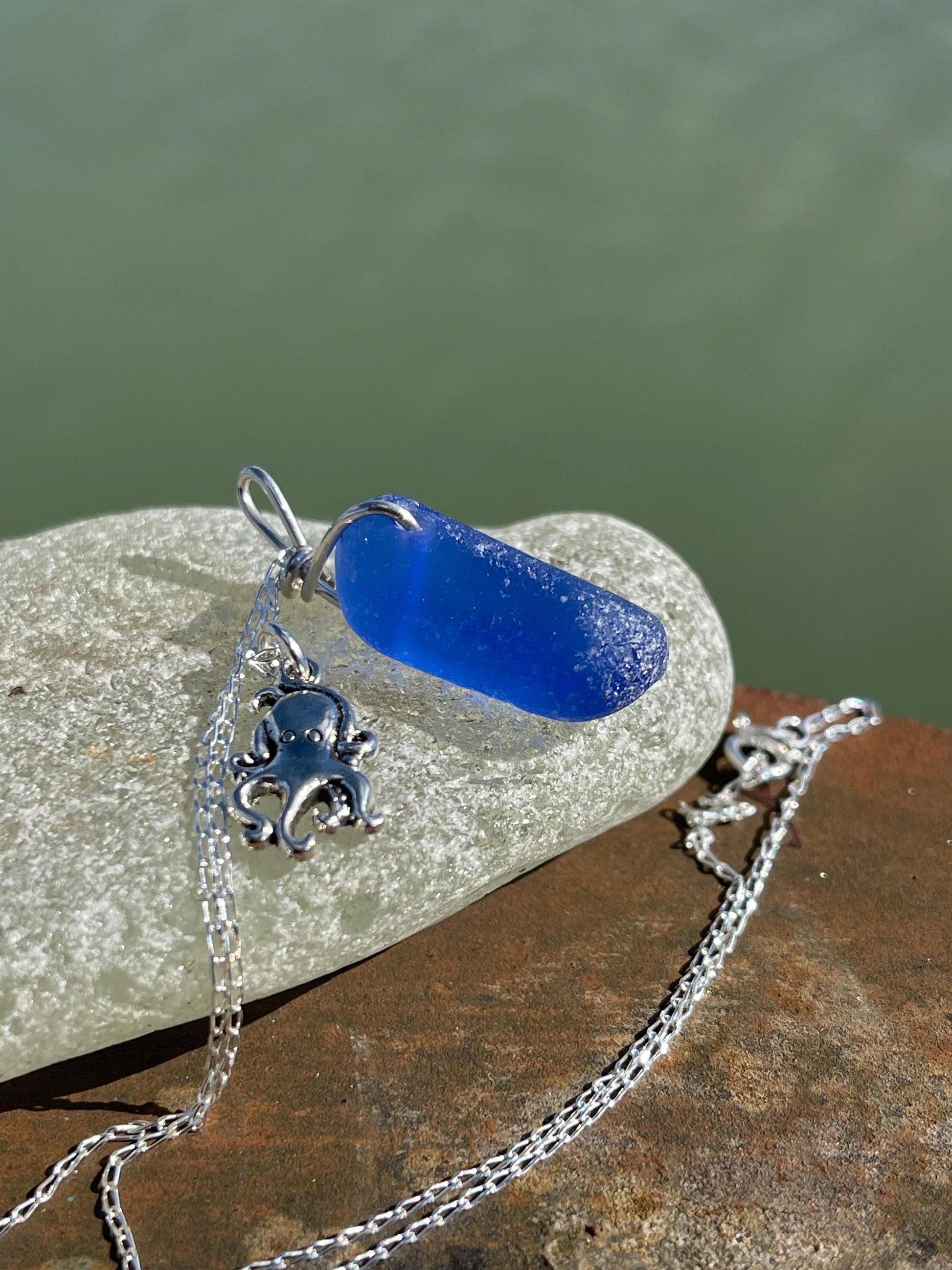 Eco friendly sea glass necklace on a sterling silver chain showcasing a little octopus. Octopus pendant, octopus necklace, ethical jewellery