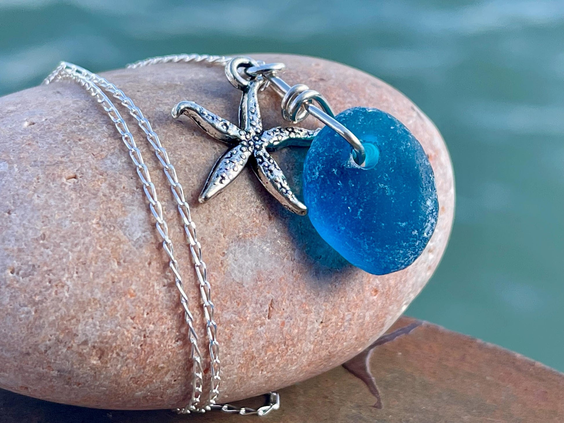 Eco friendly sea glass necklace on a sterling silver chain showcasing a little starfish. Starfish pendant, ethical jewellery. Sea swimming