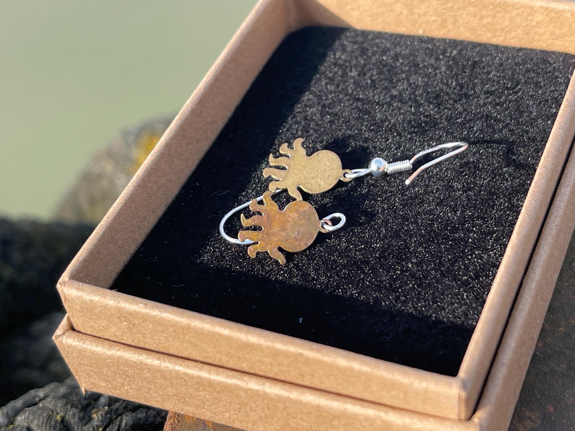 Little rustic octopus that I have naturally patinered to reveal shades of blue. They are hung on sterling silver.