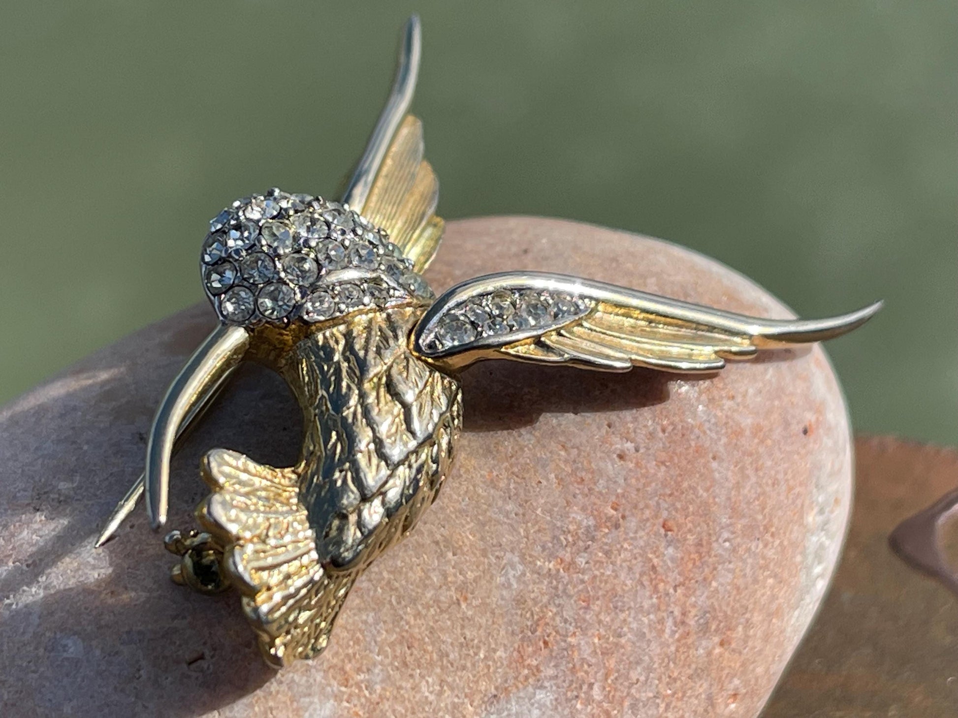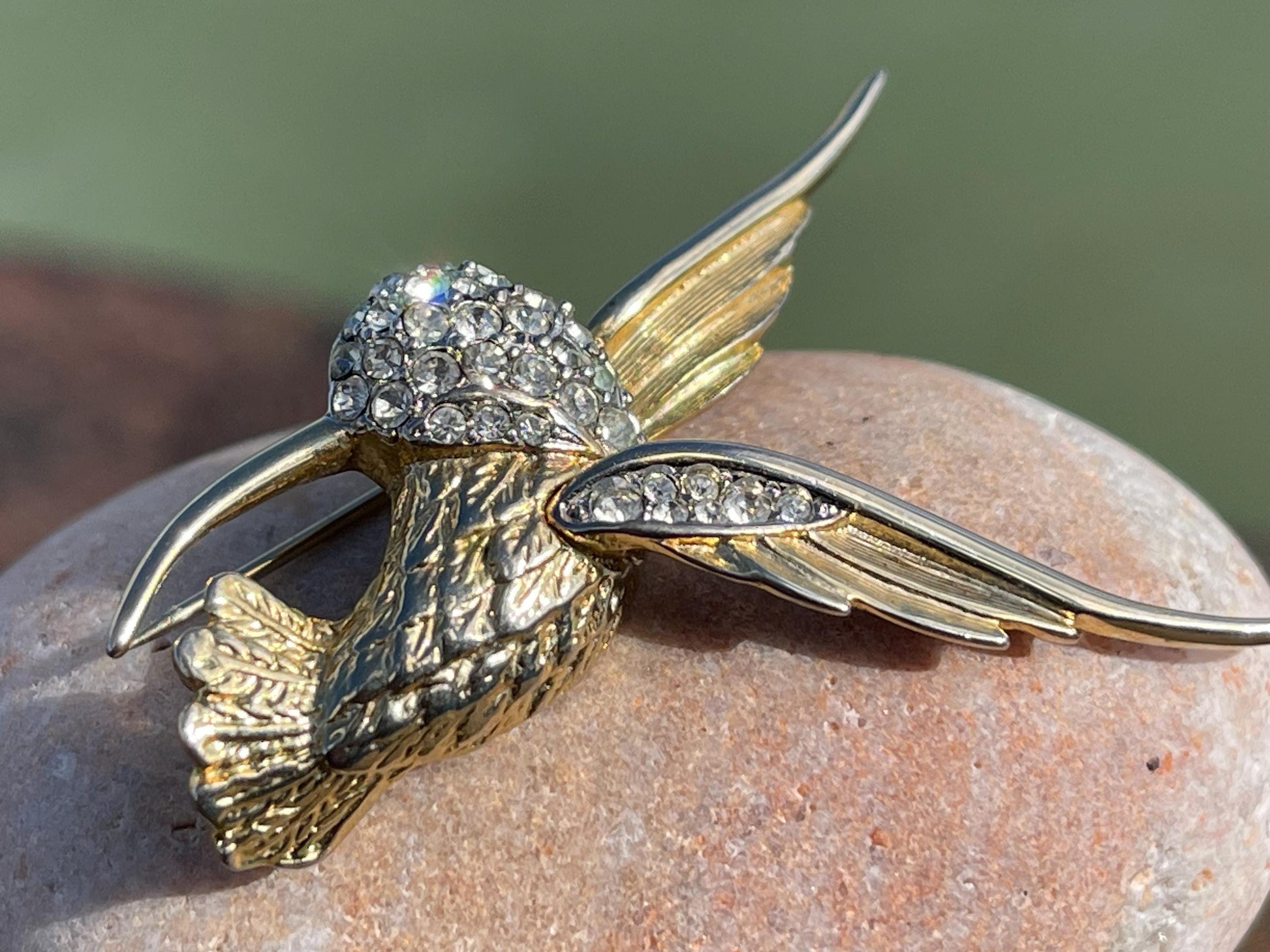 This is a very beautiful pre-loved hummingbird brooch, a restored piece that shines beautifully in the light.