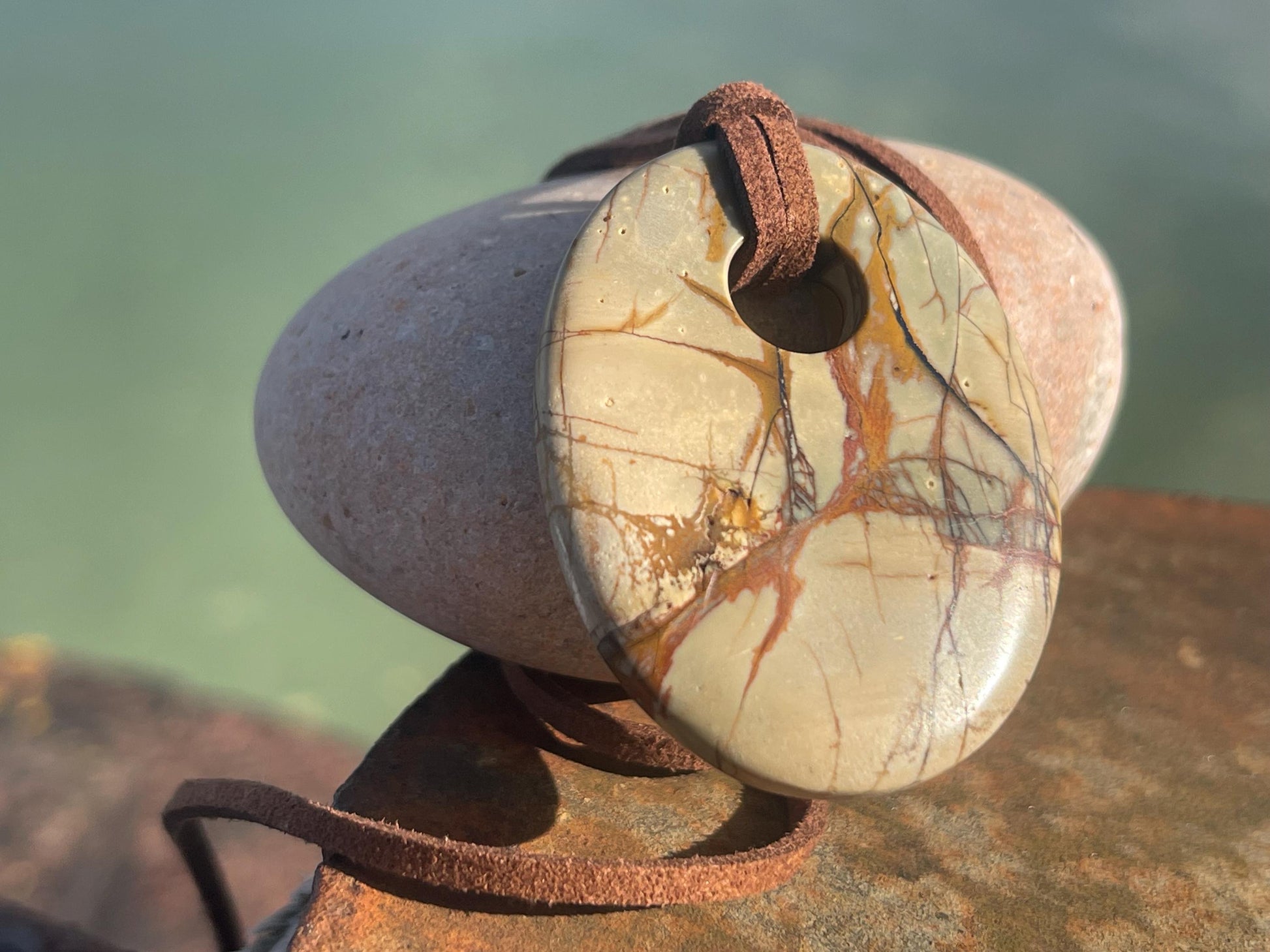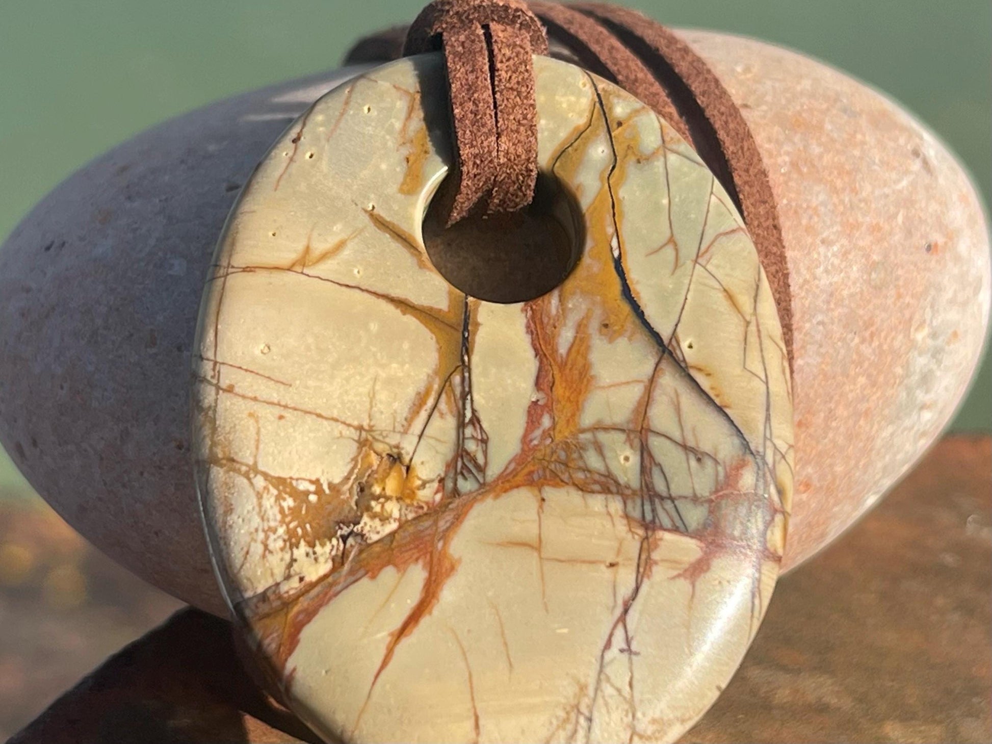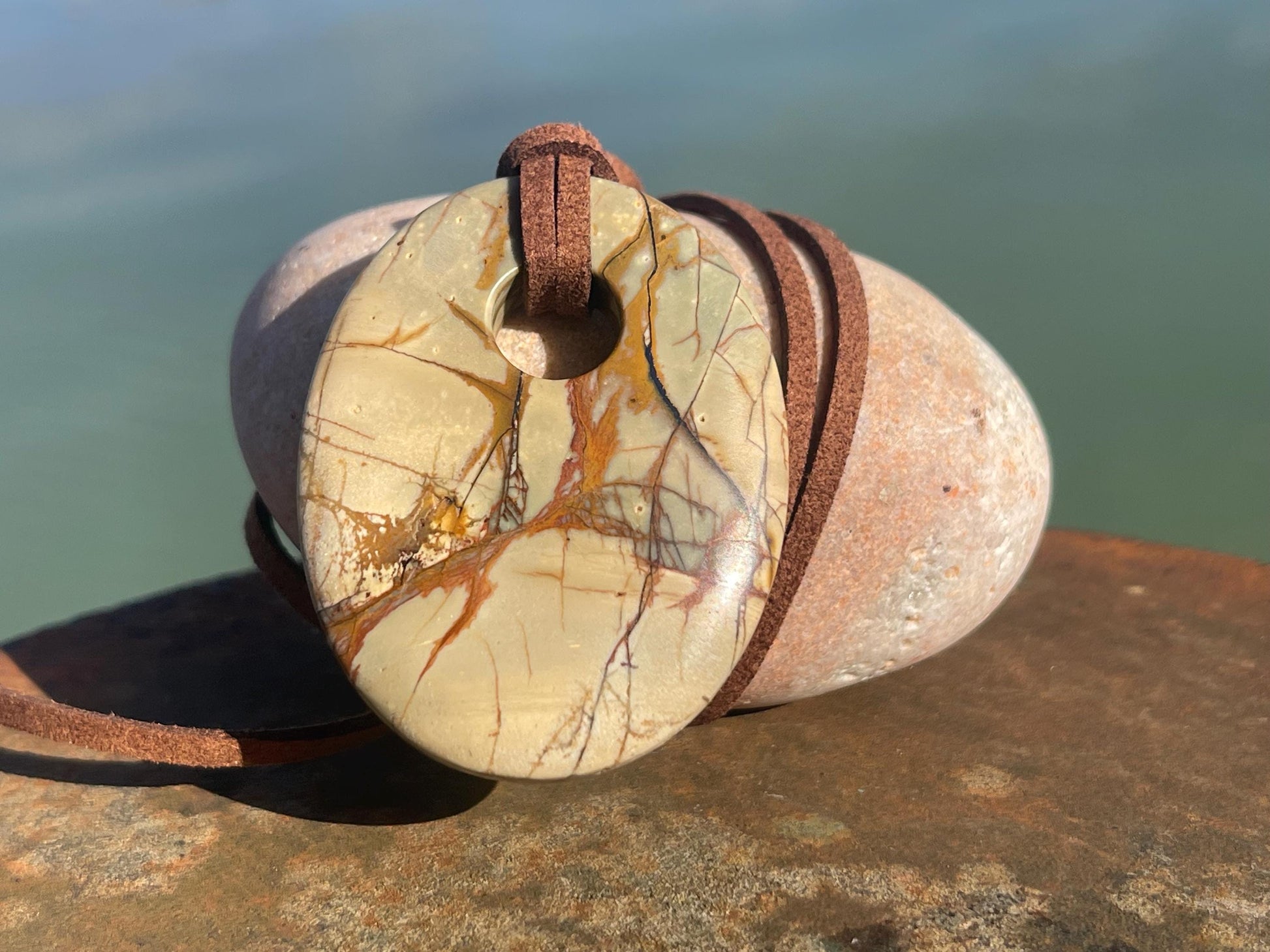 Absolutely stunning ethically sourced Picasso Jasper gemstone, shaped, drilled and hung on soft faux suede (left loose for you to tie at your preferred length).