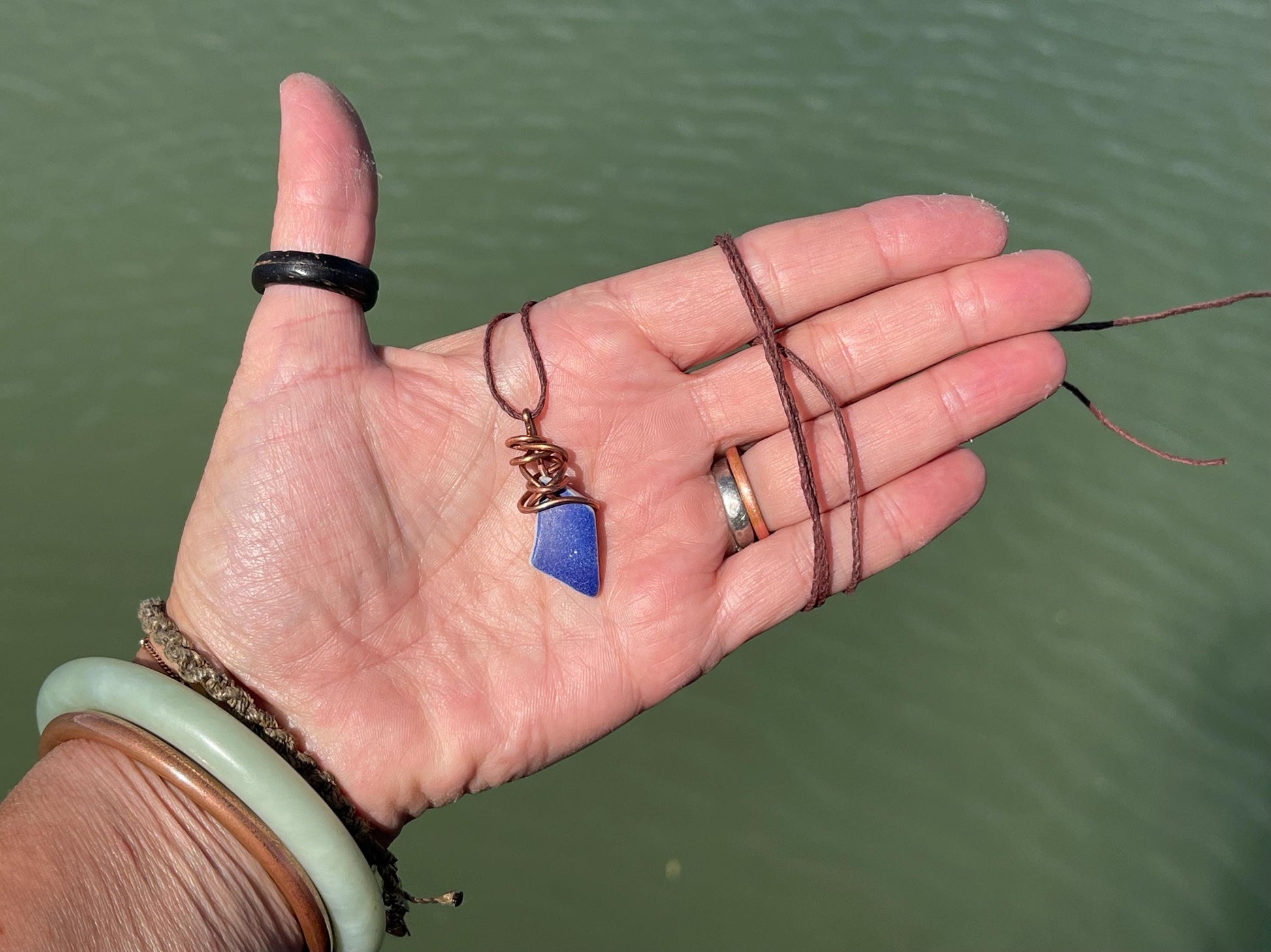 This is a recycled piece of pottery, washed up by the sea, drilled and wrapped in recycled copper that I stripped from waste electrical cables. It is hung on hemp, left loose so you can tie at your preferred length.