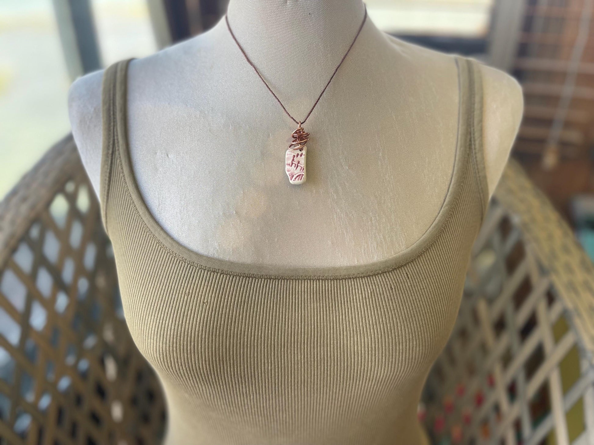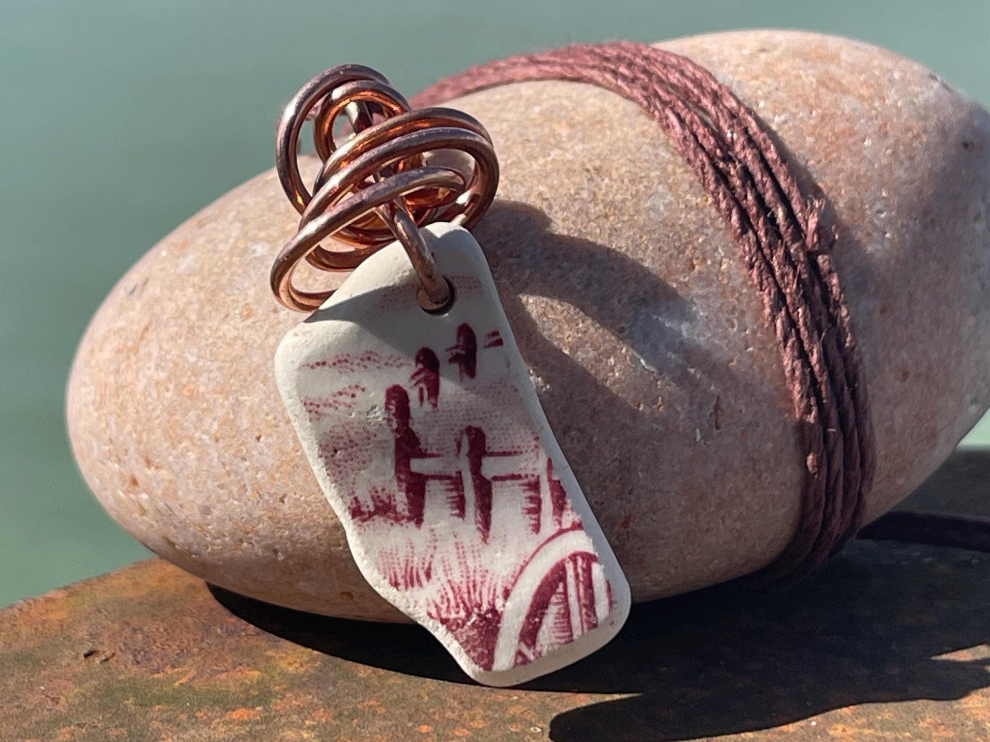 This is a recycled piece of pottery. Washed up by the sea, drilled, hung on recycled copper (stripped from waste electrical cables) and hemp, and ready for a new lease of life.