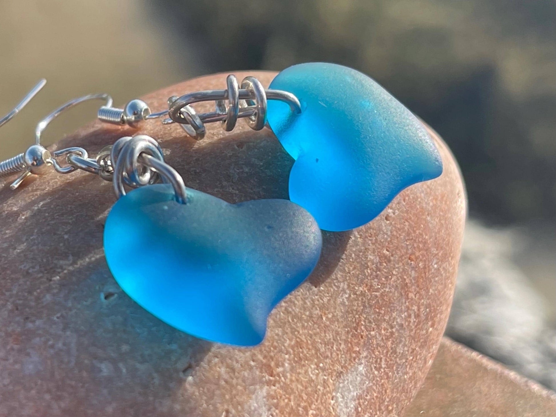 Sea glass heart earrings iron recycled sterling silver. Eco conscious jewellery. Ethical jewellery. Blue sea glass hearts. Handmade earrings