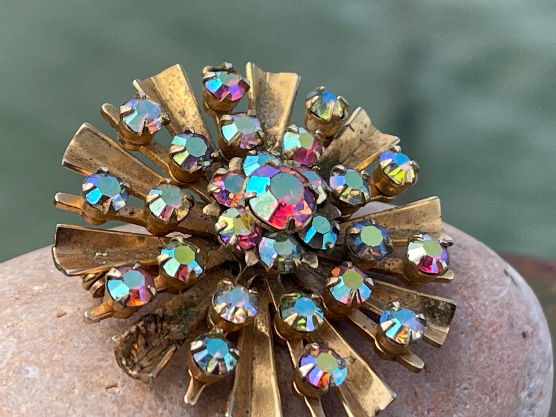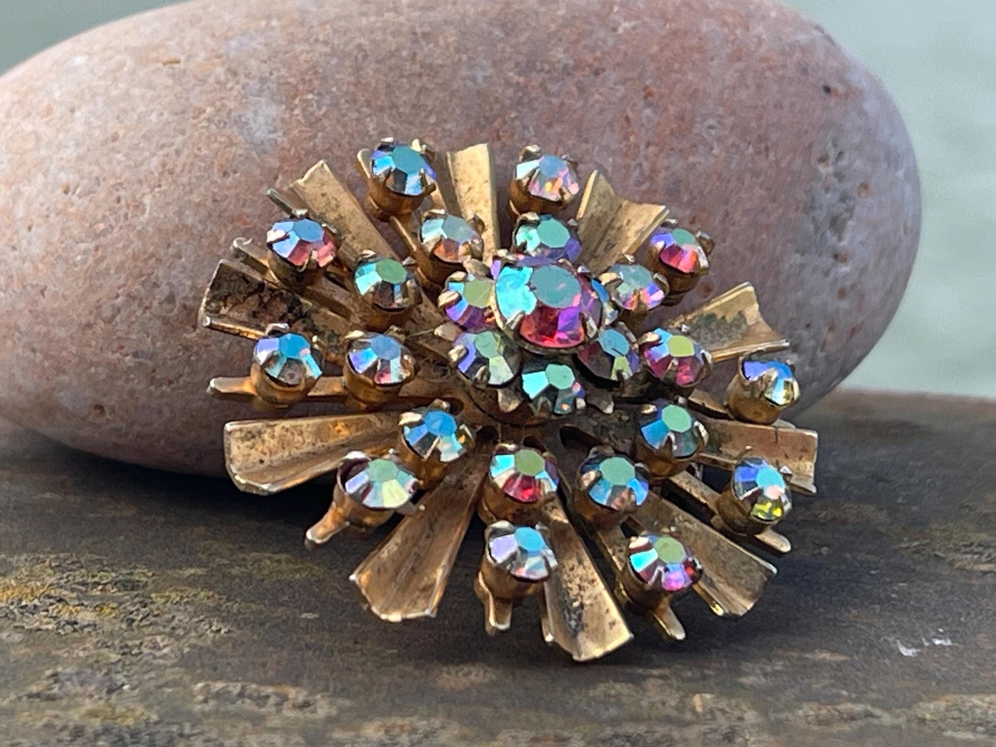 An absolutely stunning vintage brooch in the shape of a flower. It shines beautifully in the light.