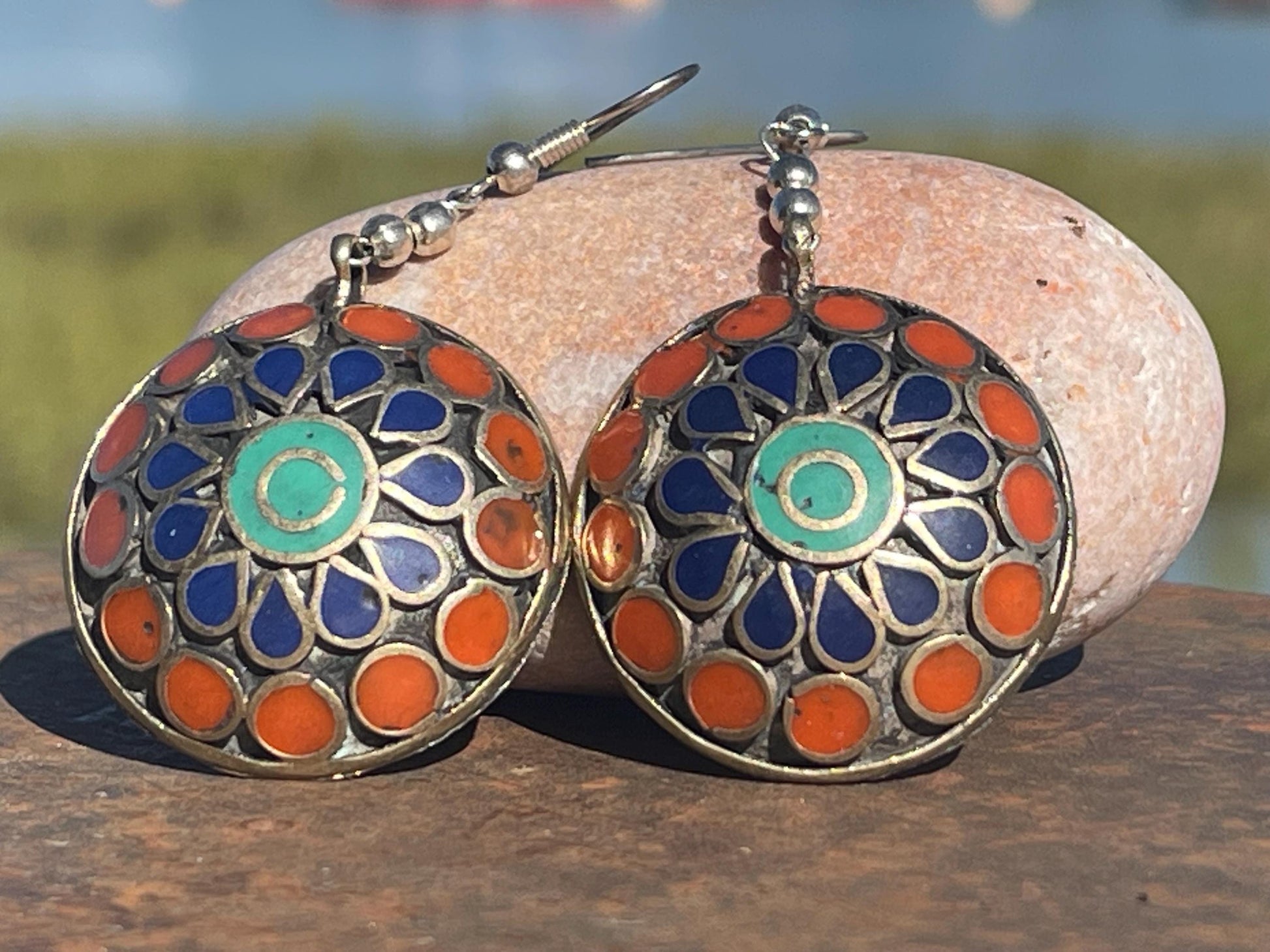 Vintage earrings, red and blue circular earrings. Eco friendly jewellery. Ethical jewellery.
