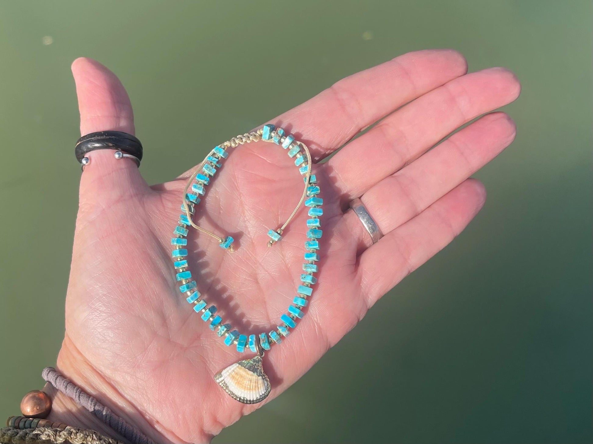 Adjustable blue jasper gemstone bracelet, handmade gift for him or her. Ethical jewellery, handmade unique jewellery. Shell bracelet.
