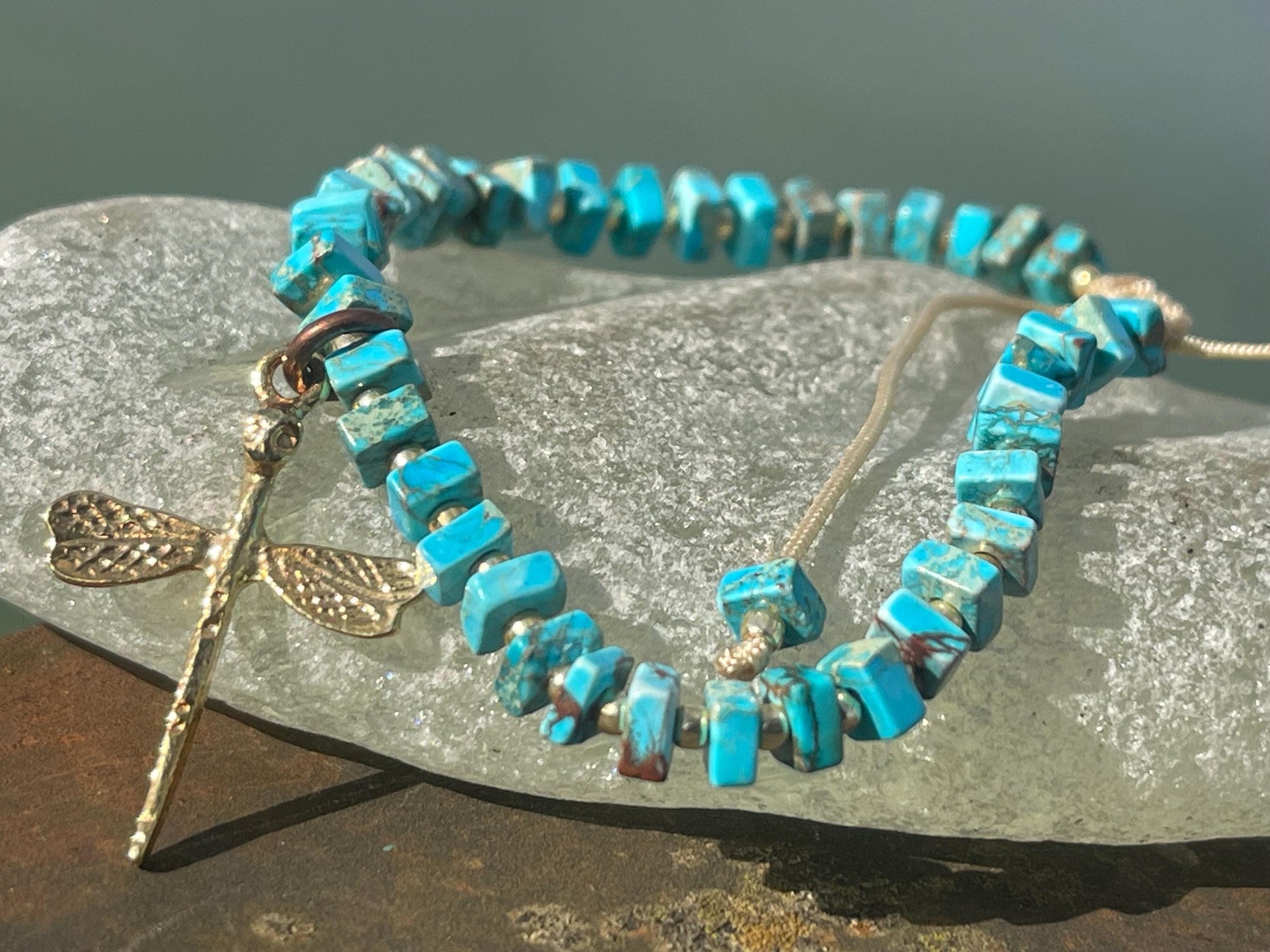 This is handmade ocean jasper bracelet showcasing a little brass dragonfly. It is hosted on an adjustable cord to make it easy to get in and off and to suit a range of wrist sizes.