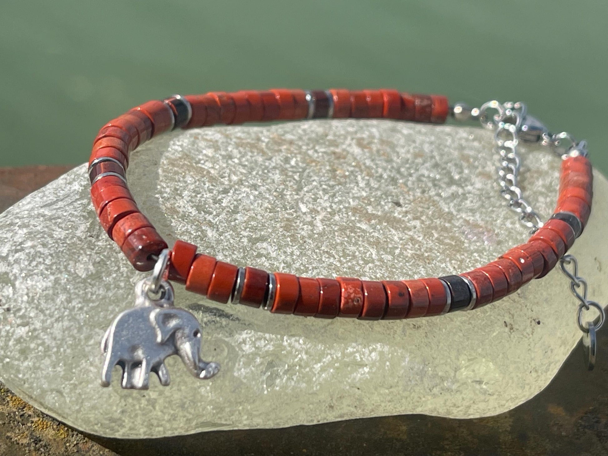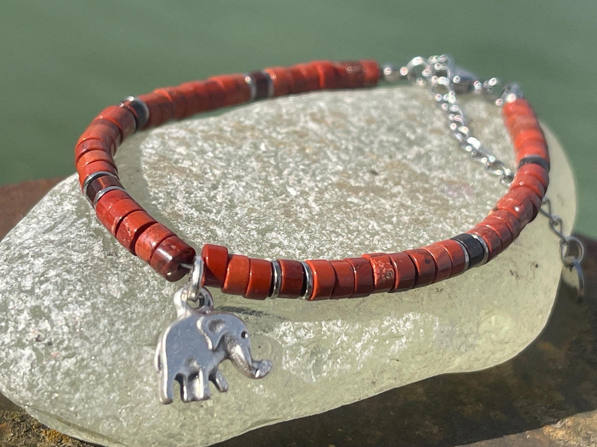Adjustable gold and red jasper gemstone bracelet, handmade gift for him or her. Ethical jewellery, unique jewellery. Elephant bracelet.