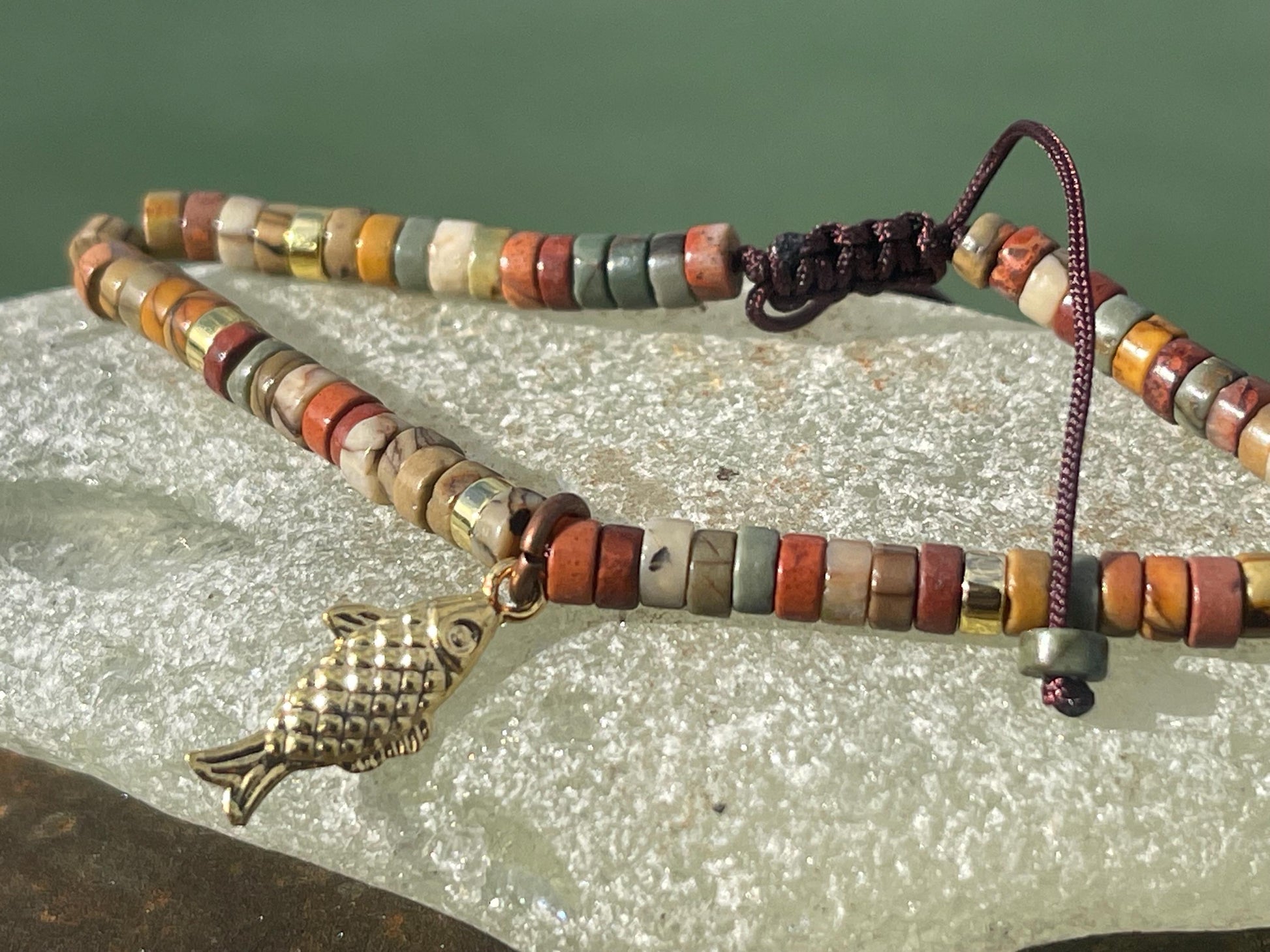 This is handmade picasso jasper bracelet showcasing a little brass fish. It is hosted on an adjustable cord to make it easy to get in and off and to suit a range of wrist sizes.