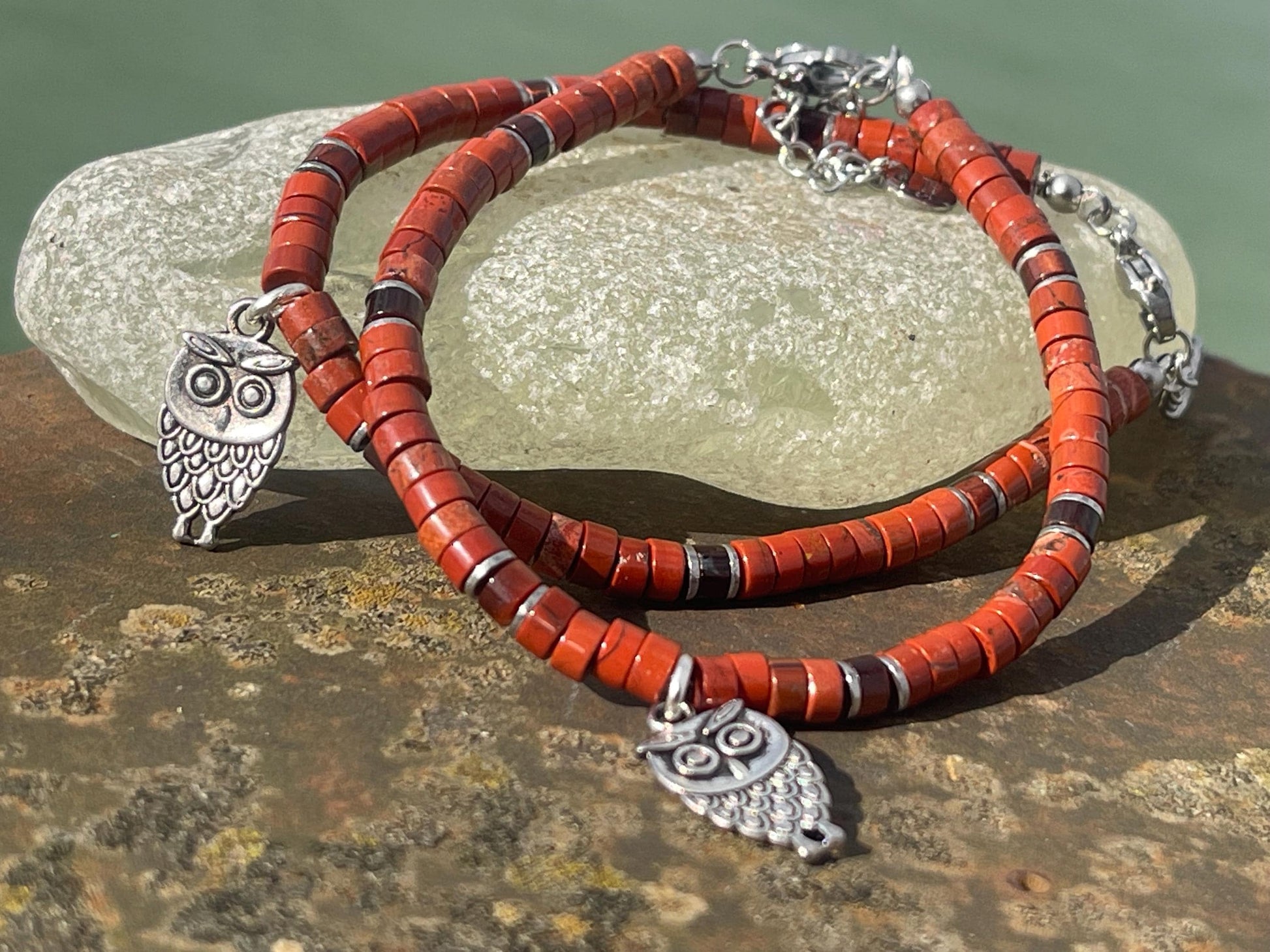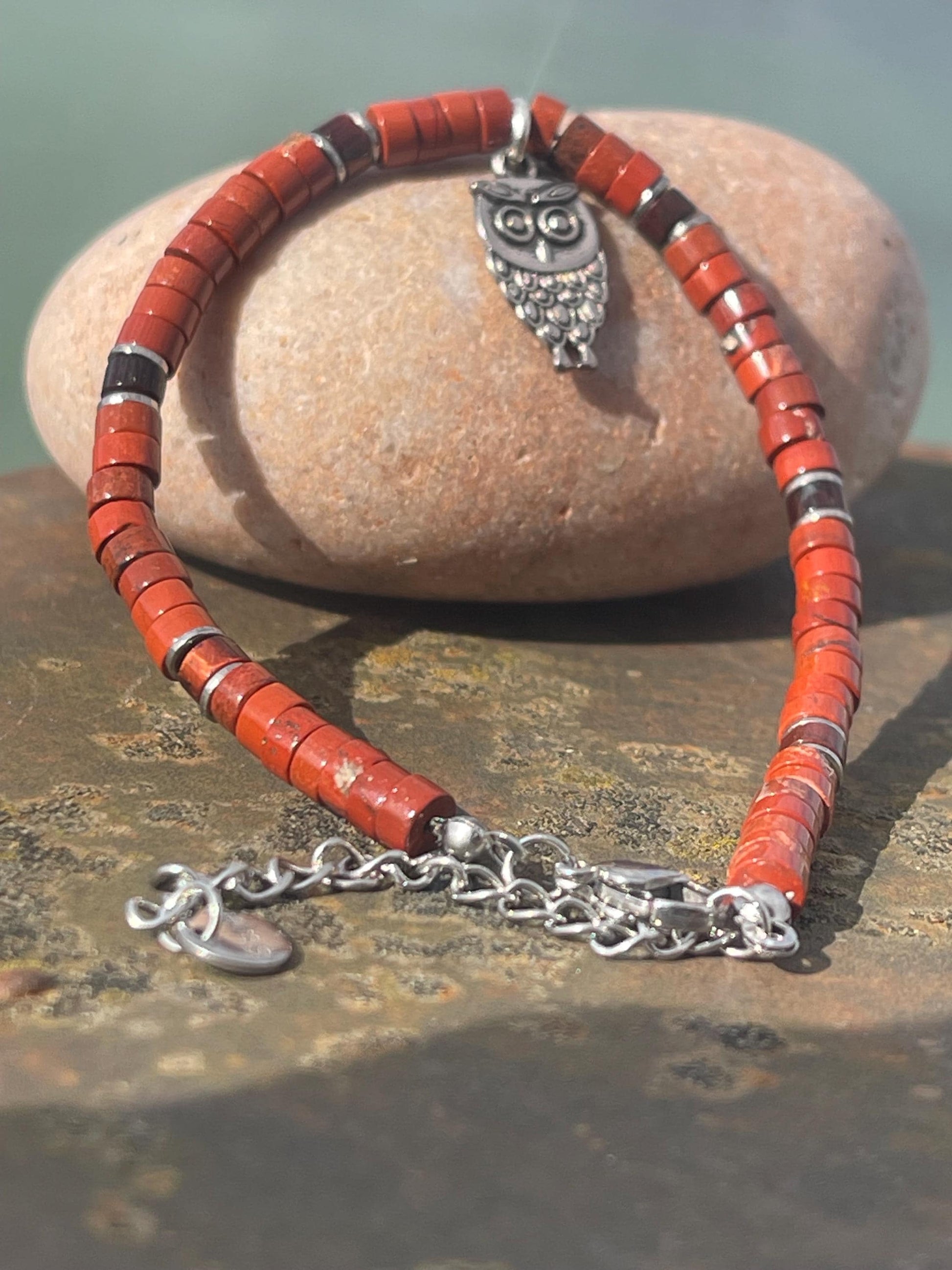 Adjustable red jasper gemstone bracelet, handmade gift for him or her. Ethical jewellery, unique jewellery. Owl bracelet. Owl jewellery.