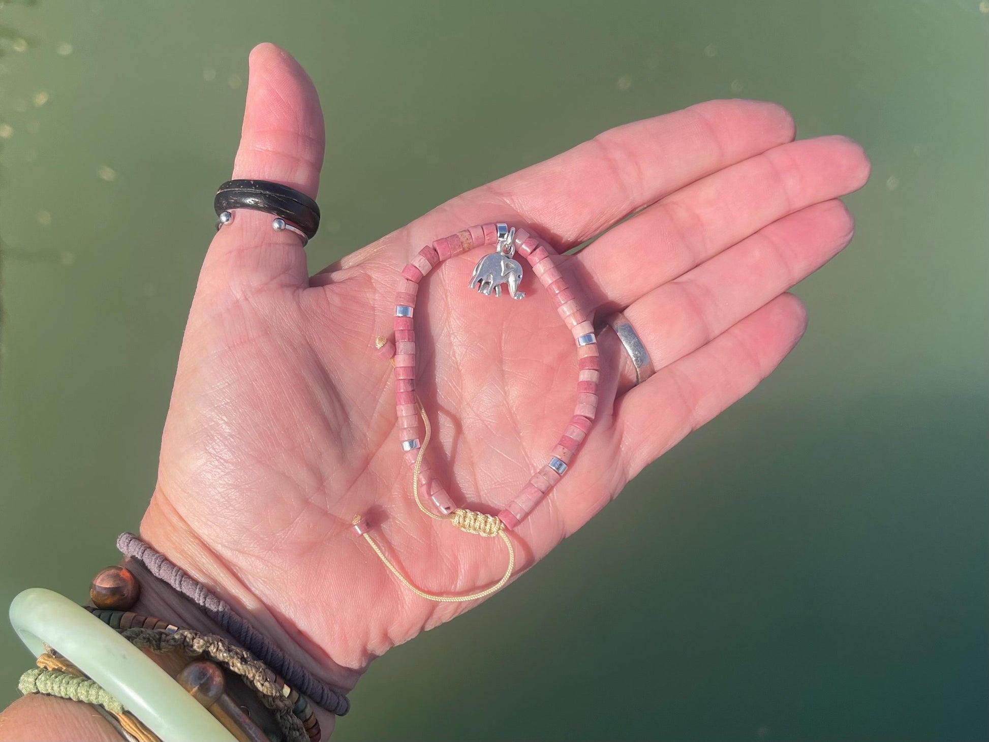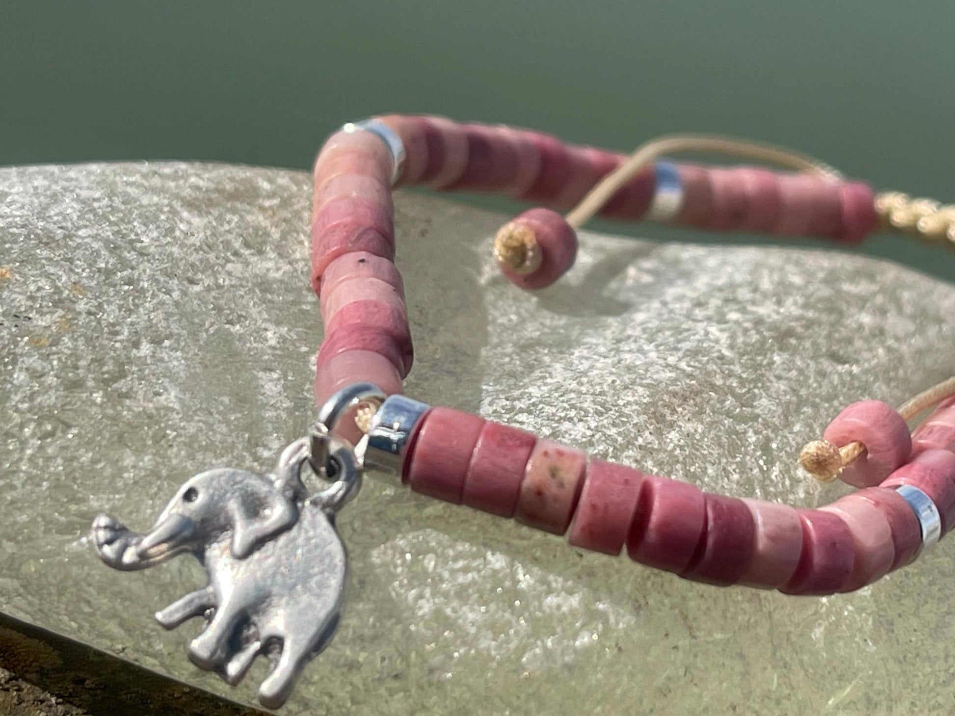 Adjustable rhodonite pink gemstone bracelet, handmade gift for him or her. Ethical jewellery, unique jewellery. Elephant bracelet.