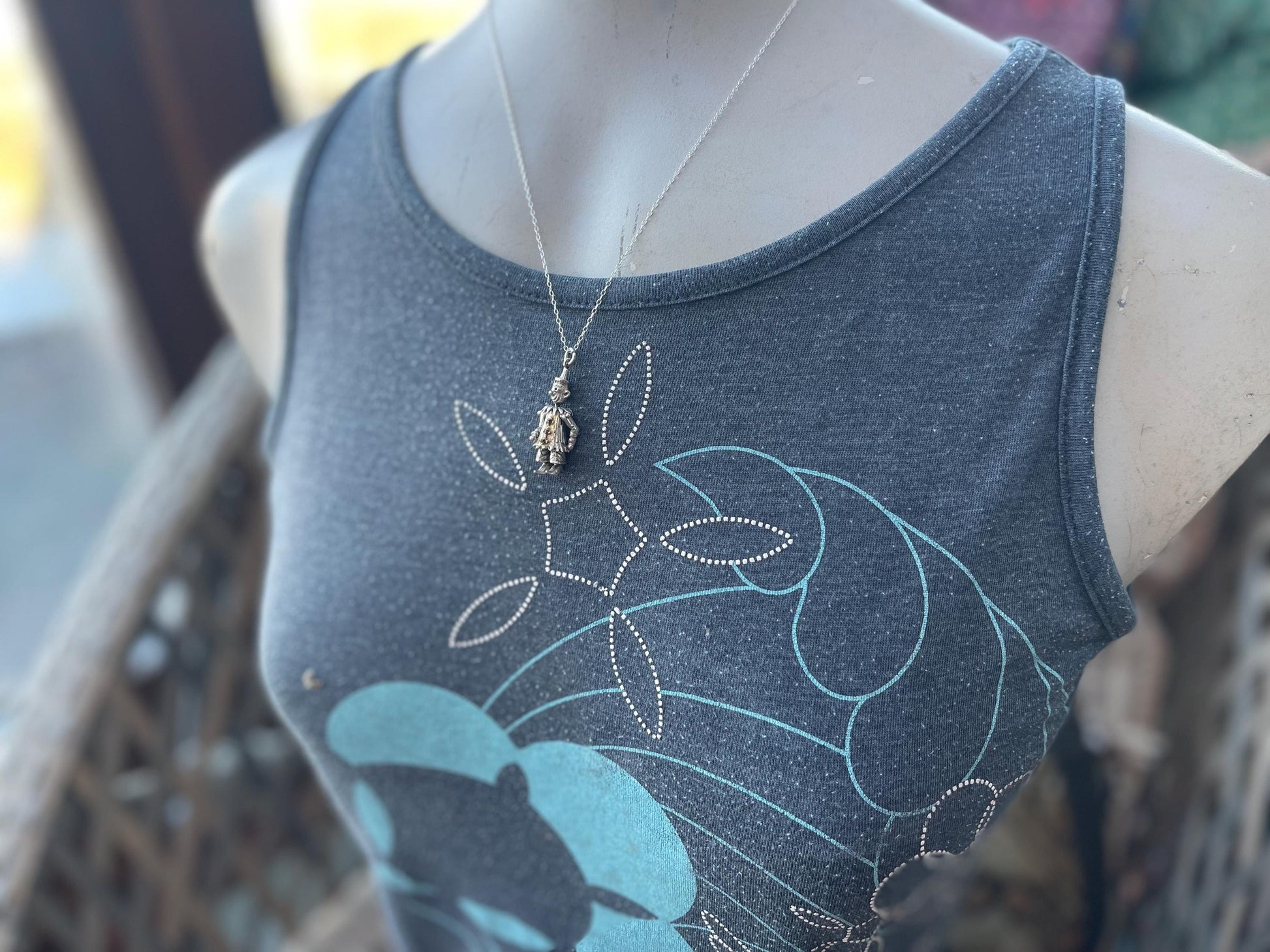 This is a very beautiful contage clown necklace made from silver and embellished with beautiful pieces of glass. The clown has moving parts and I have hung him on a recycled sterling silver 18’ chain.