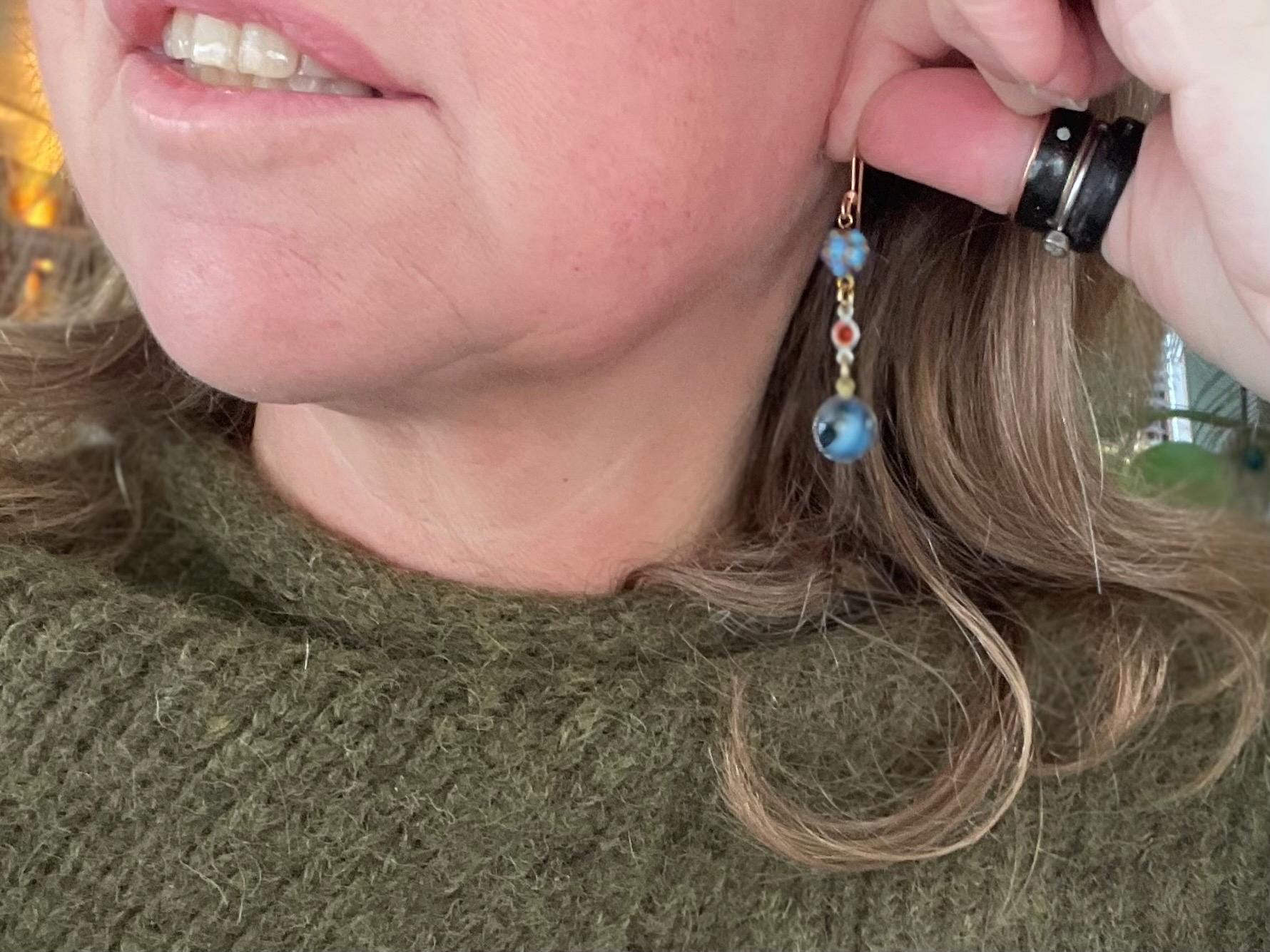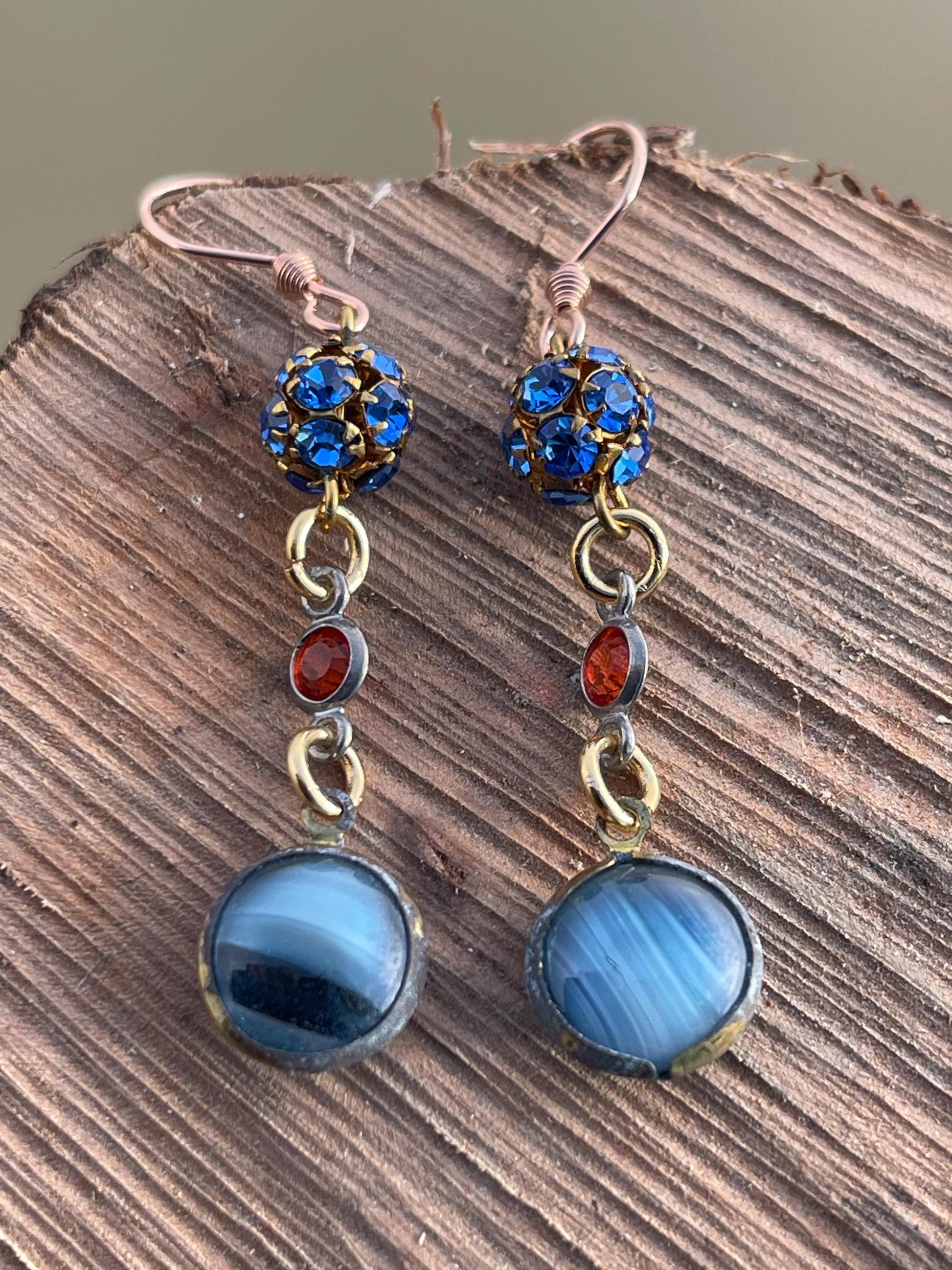 Beautiful blue & red vintage earrings. Eco friendly jewellery made from stunning vintage beading. Eco friendly earrings. Ethical jewellery.