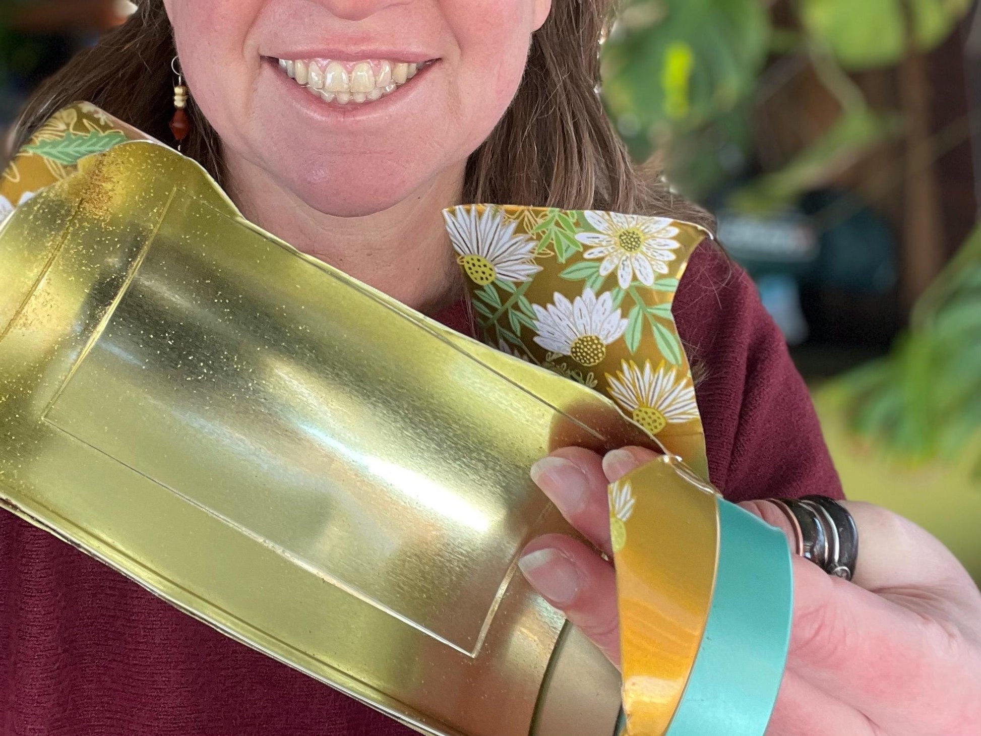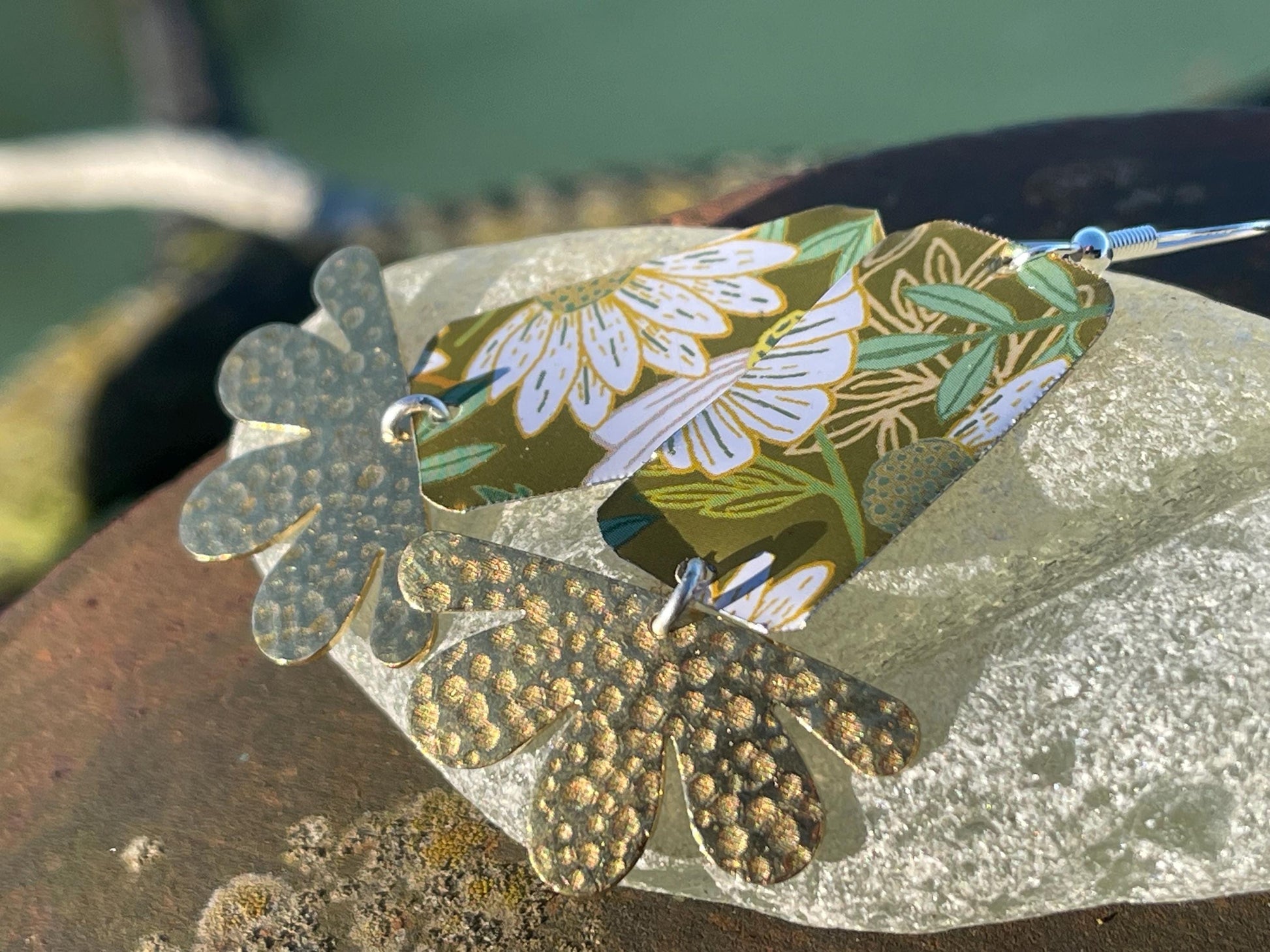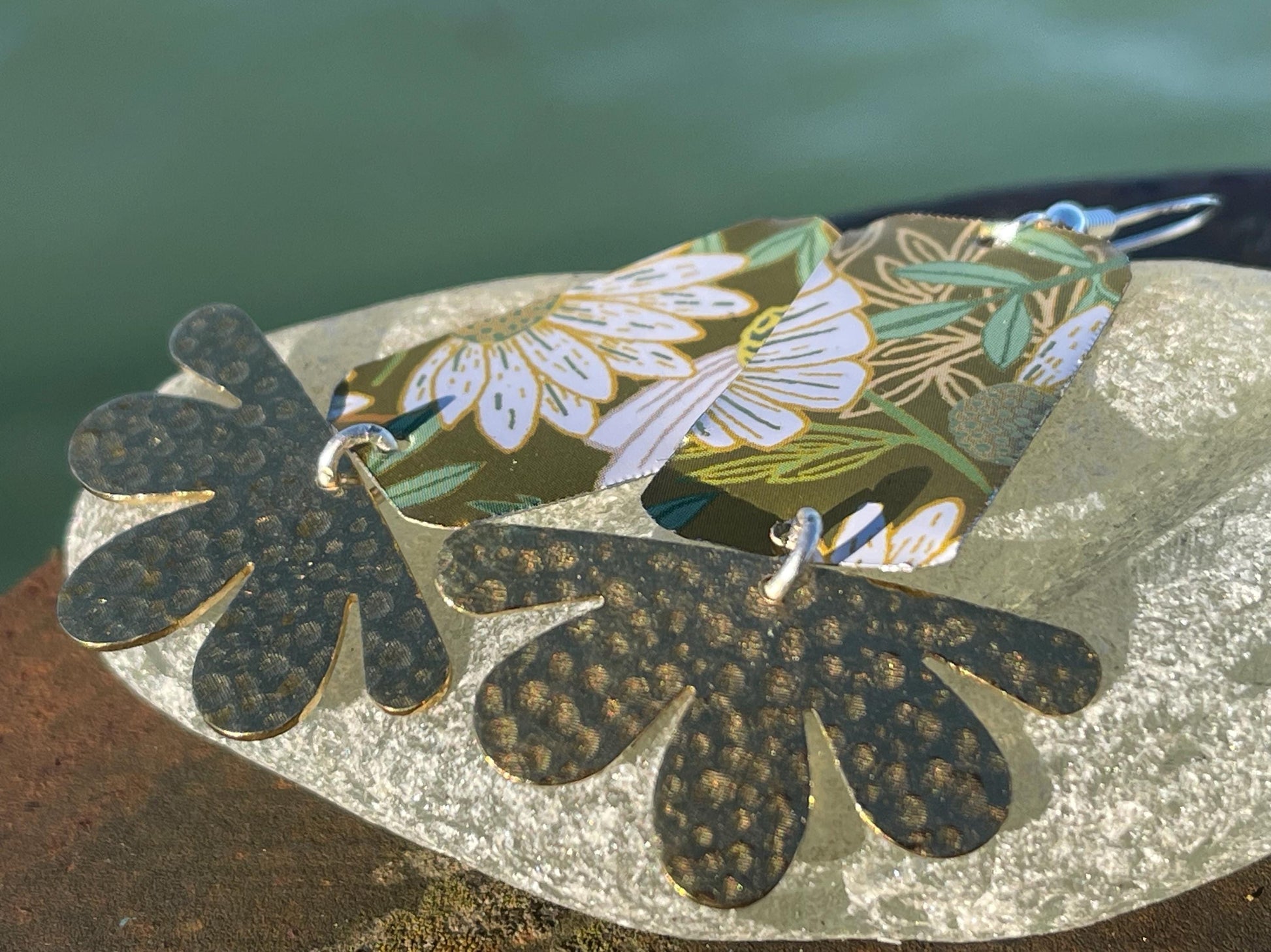 These earrings integrate recycled tea tins and showcase two vesicular flowers. They are hung on hammered brass and sterling silver ear hooks.