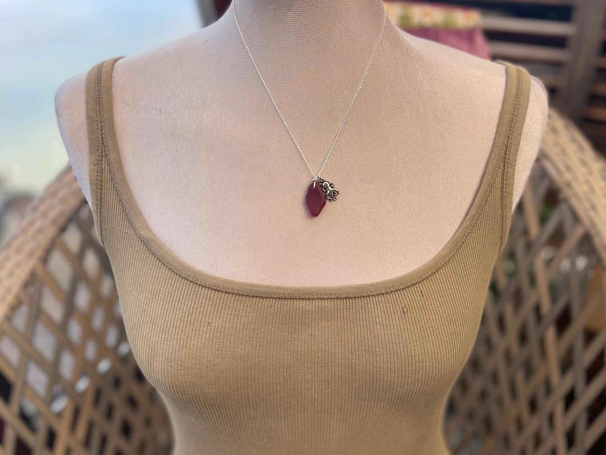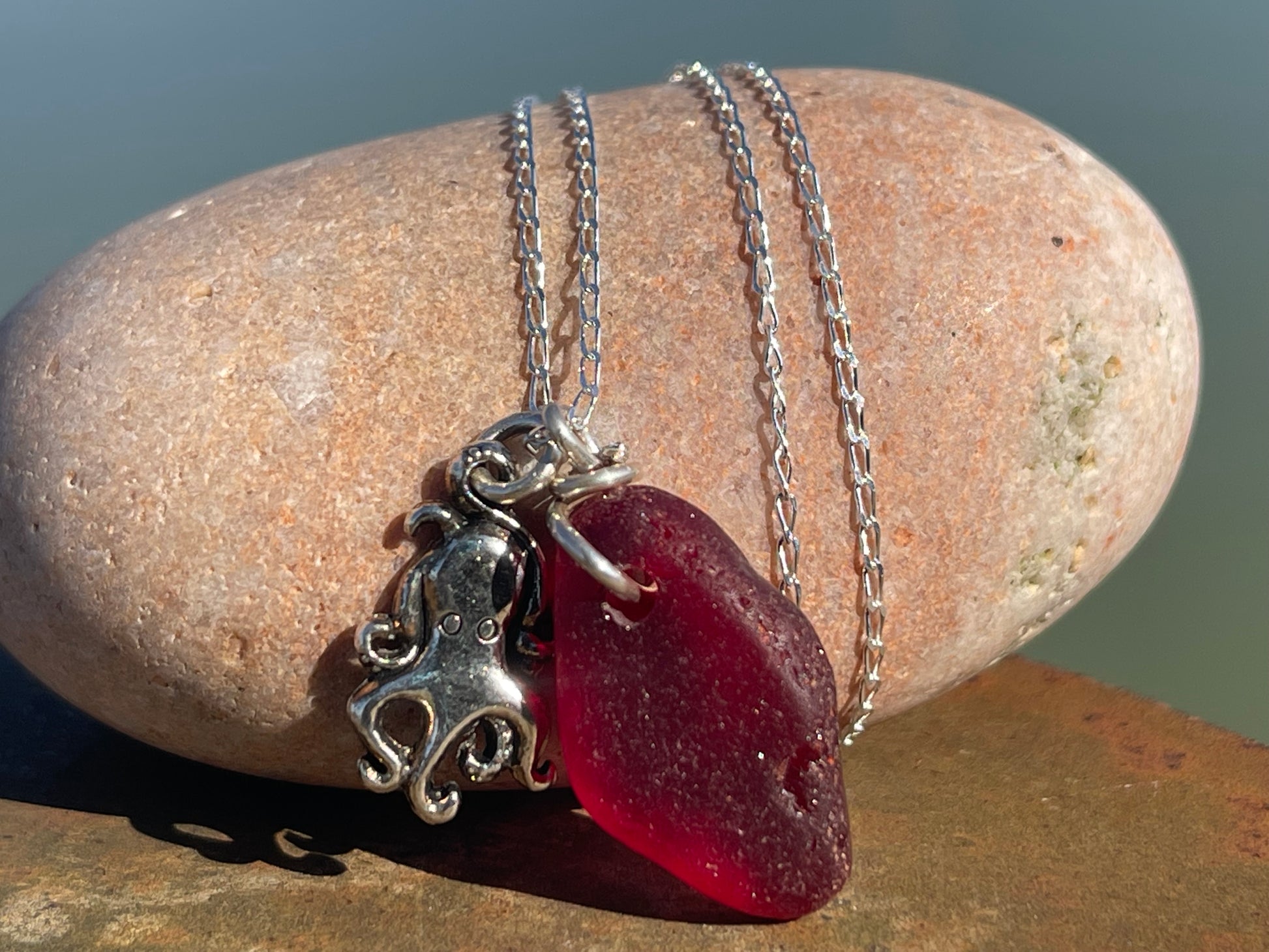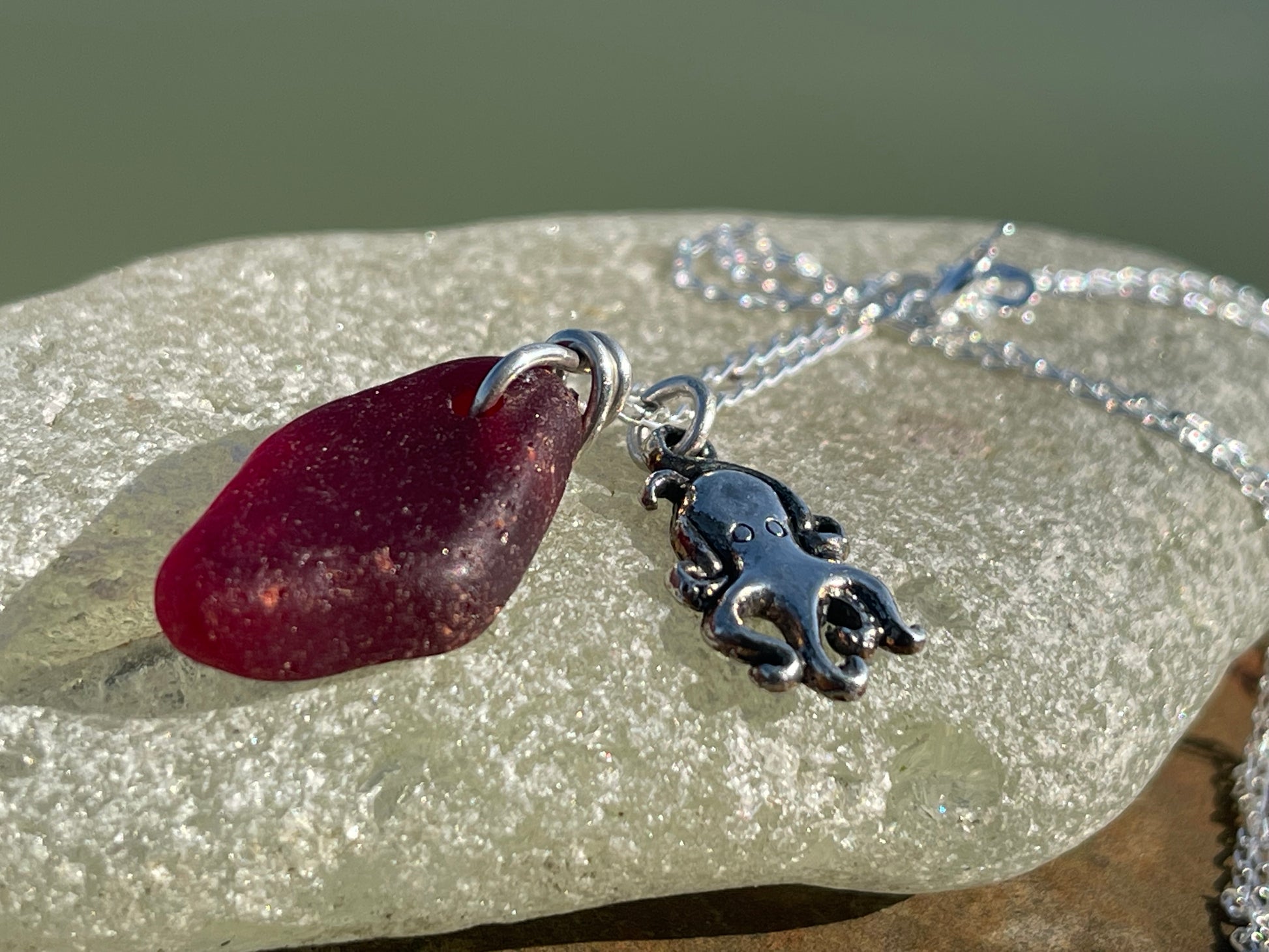 Eco friendly sea glass necklace on a sterling silver chain showcasing a little octopus. Octopus pendant, octopus necklace, ethical jewellery
