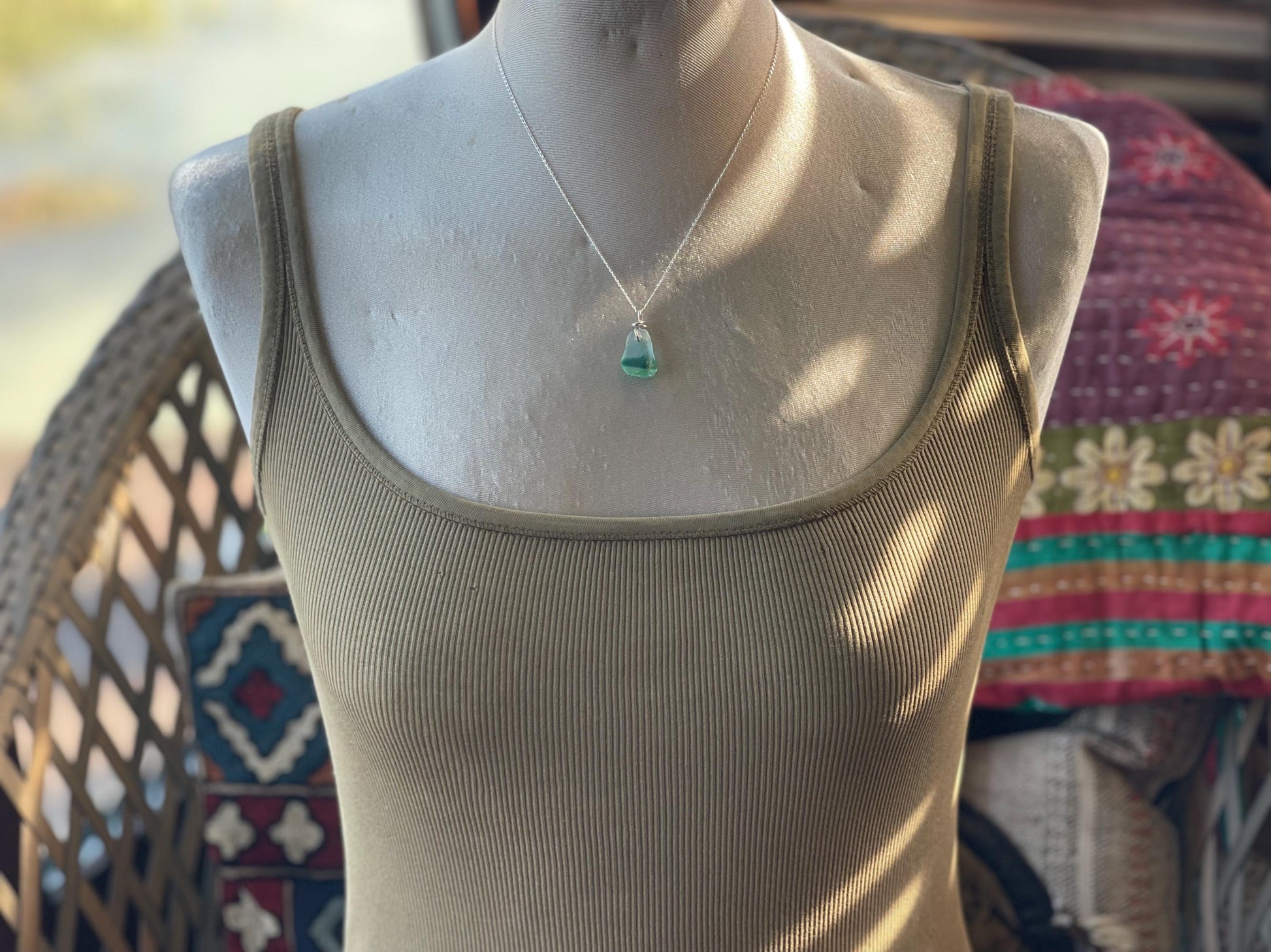 Eco friendly sea glass necklace on a sterling silver chain. Unusual sea glass pendant. Handmade eco friendly jewellery. Ethical jewellery.