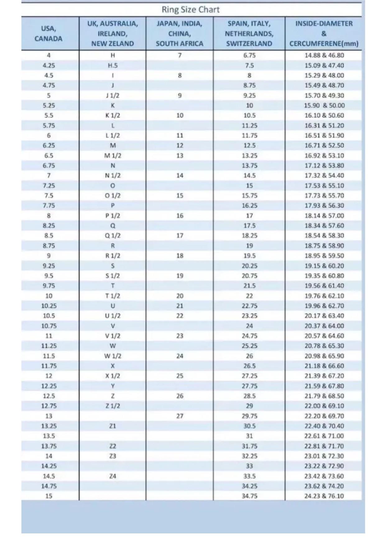 To work out your ring size Take a length of floss or string and wrap it around the base of your finger. Mark where the floss or string first overlaps with a pen. Stretch the length of string out along a ruler or measuring tape, and take down the length in millimetres. You can then scroll left (within my product pictures) to see my ring size chart and find out what size you are. Easy!