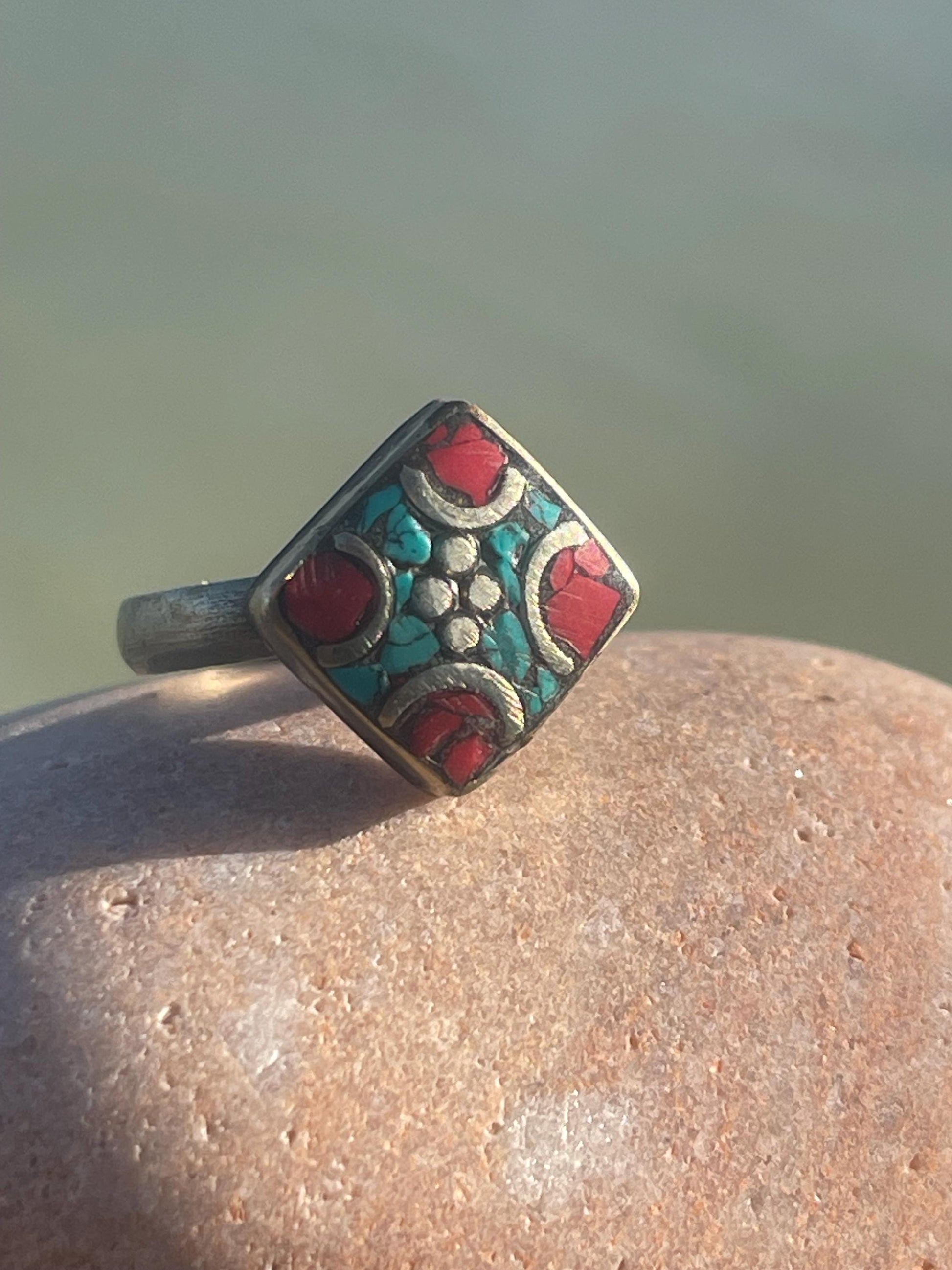 Fabulous vintage turquoise ring, silver & red ring, boho vintage jewellery, ethical jewellery, gypsy ring. Eco friendly jewellery.