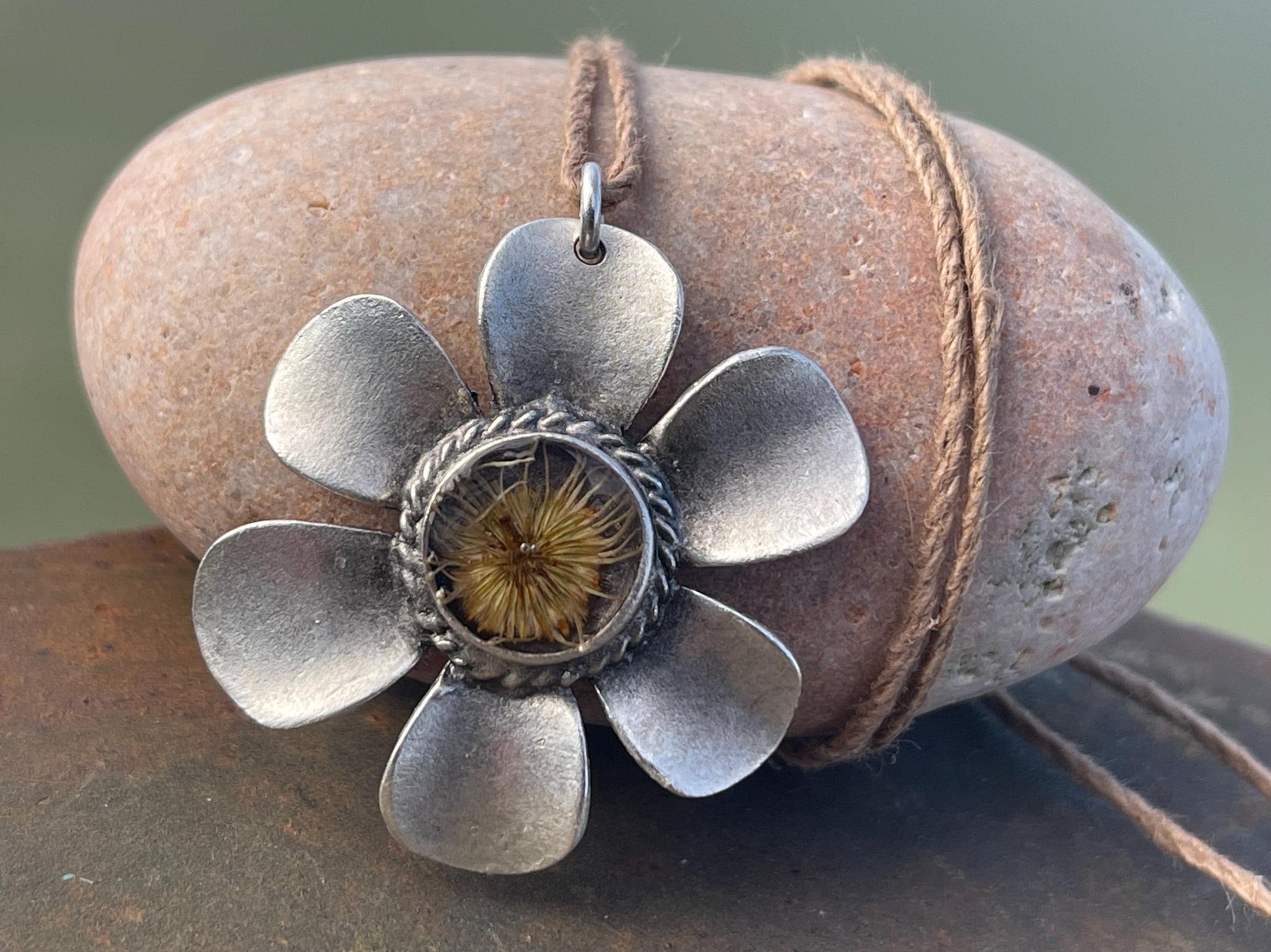 Daisy flower necklace. The flower was grown in my garden, pressed in an old fashioned wooden press and is hosted on brass coated with silver.