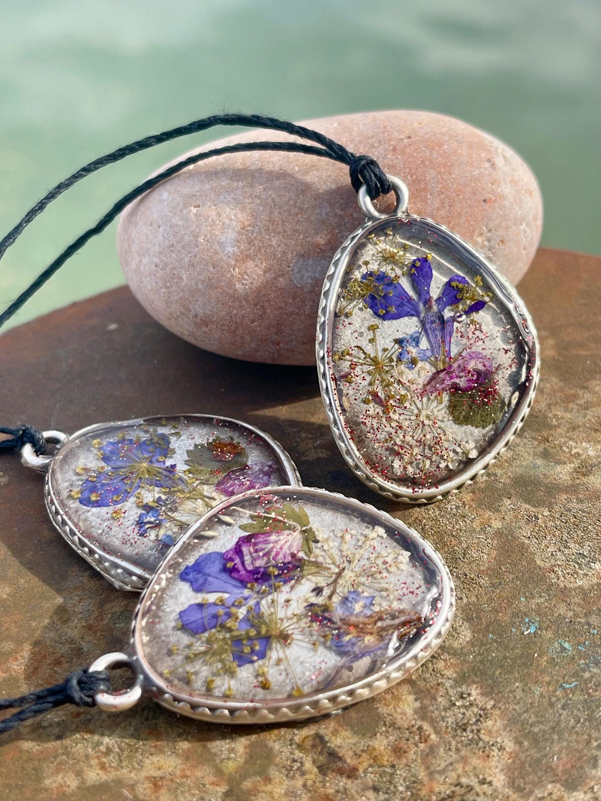 Romantic Violet flower necklace. Also showcasing forget-me-nots, carrot flowers and little specs of eco glitter (made from plants not plastic). All the flowers are hand pressed and grown in my garden :) You will receive one of the pieces pictured.
