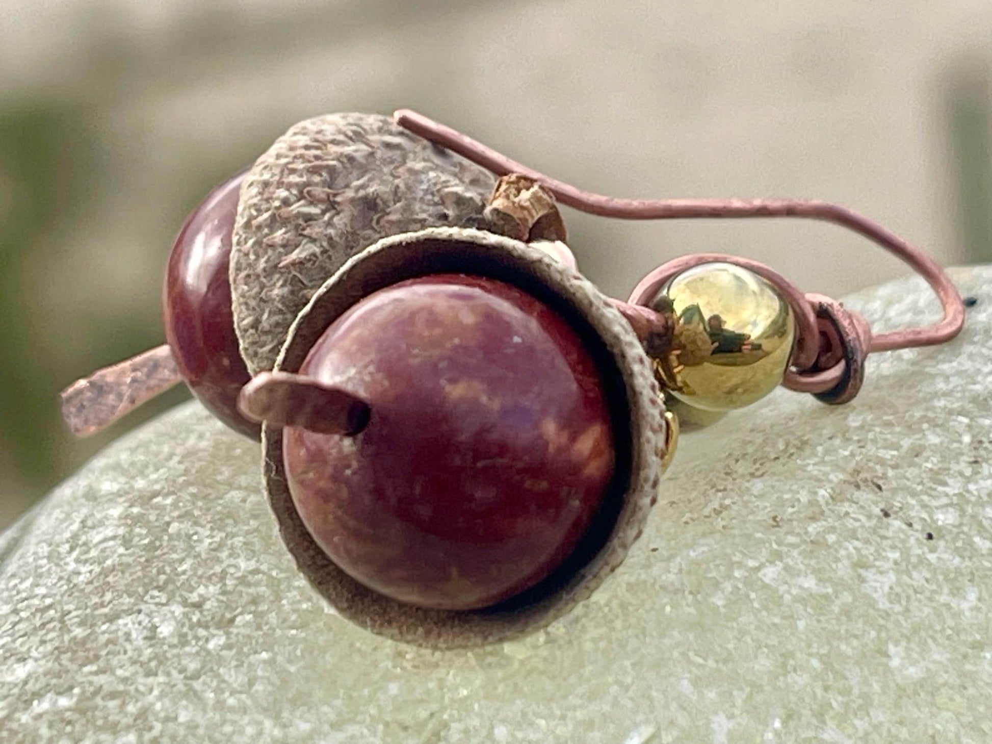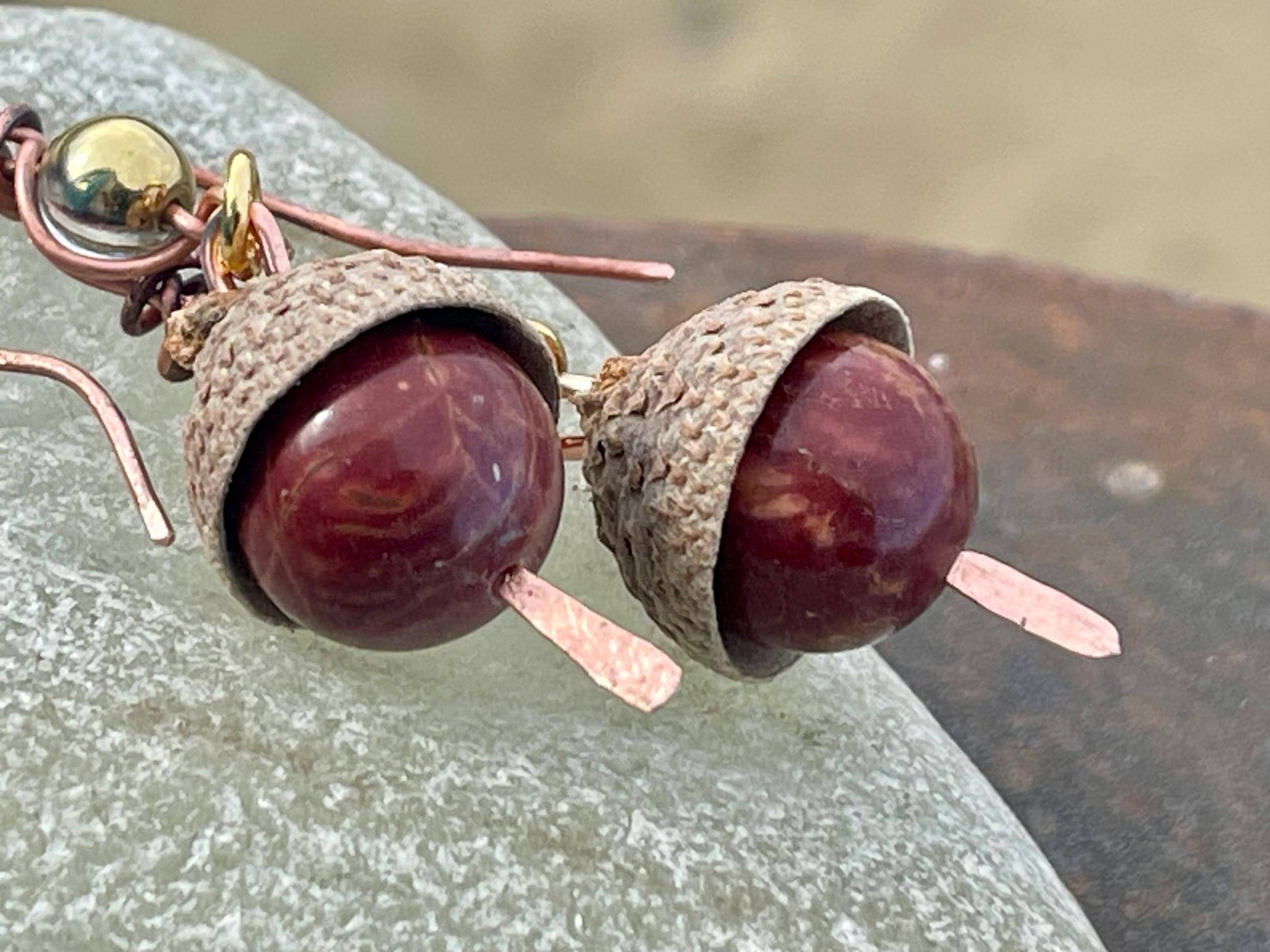 Handmade and eco friendly earrings. I made these using real acorn shells which I collected locally. Dried and drilled, I then added copper which I striped from waste electrical cables. The jasper beads are ethically sourced.