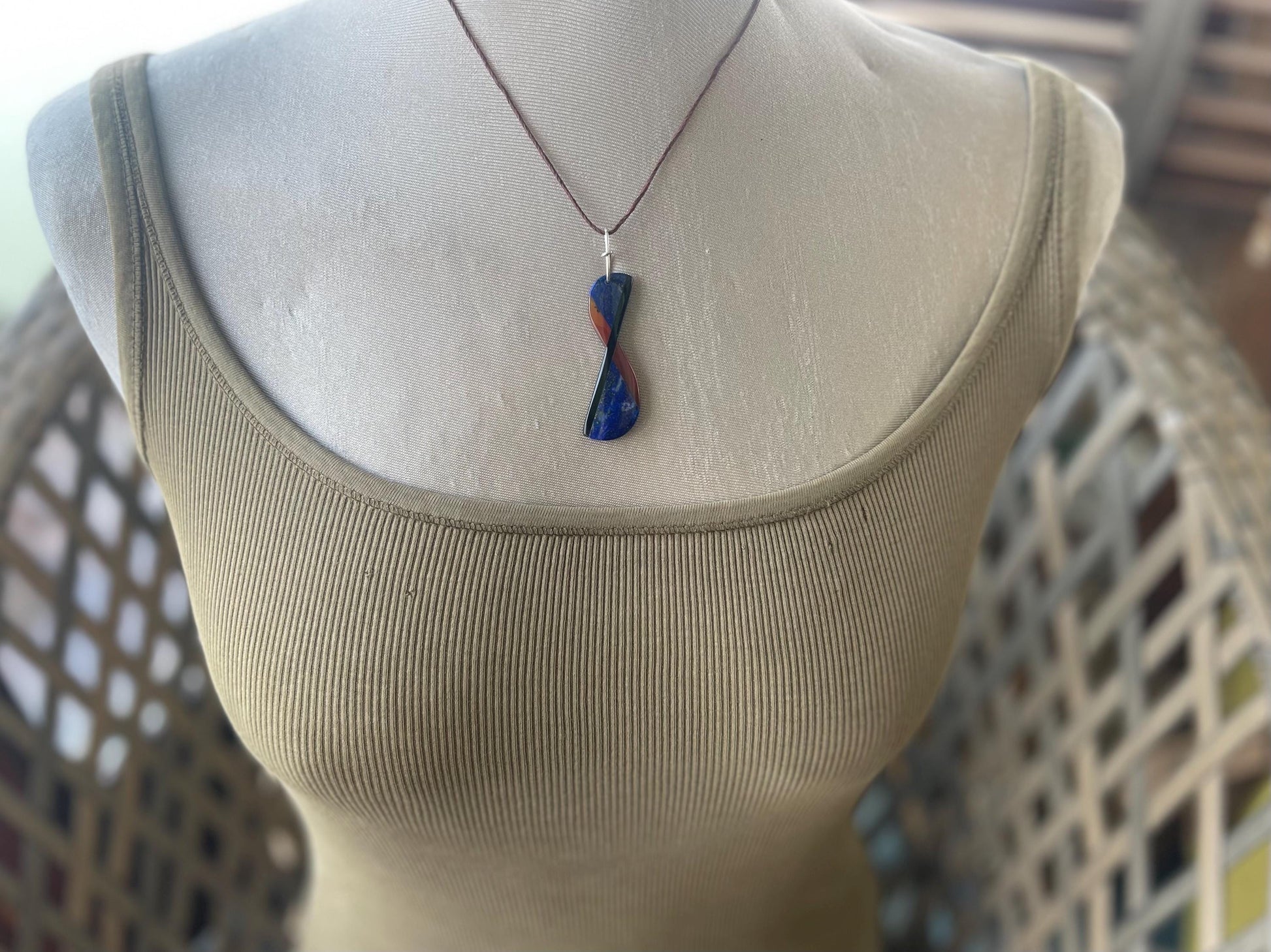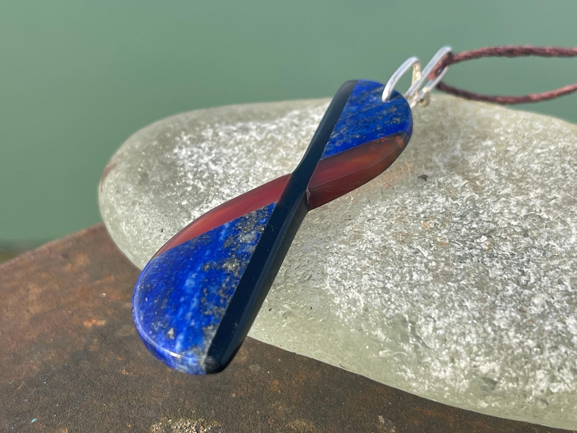 Unusual lapis lazuli, carnelian and onyx gemstone necklace wrapped with recycled sterling silver.