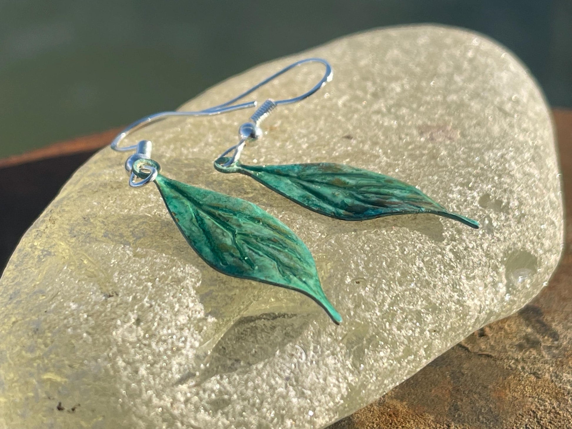 Stunning leaves that I have naturally patinered to reveal these beautiful shades of blue. They are hung on sterling silver ear hooks.