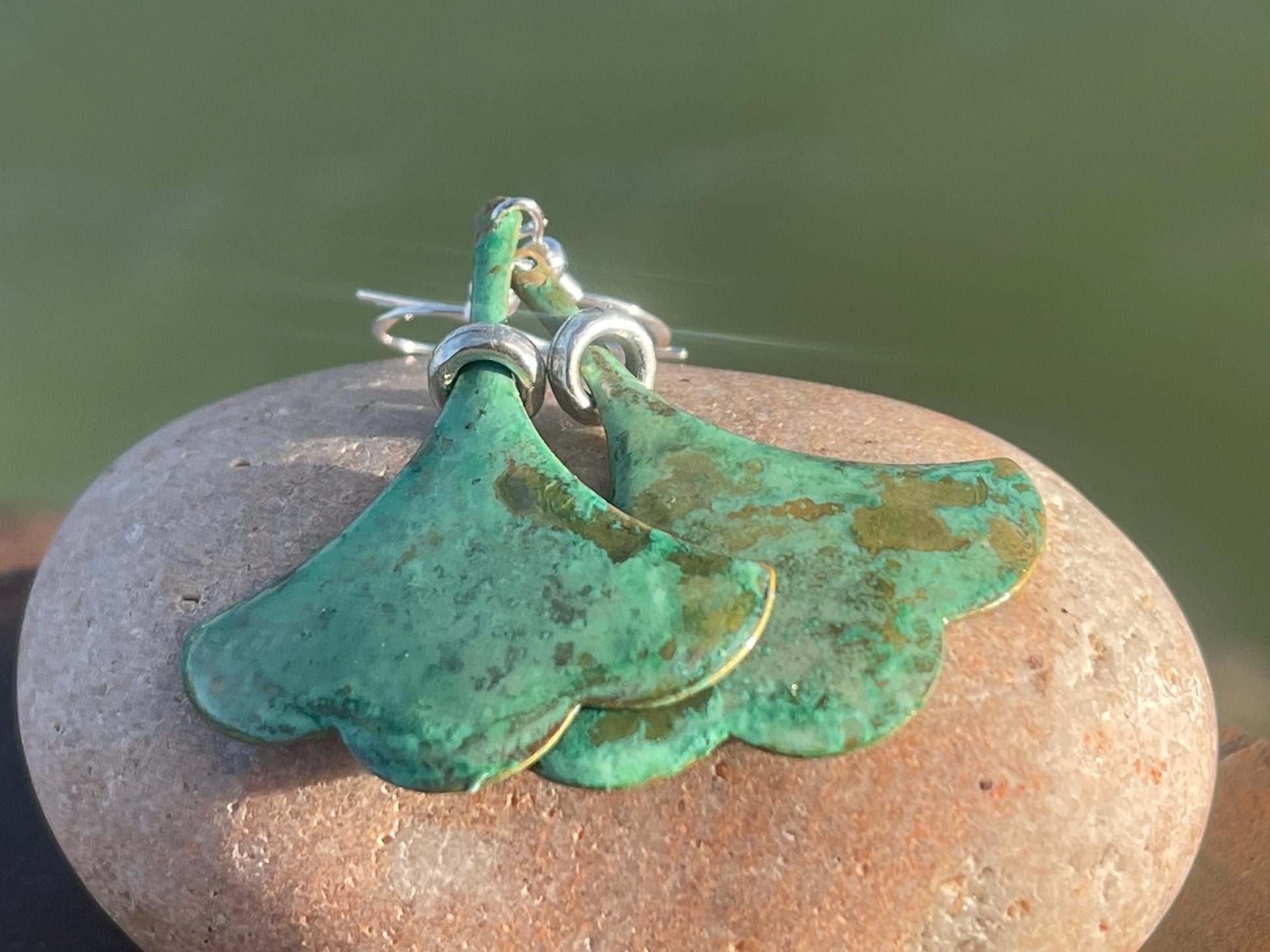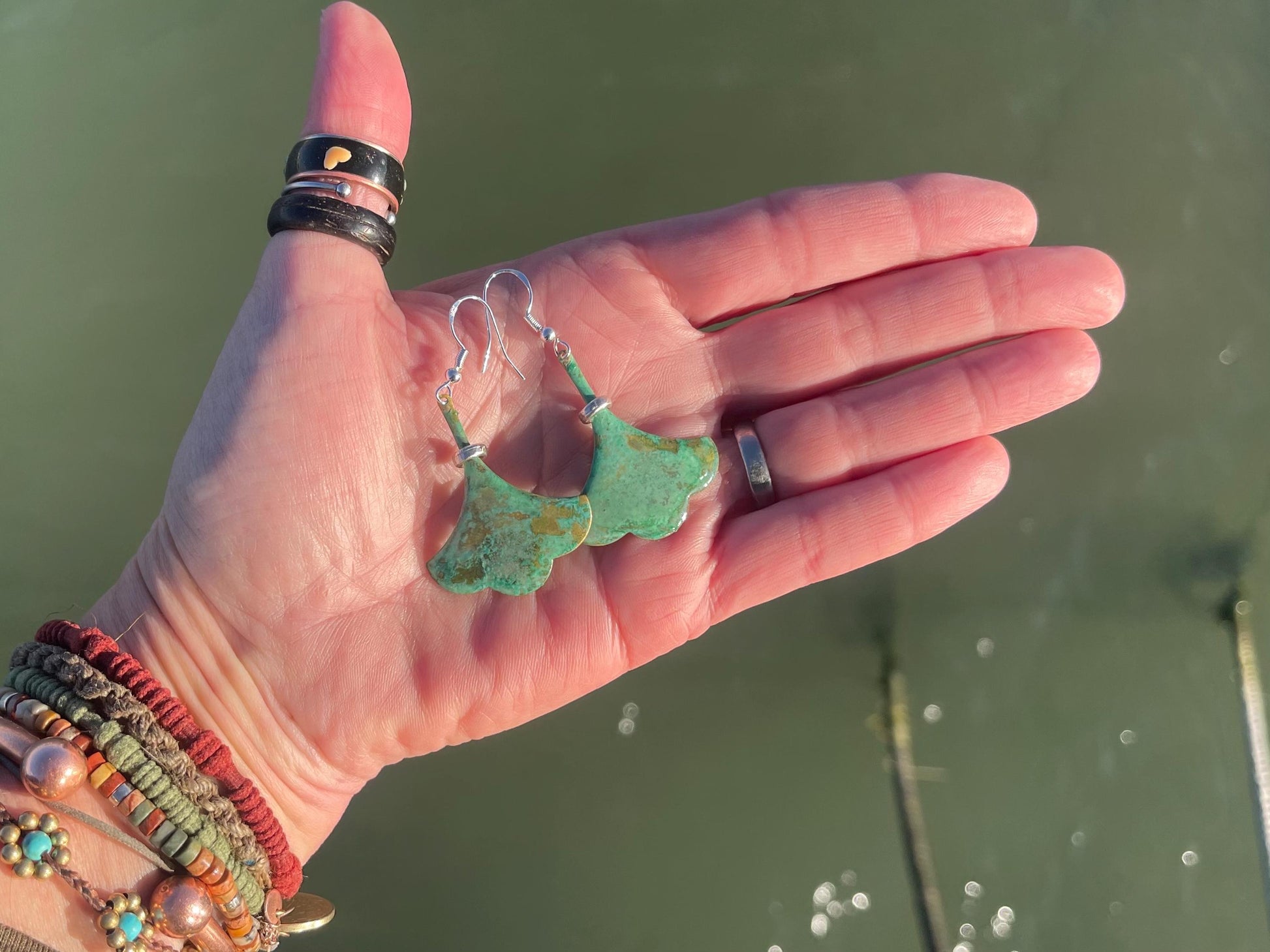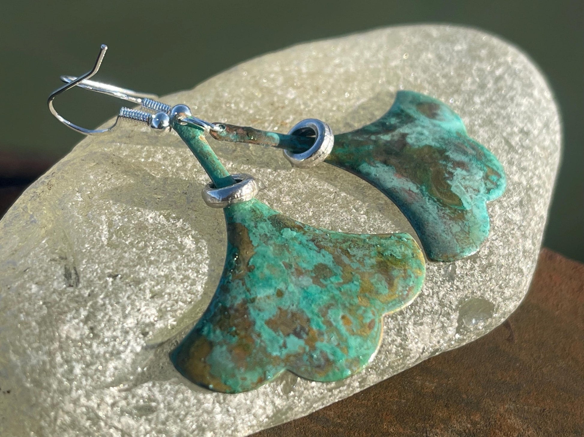 Stunning leaves that I have naturally patinered (no chemicals used) to reveal these beautiful shades of blue and gold. They are hung on recycled sterling silver.