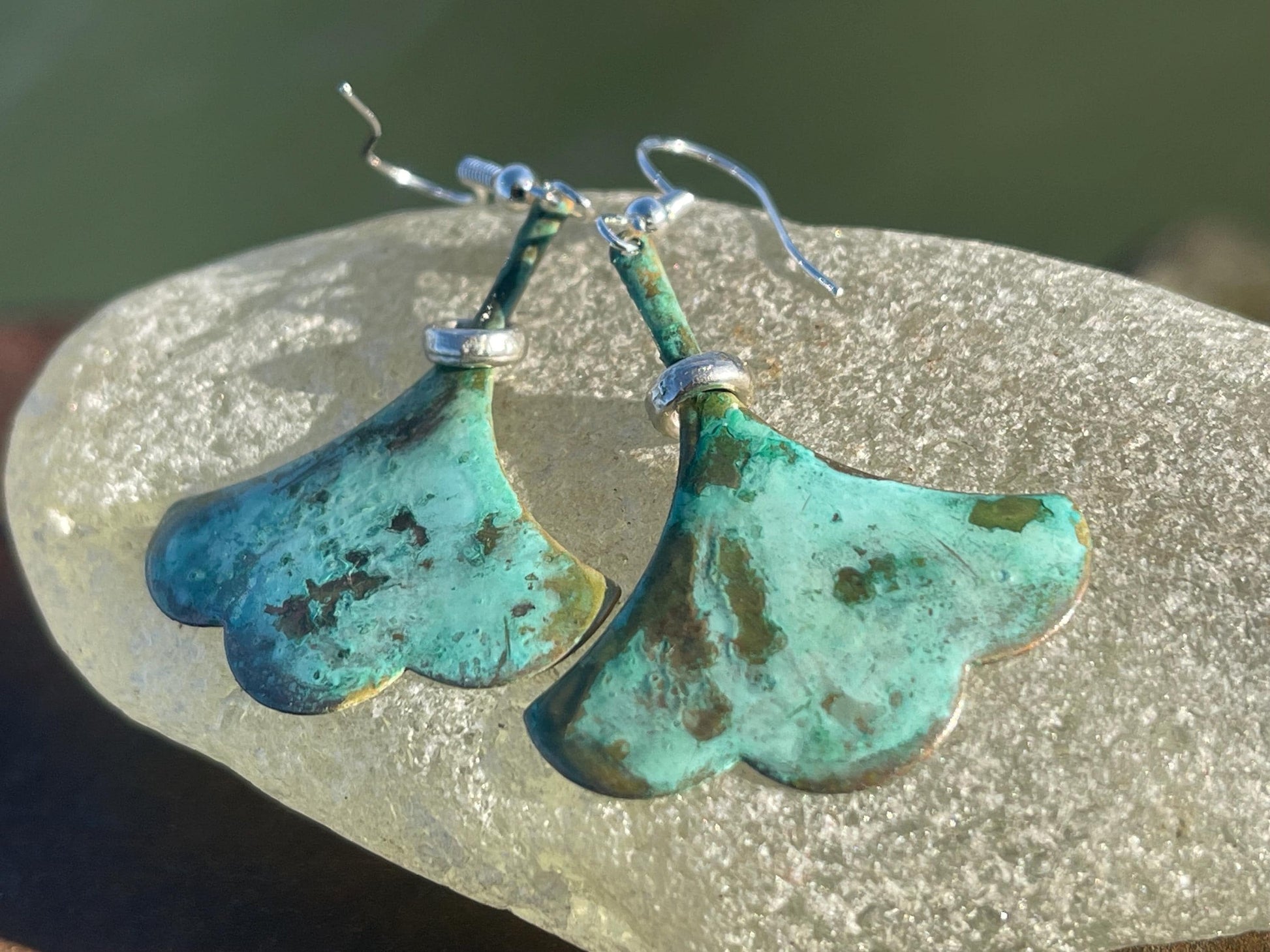 Handmade leaf earrings. Rustic earrings, unusual earrings, unusual gift for her, blue earrings, boho earrings, large statement earrings.