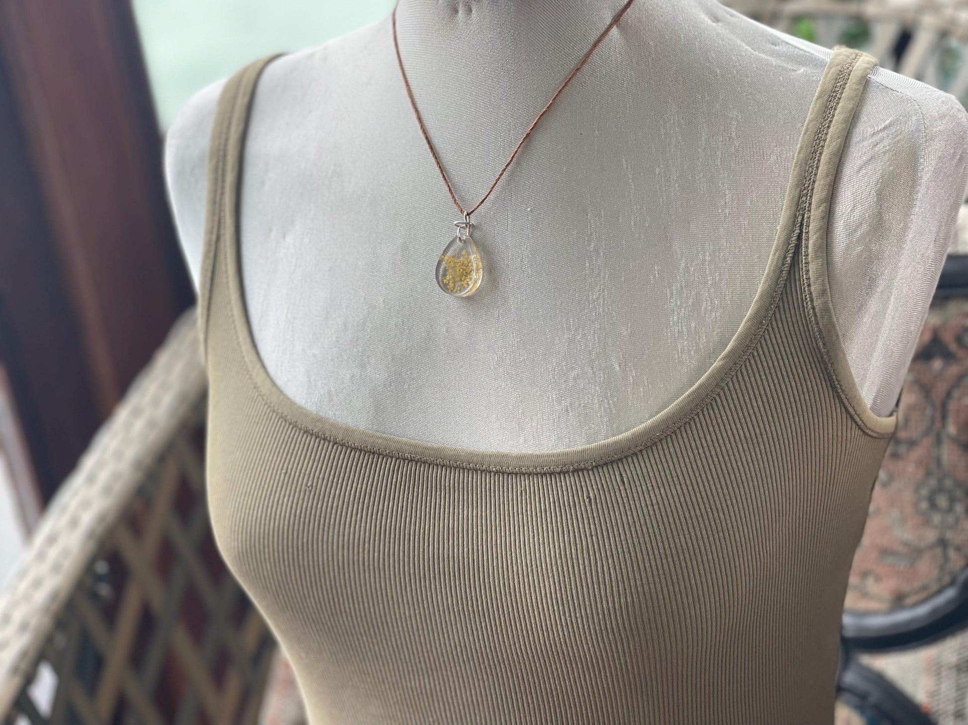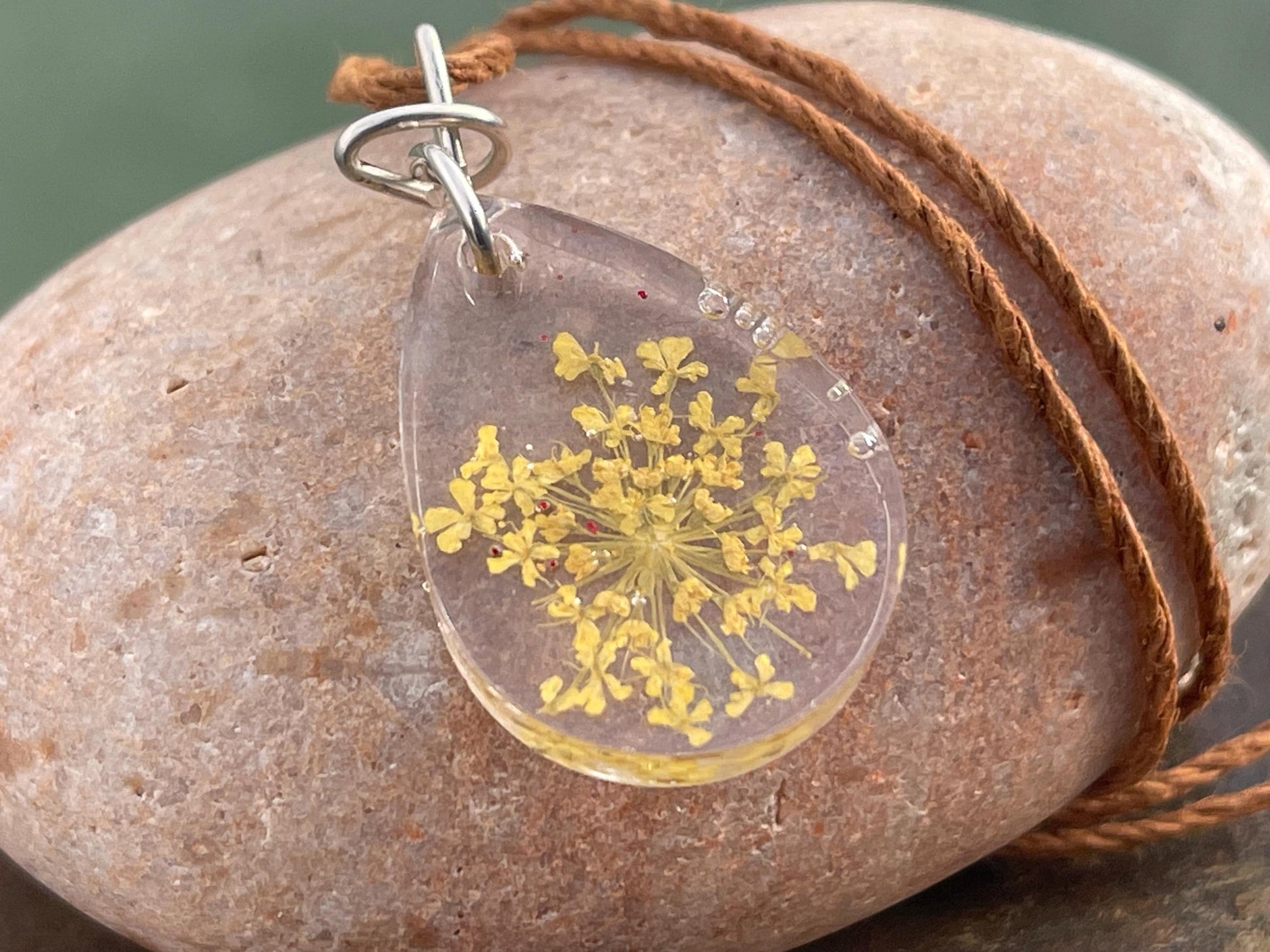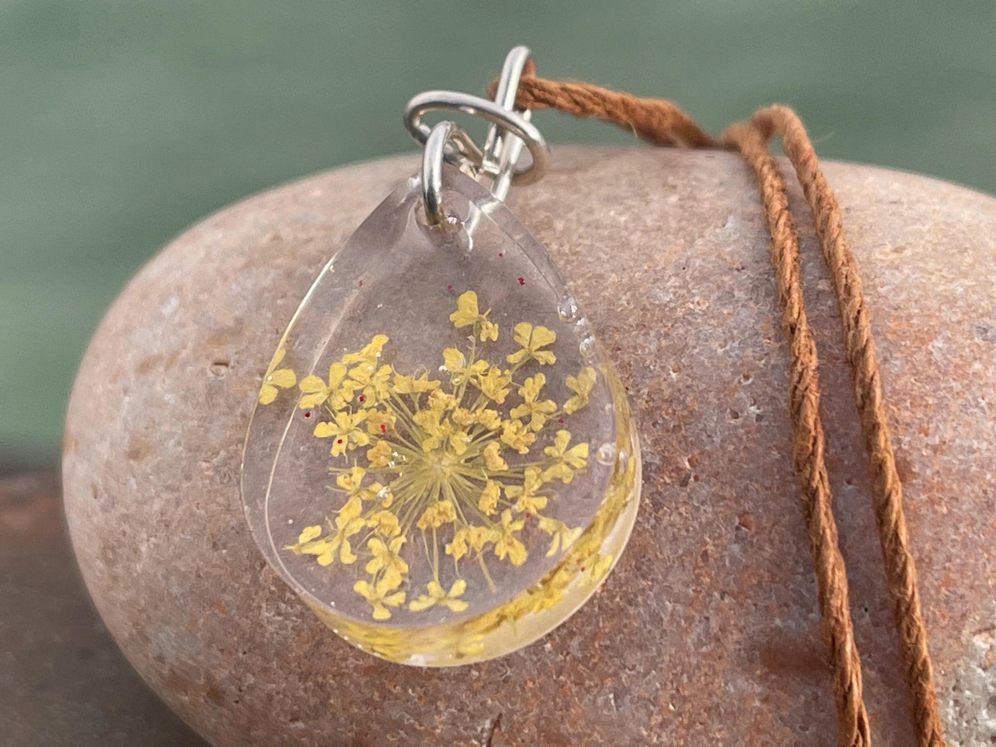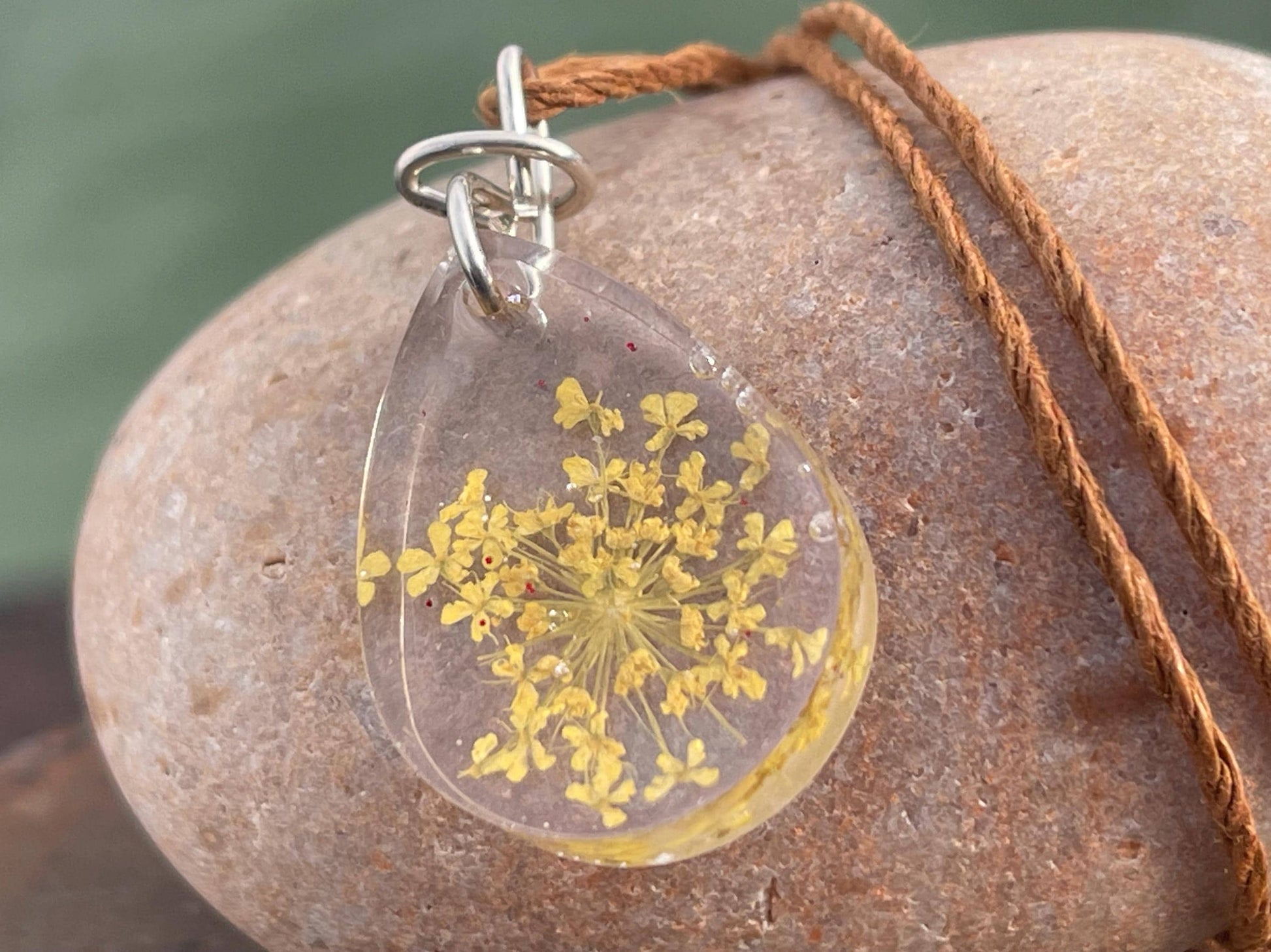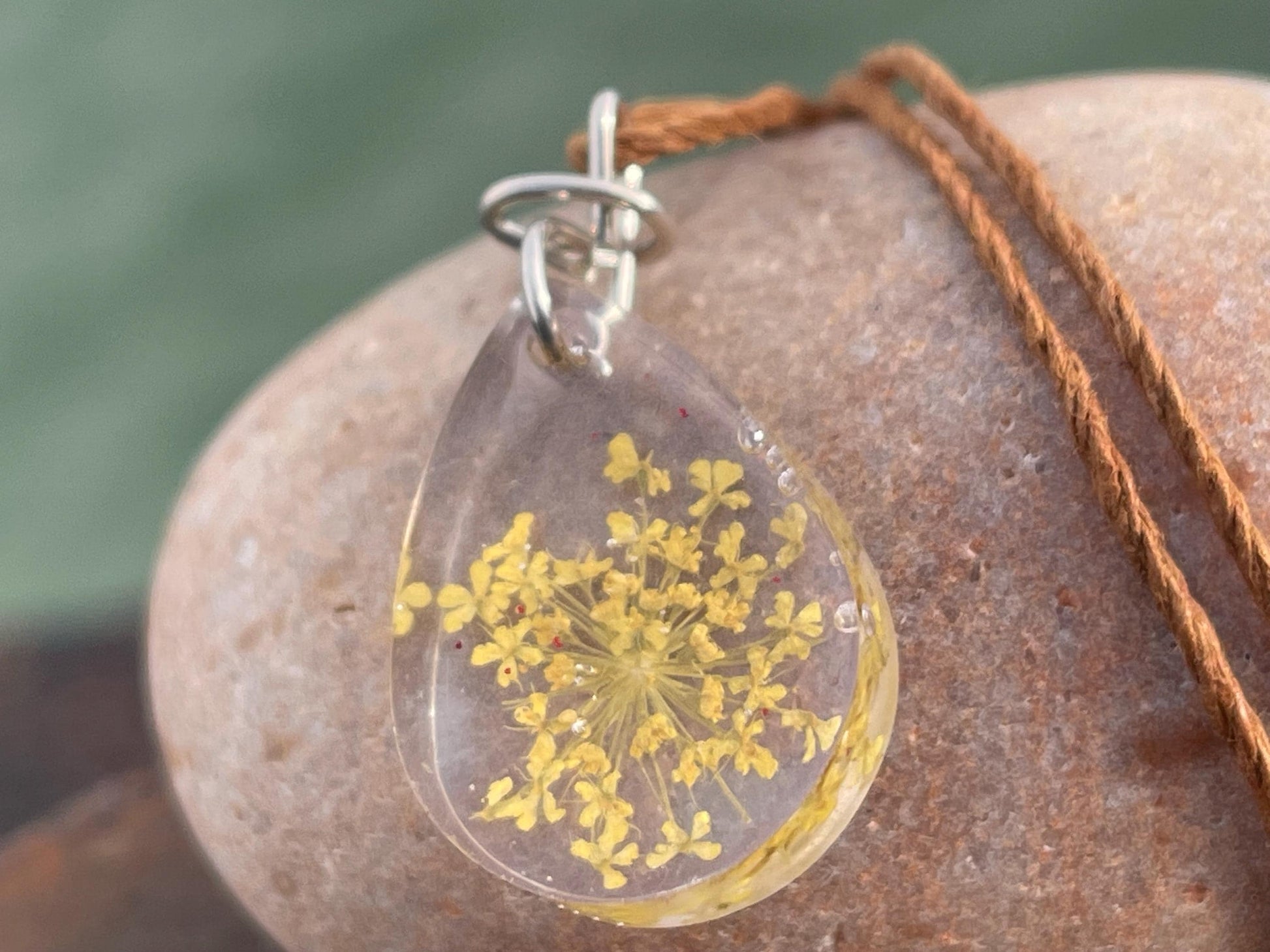 Parsley necklace made with a flower from my garden and recycled sterling silver. It is hung on sustainable hemp, left loose for you to tie at your preferred length.