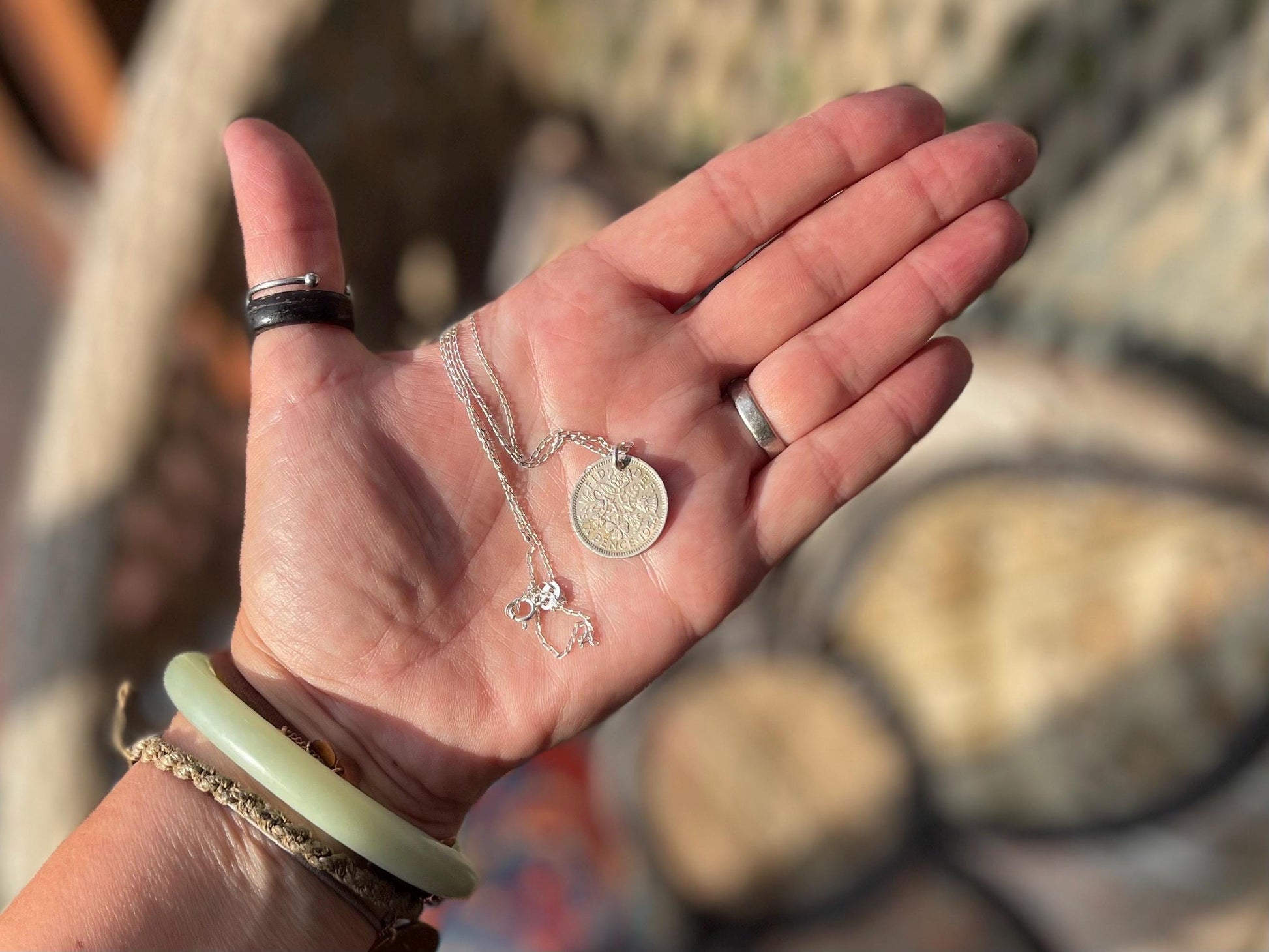 Silver sixpence necklace.