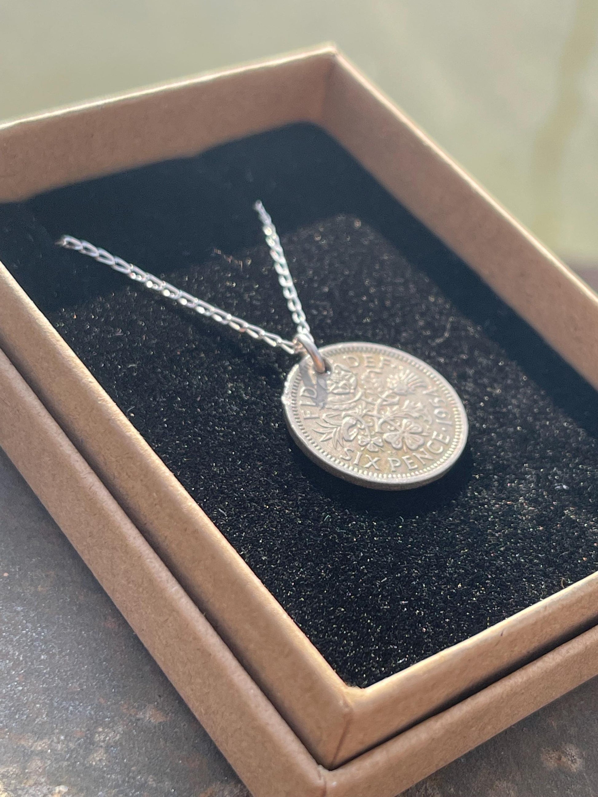 The sixpence has been hung on a recycled sterling silver necklace, 18"/45cm. An eco friendly gift that will arrive in a smart recycled gift box. Various years available (the picture is representative).
