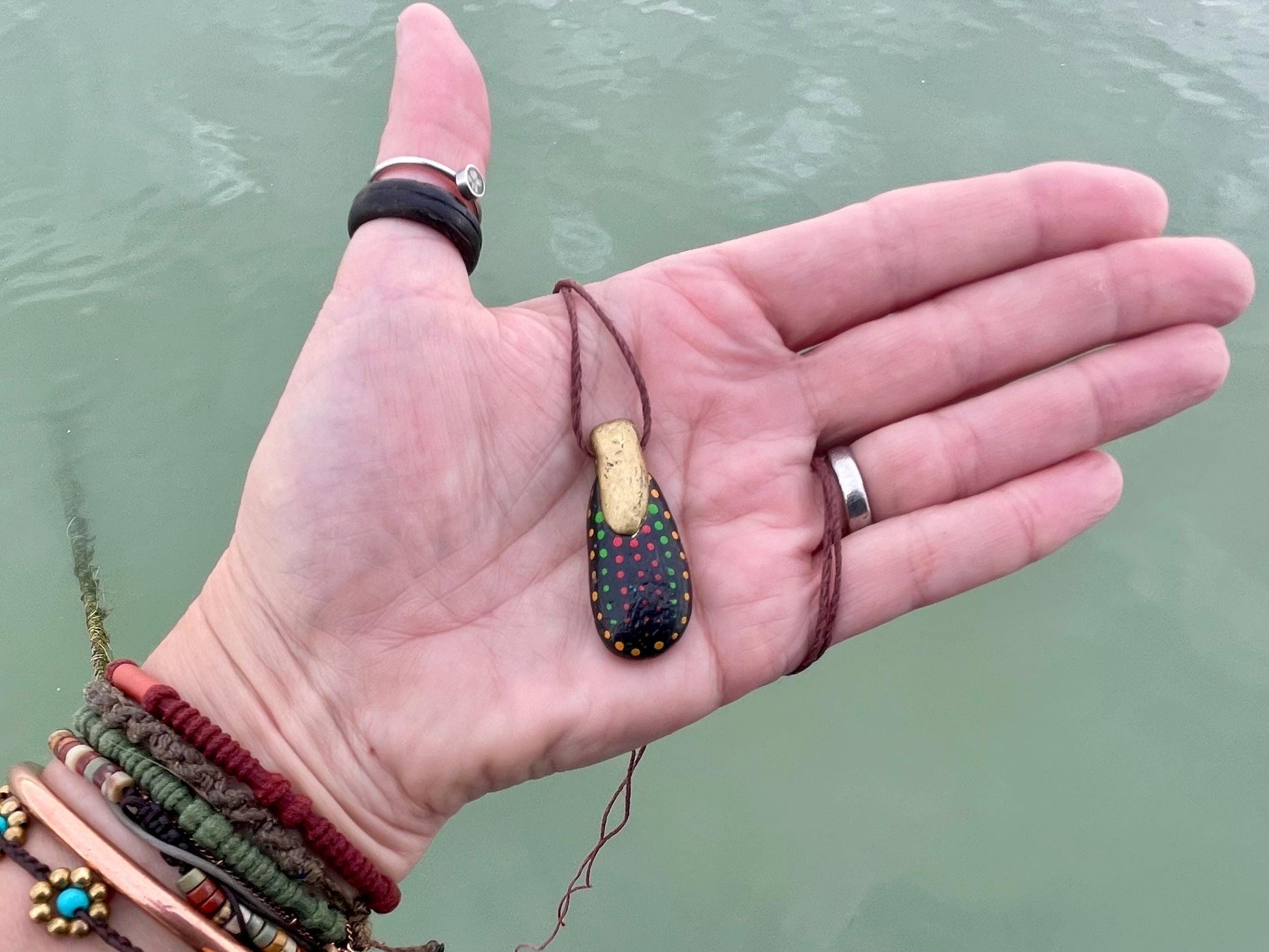 Eco friendly pendant made from a pebble found on the beach, recycled paints and recycled brass. Ethical jewellery made with care for our natural environment.