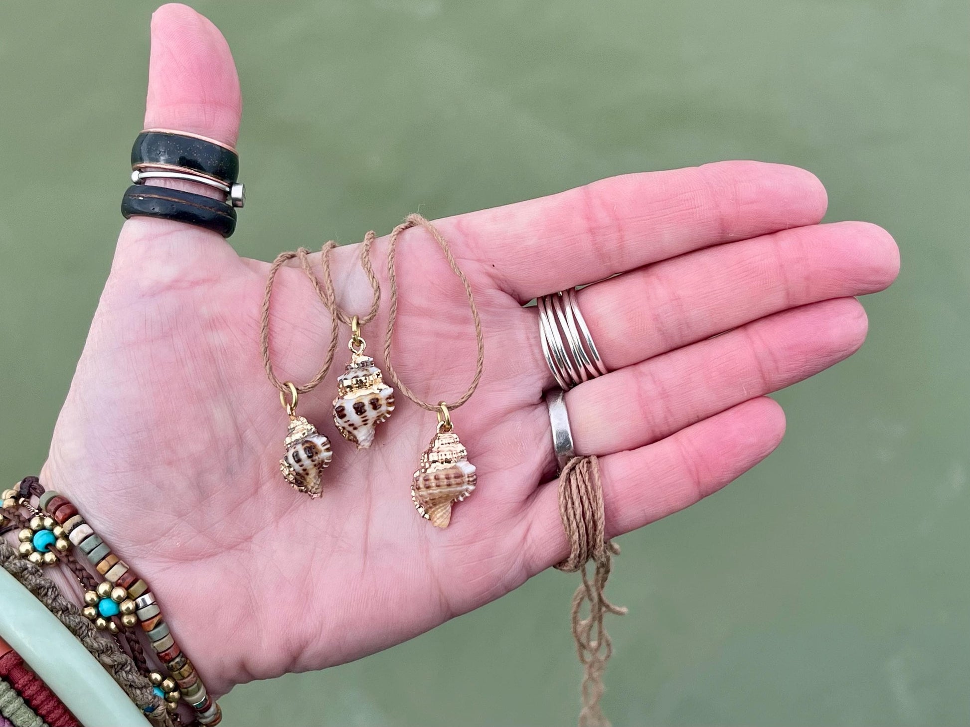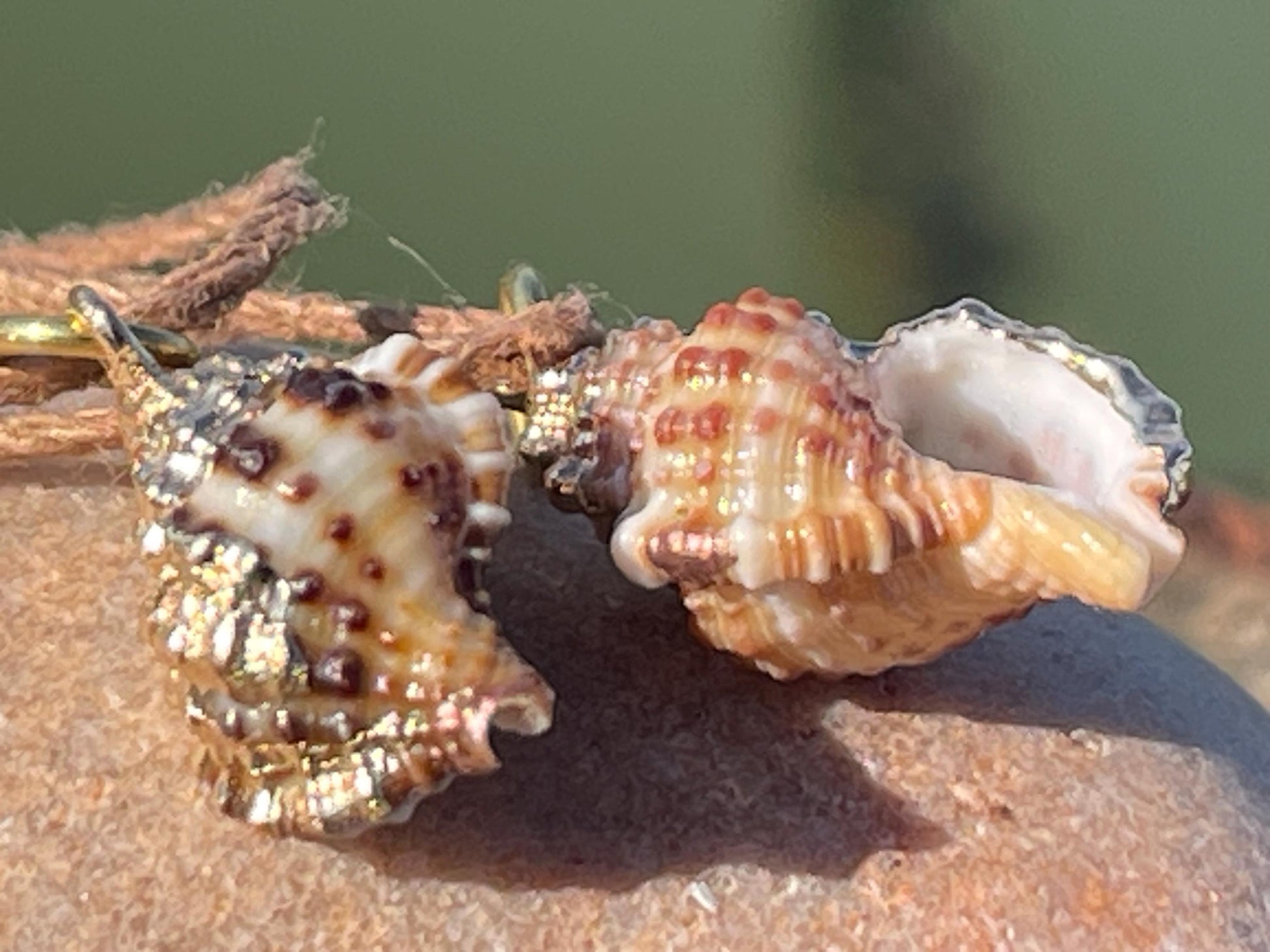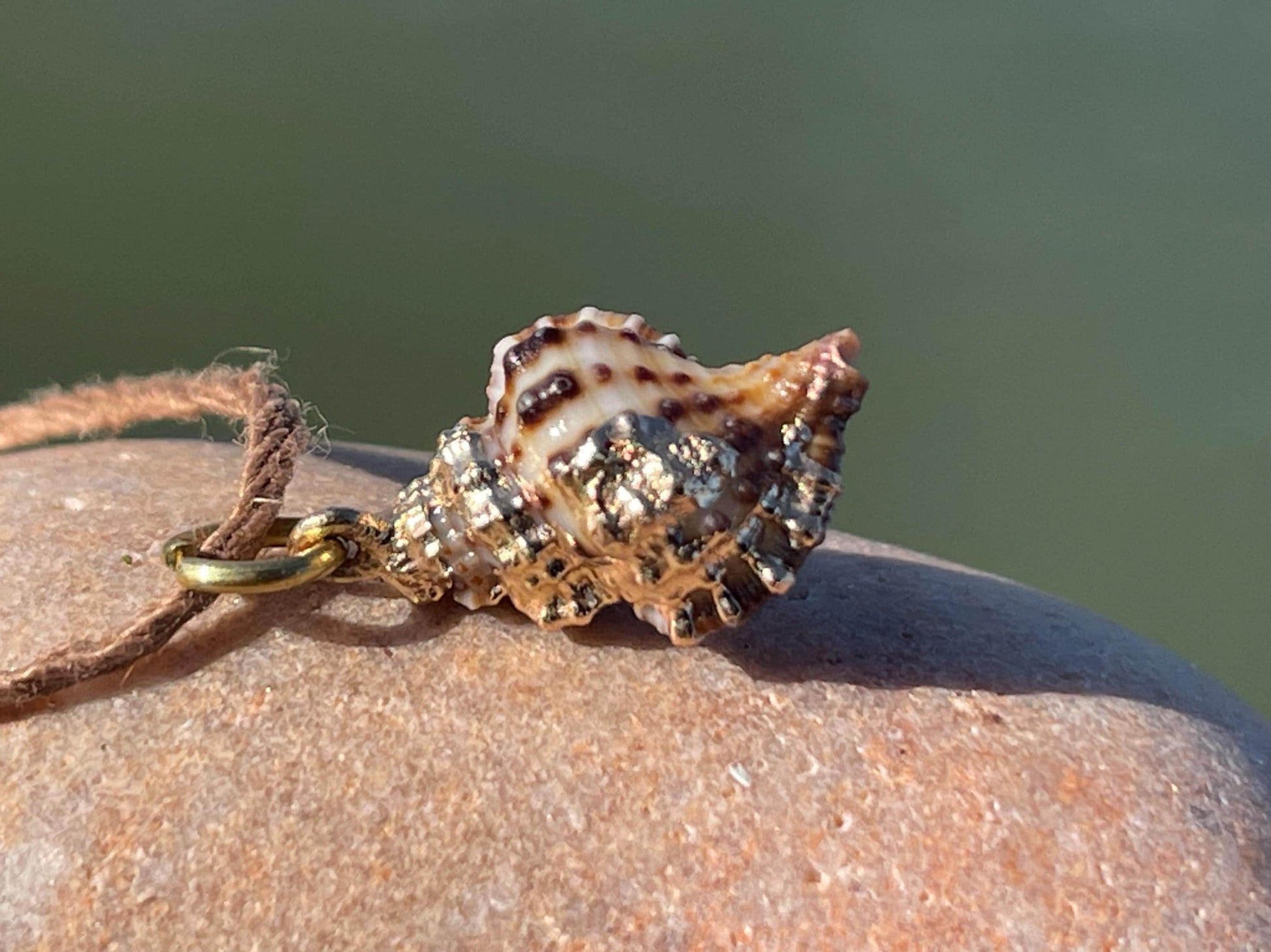Beautiful little shells. Painted in gold and held on recycled brass and sustainable hemp. Tie at your preferred length.