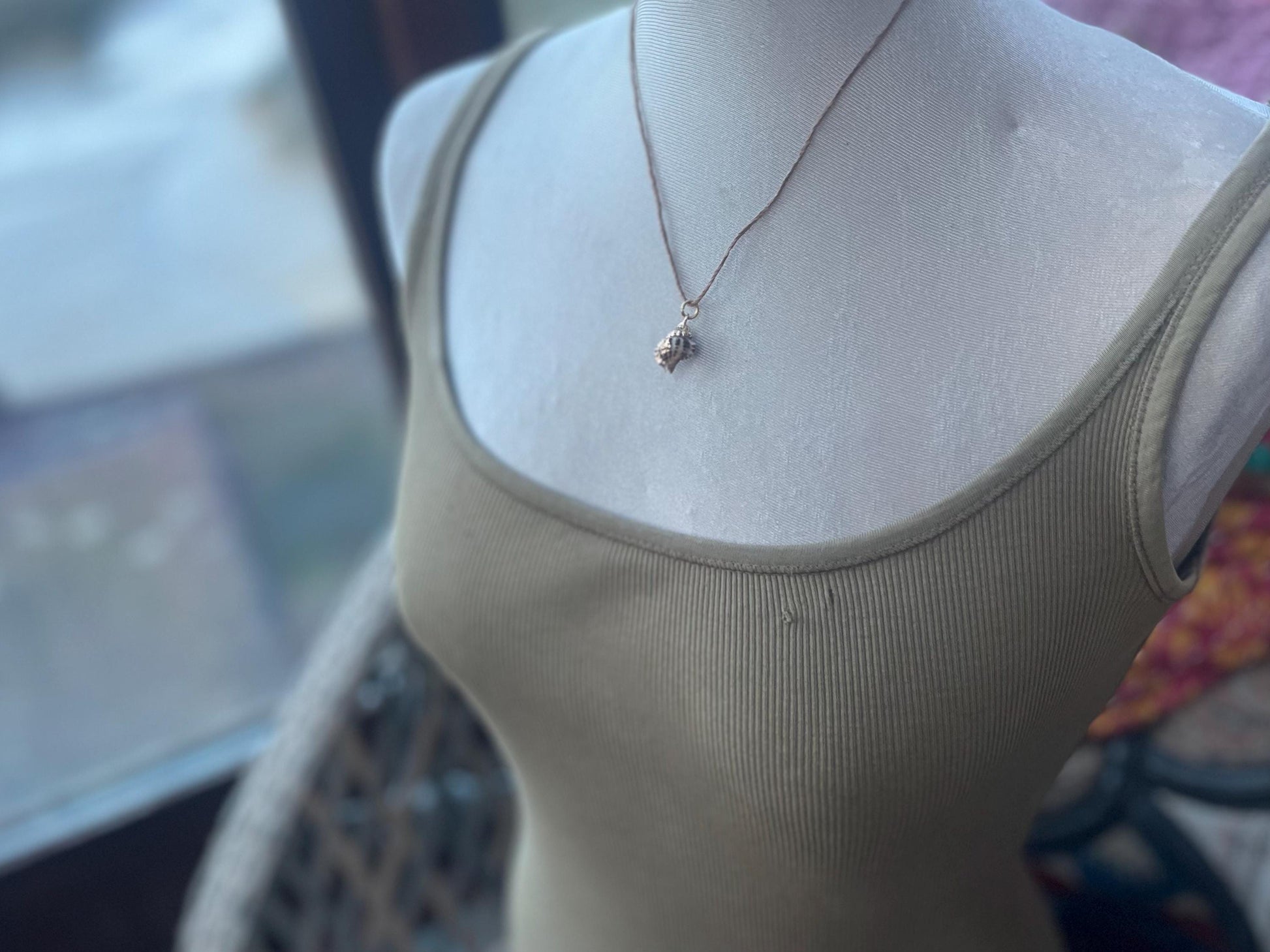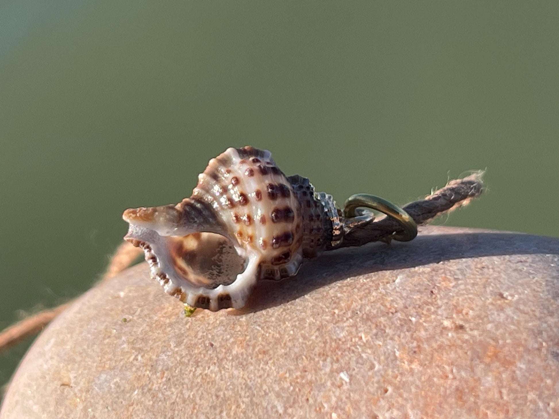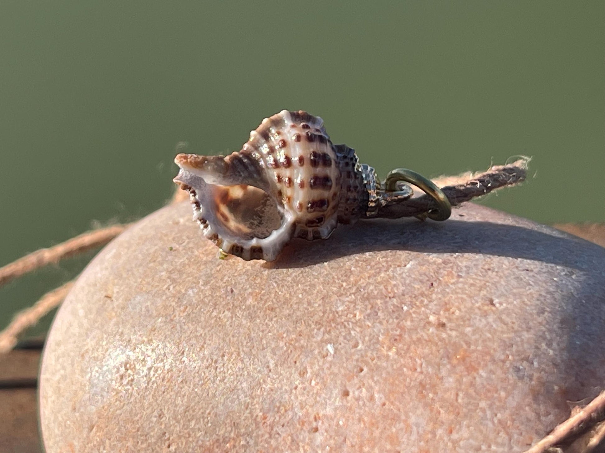 Beautiful little shells. Painted in gold and held on recycled brass and sustainable hemp. Tie at your preferred length.