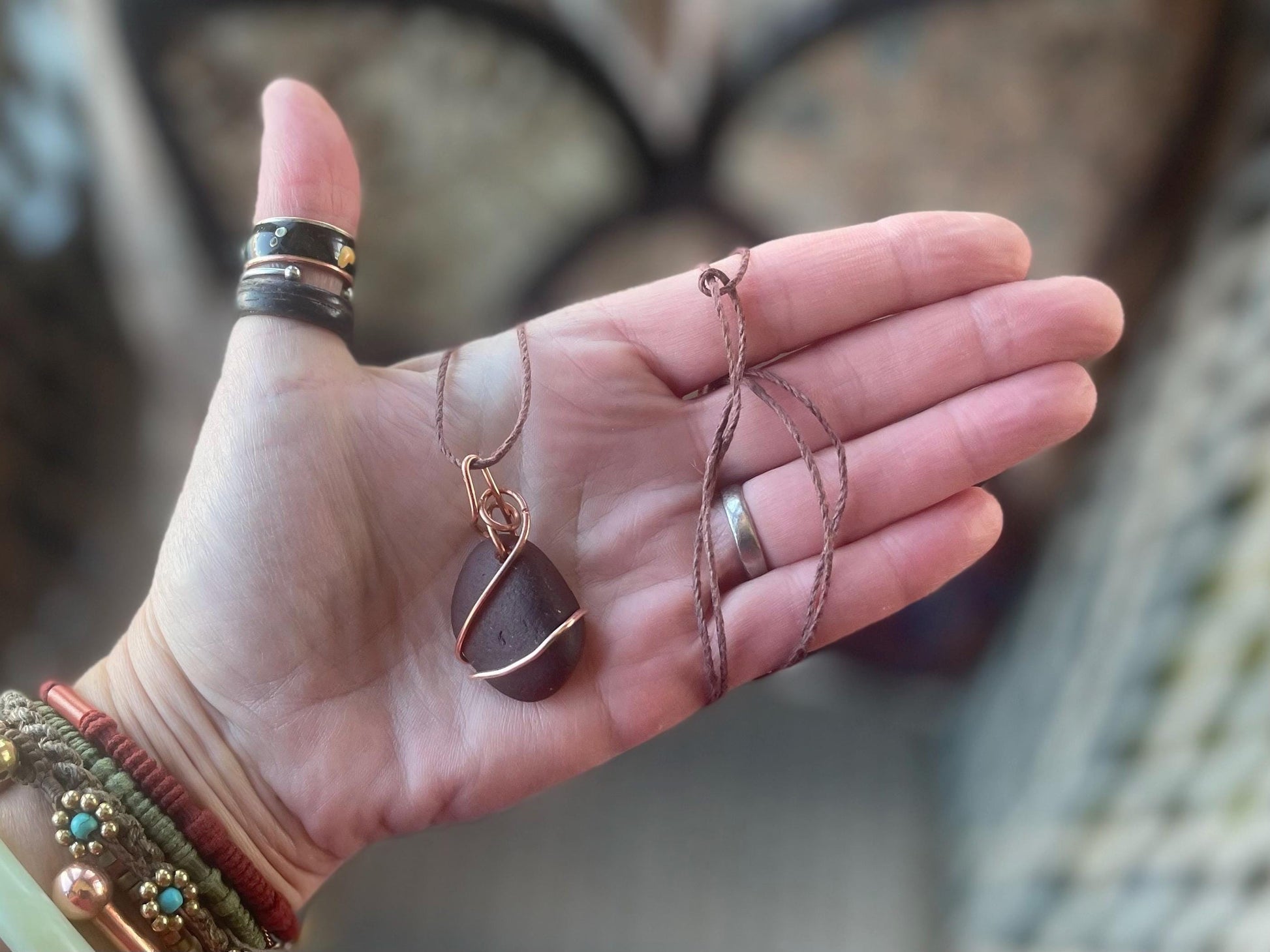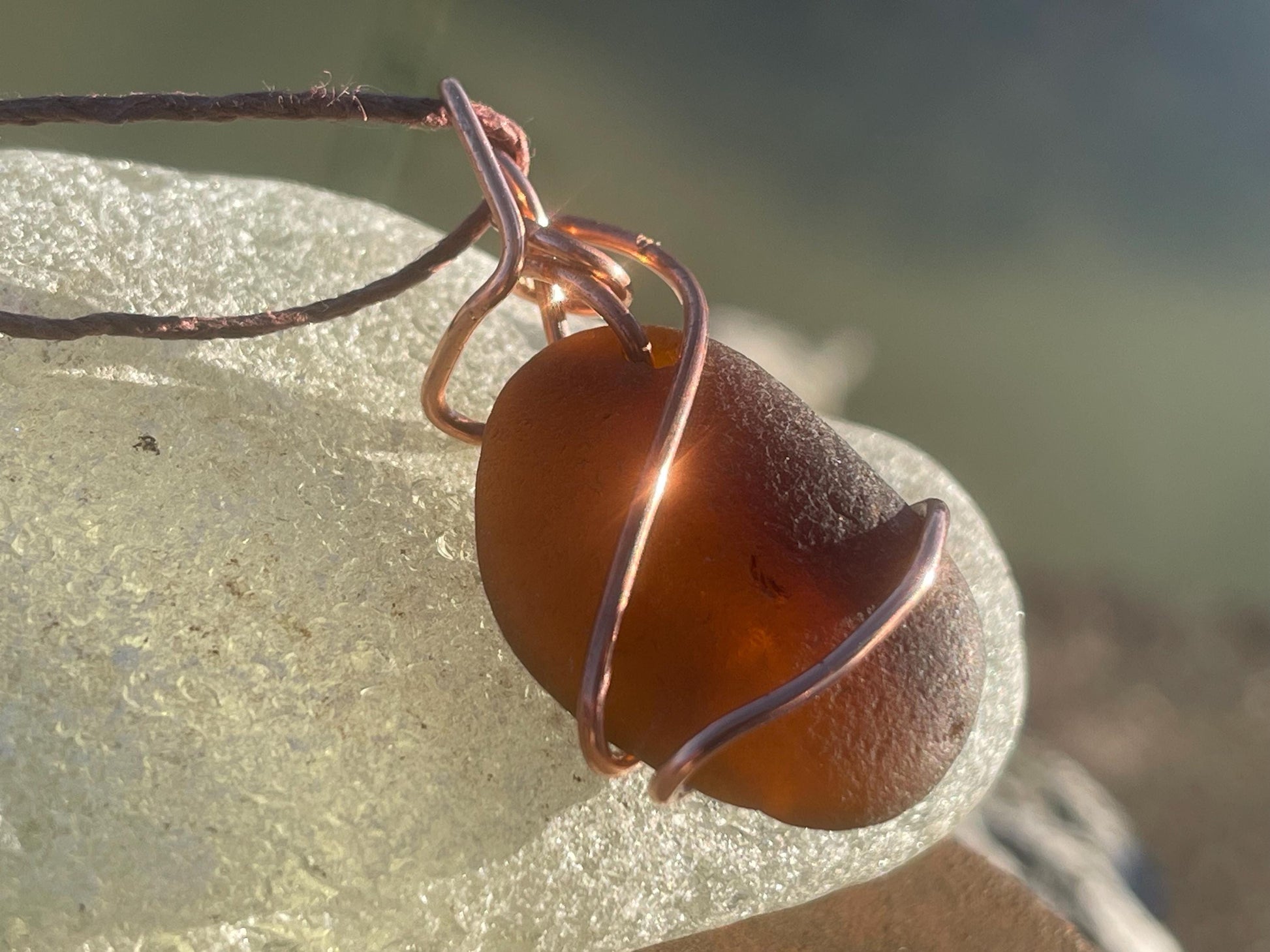 A really beautiful piece of sea glass - reclaimed from the sea and made into something new. I have wrapped it in recycled copper stripped from waste electrical cables.