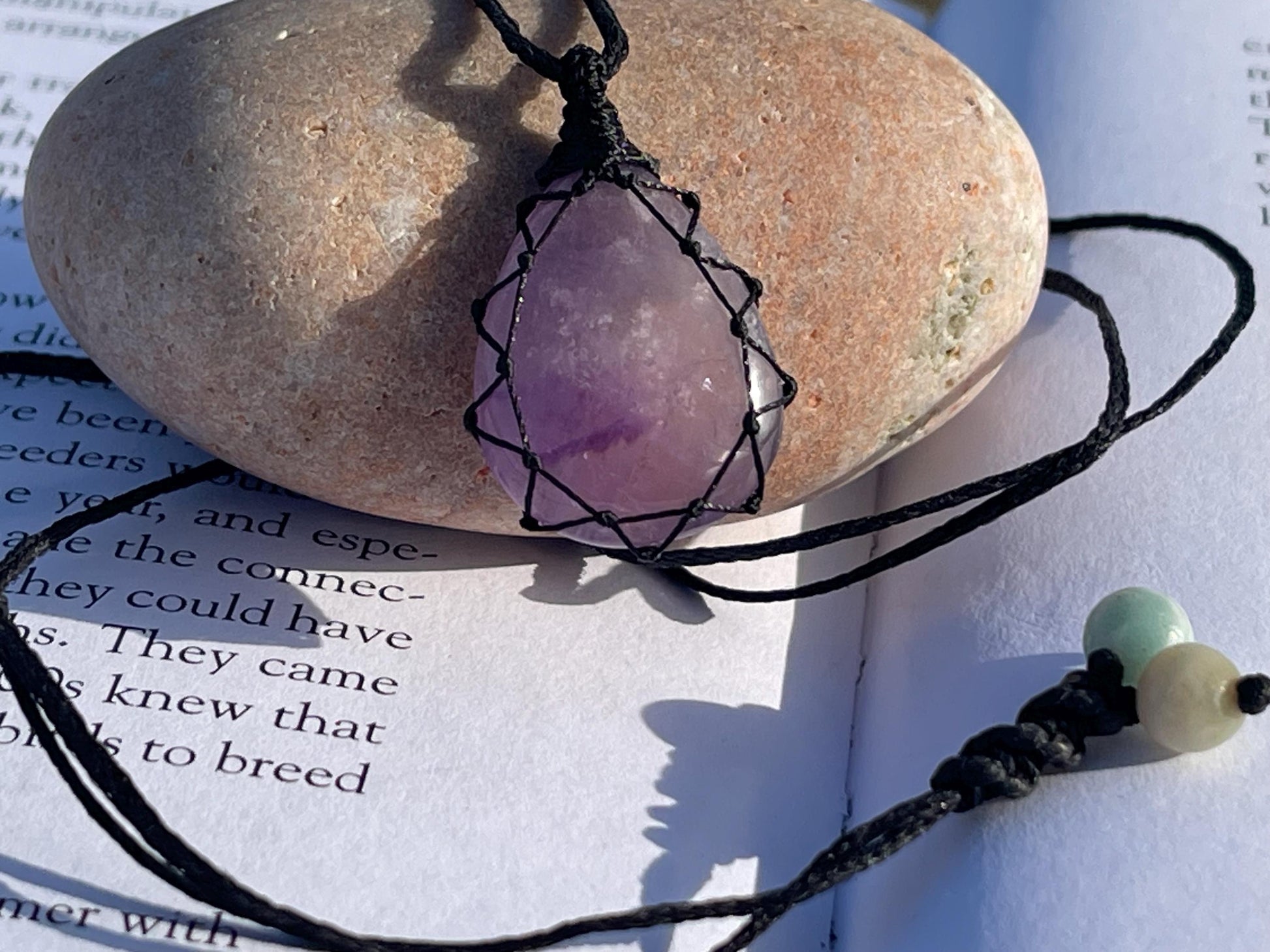 This is a beautiful and unique amethyst crystal necklace, macrame wrapped and held on a light adjustable cord.